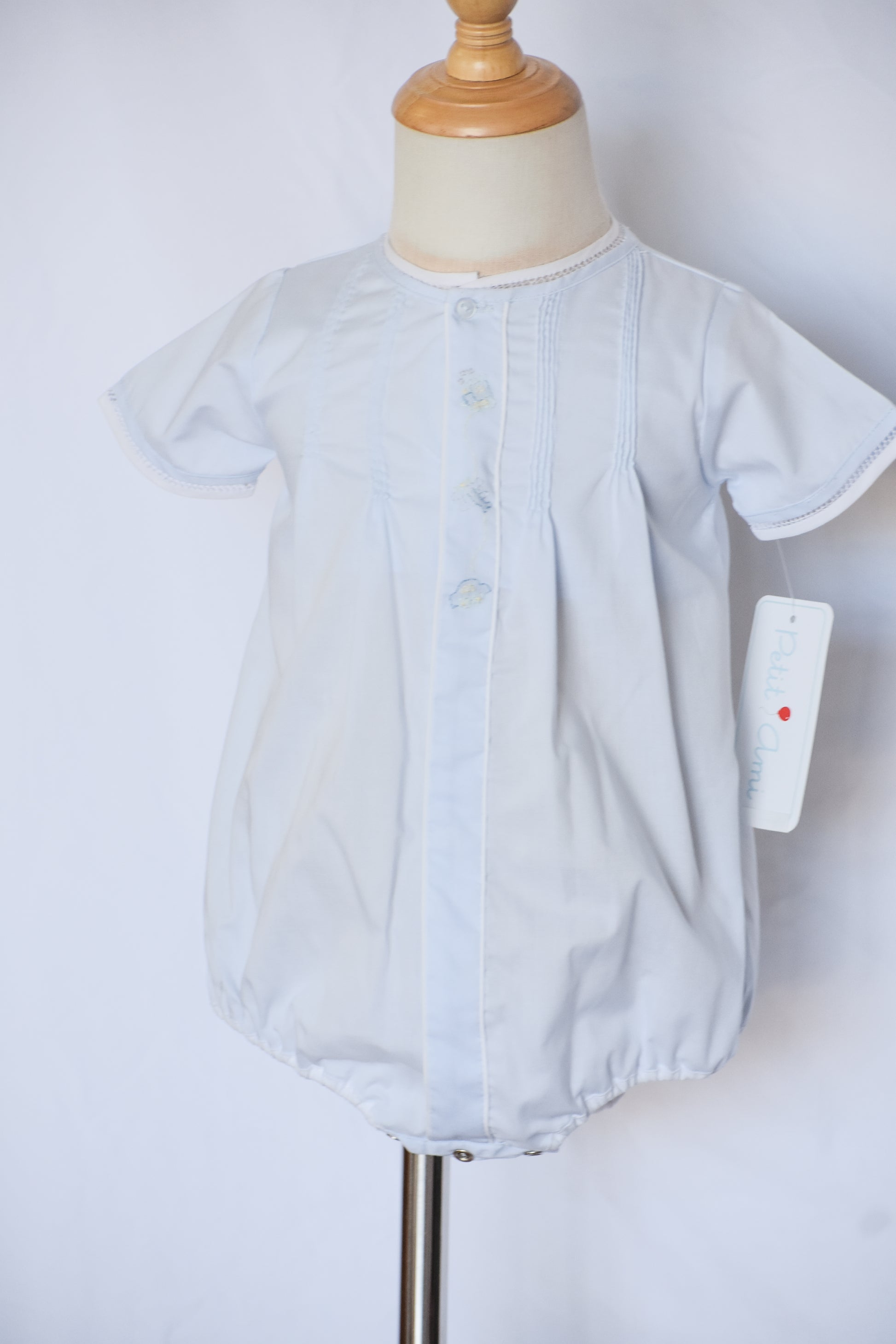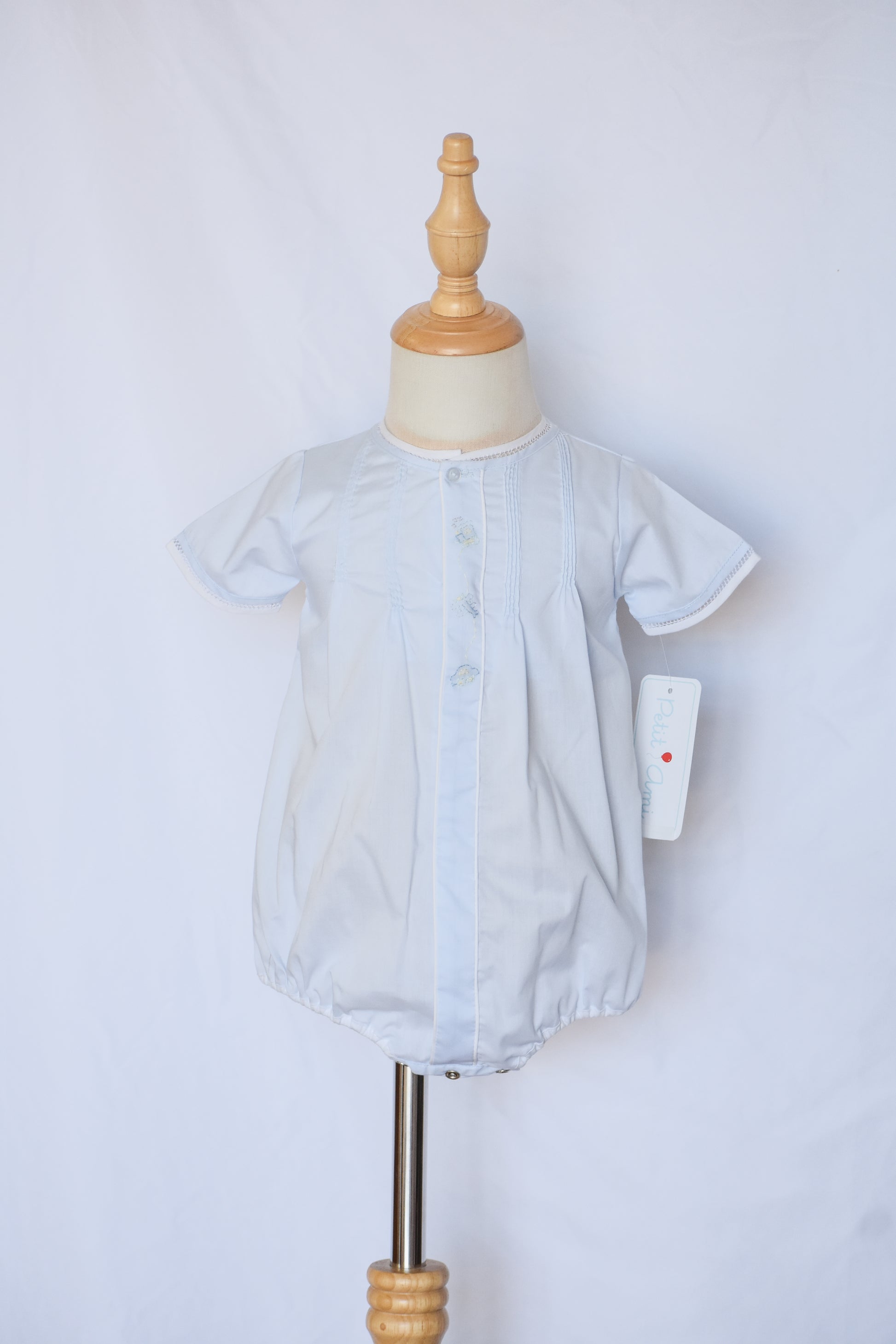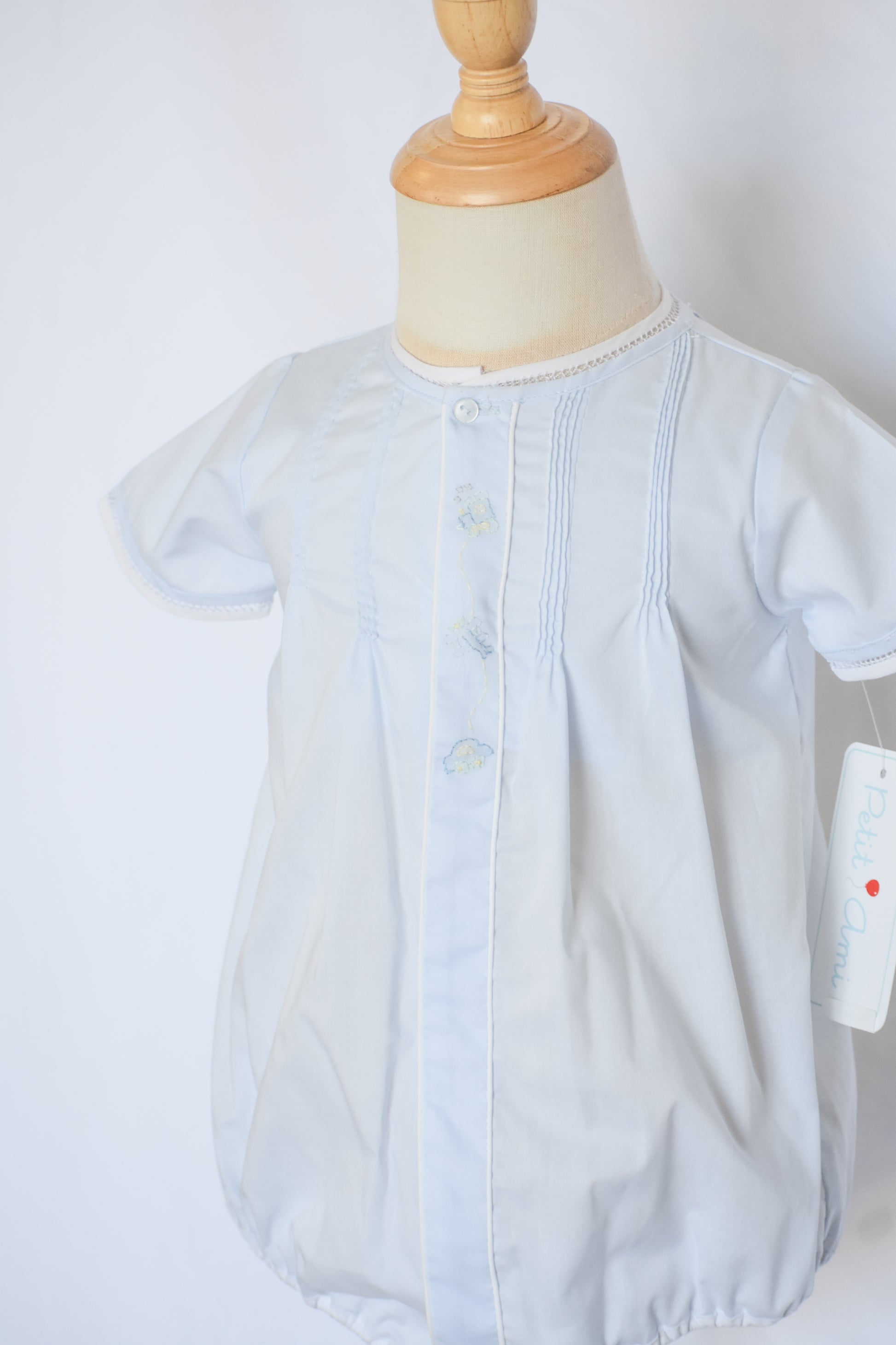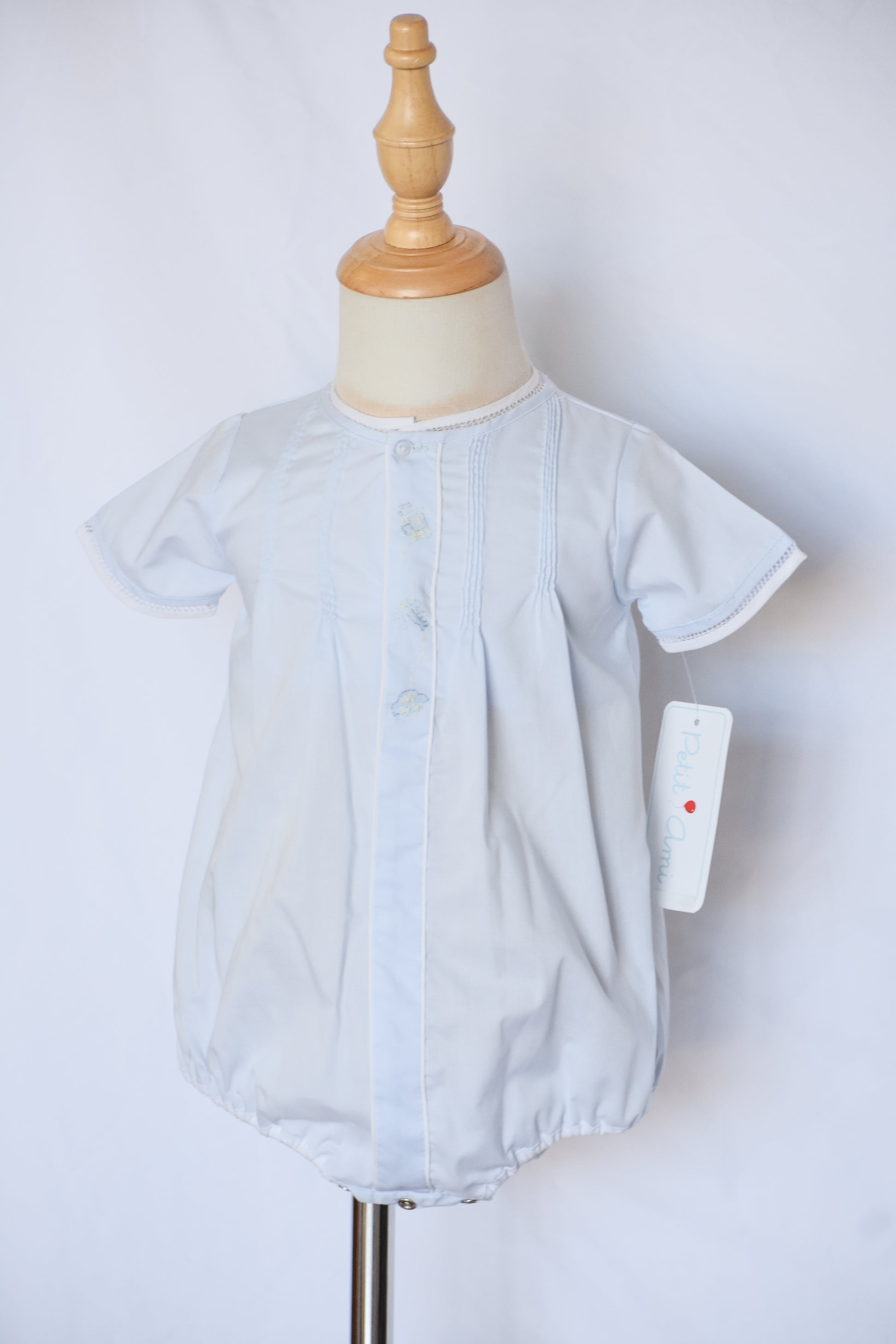 Whisk your little one away on imaginary journeys with this charming heirloom bubble. Crafted in soft baby blue, it features delightful embroidered details of trains, planes, and cars that spark wonder and adventure. Perfect for special occasions or everyday wear, this timeless piece is designed to be treasured and passed down through generations. The classic bubble silhouette offers comfort and style, making it an heirloom-quality addition to any baby boy's wardrobe.