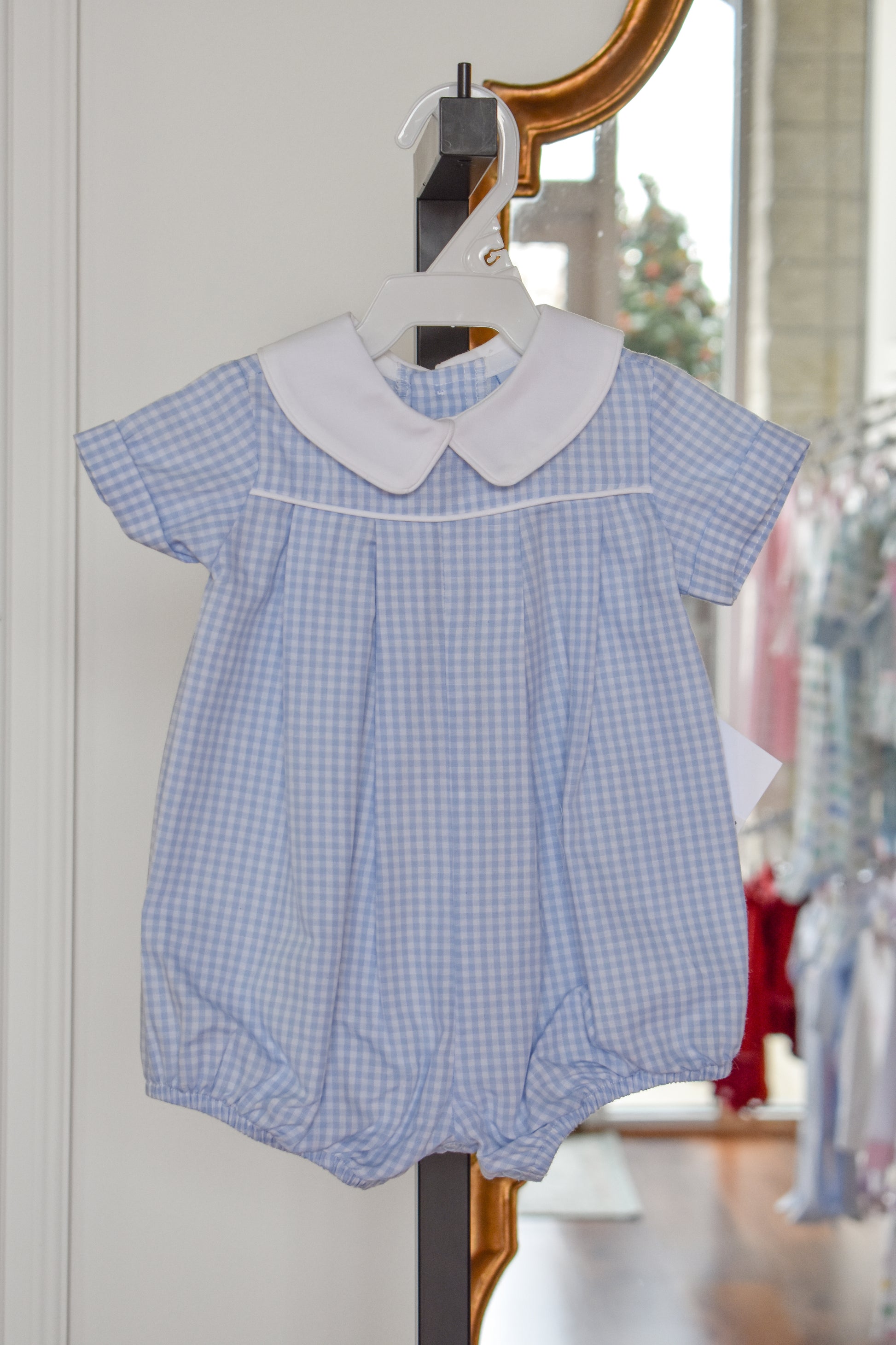 This charming bubble dress features a soft light blue check pattern that's perfect for special occasions. The crisp white collar adds a classic, polished touch that makes it ideal for dressy events. The bubble silhouette creates a playful, comfortable fit that lets little ones move freely while looking absolutely adorable. A timeless piece that transitions beautifully from celebrations to family gatherings.