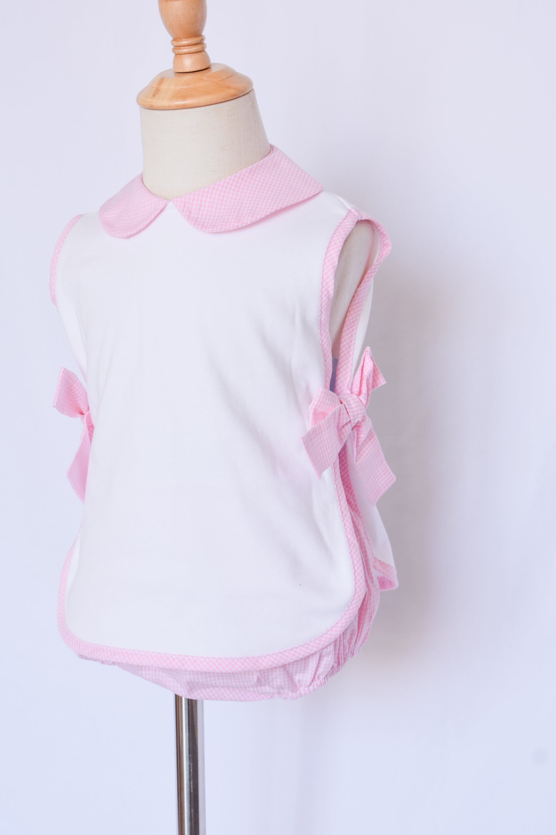 This precious diaper set combines timeless charm with practical comfort for your little one. The soft knit white top features an adorable bow tab detail, paired with a coordinating pink mini gingham diaper cover and matching peter pan collar. Perfect for special occasions or everyday wear, this set brings together classic styling with gentle fabrics that feel wonderful against delicate skin. A sweet addition to any baby girl's wardrobe.