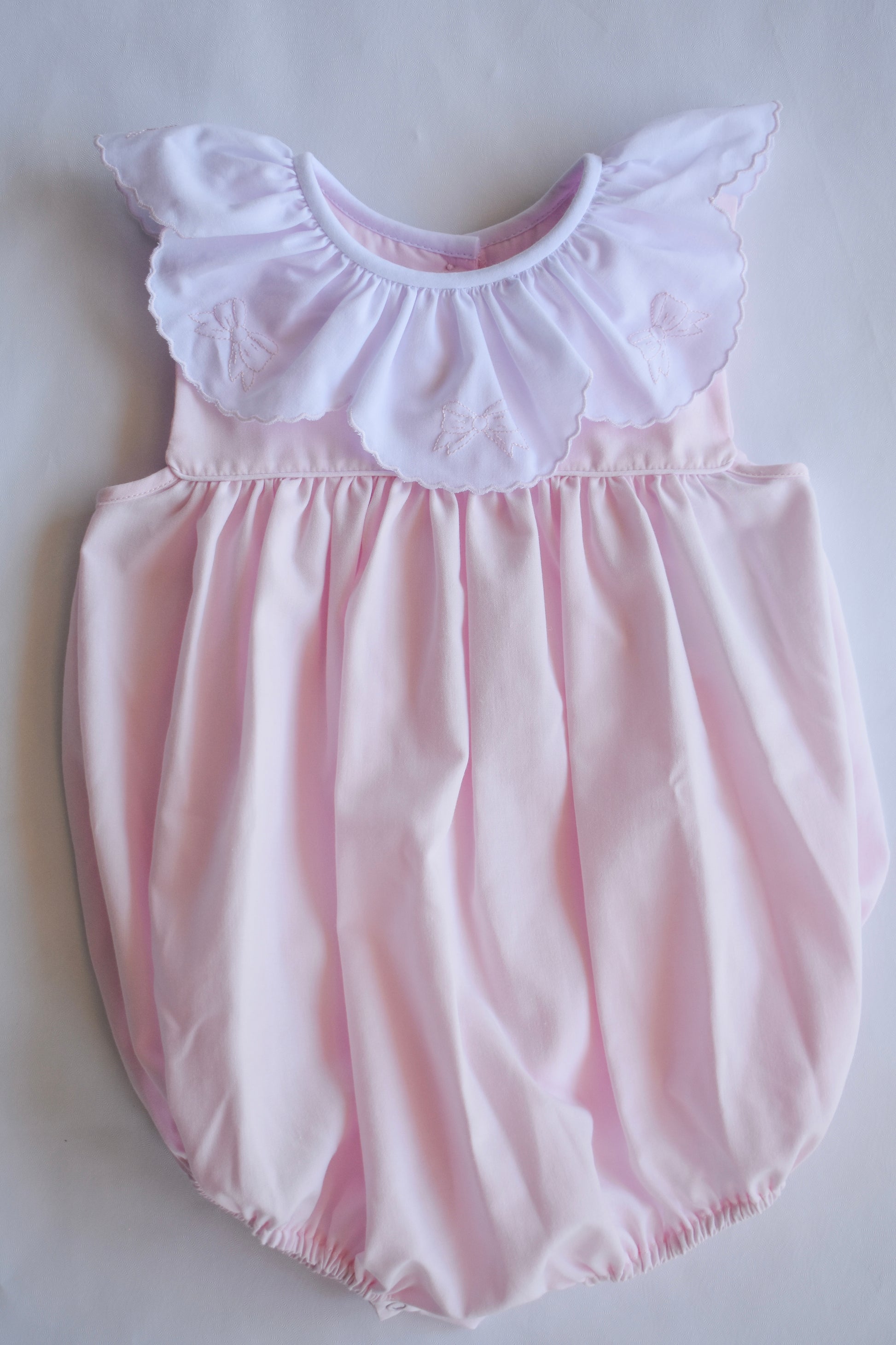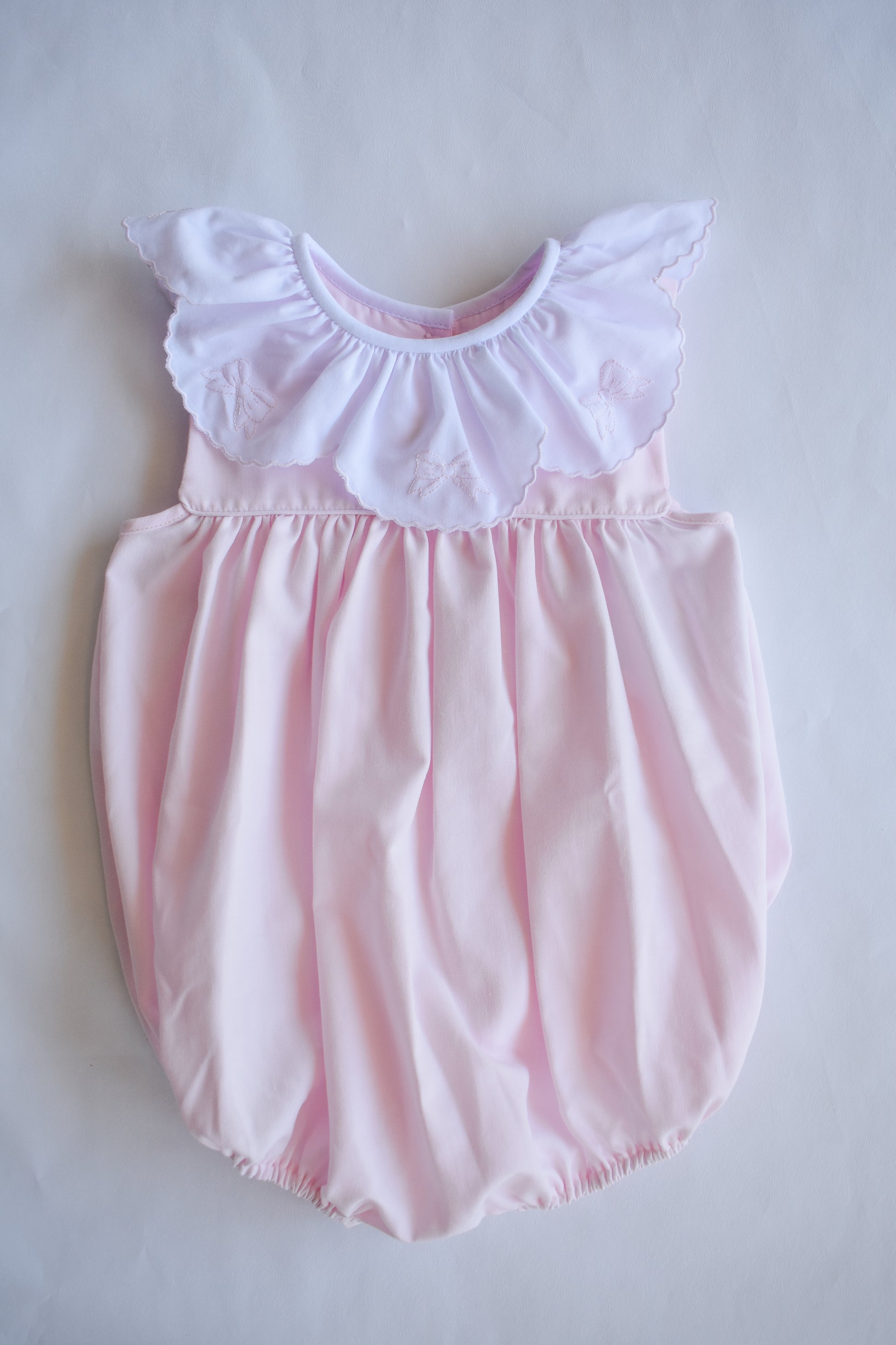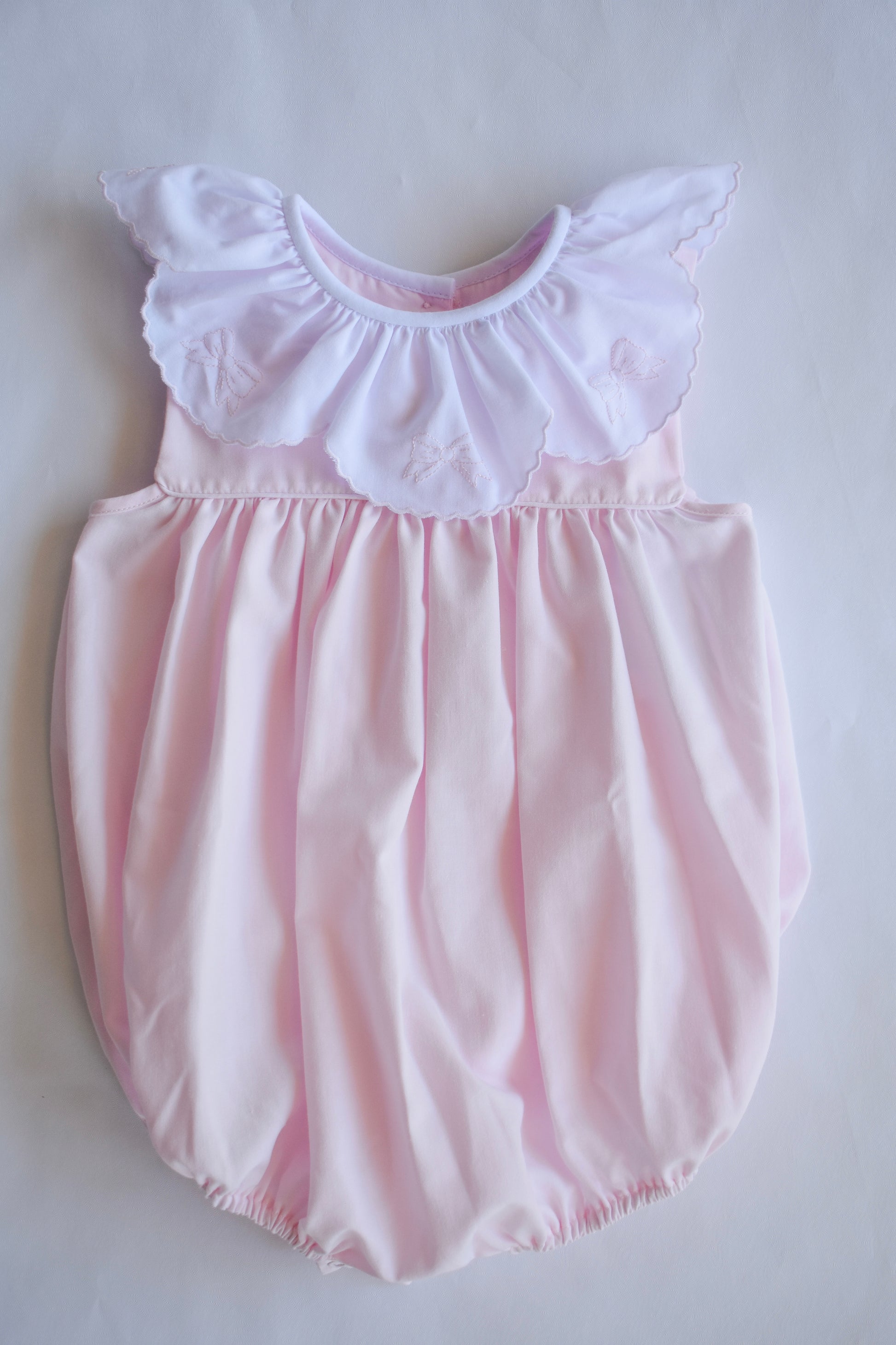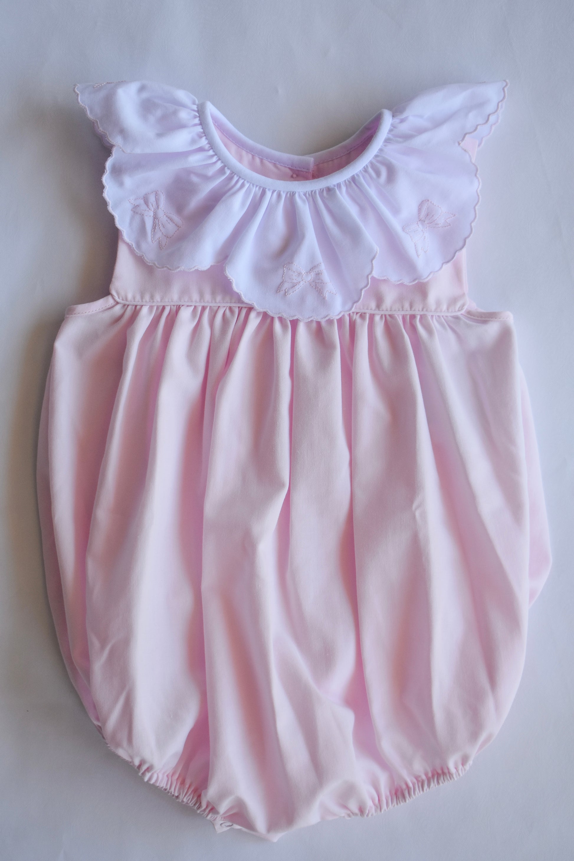 Wrap your little one in sweetness with our Bow-tiful Ribbon Bubble! This adorable pink bubble features delicate ruffles and charming ribbon bows.