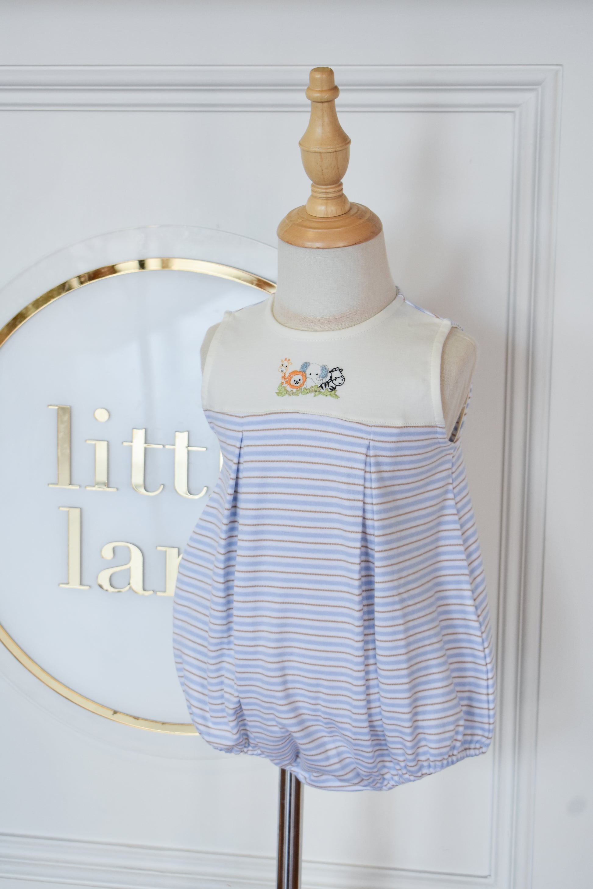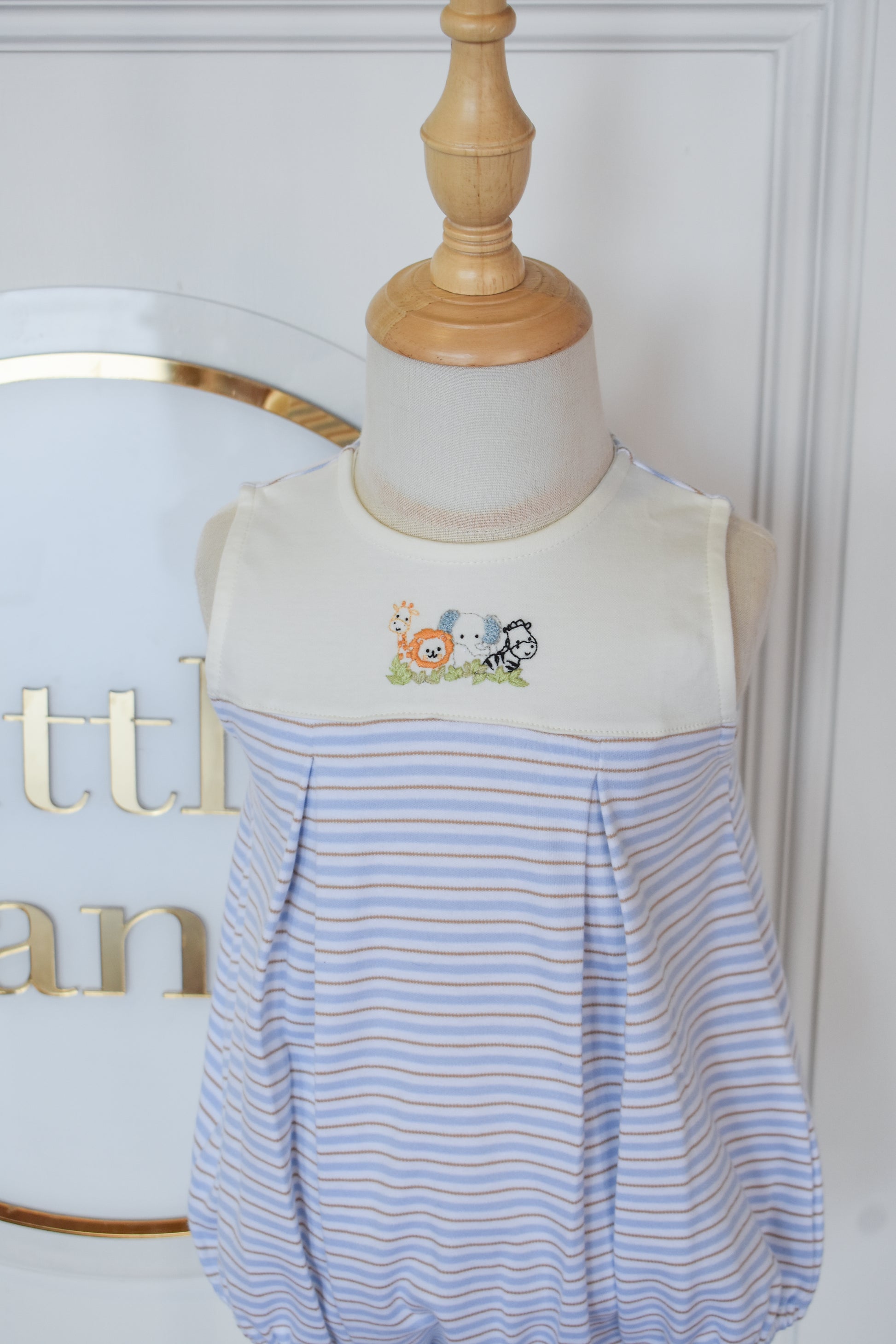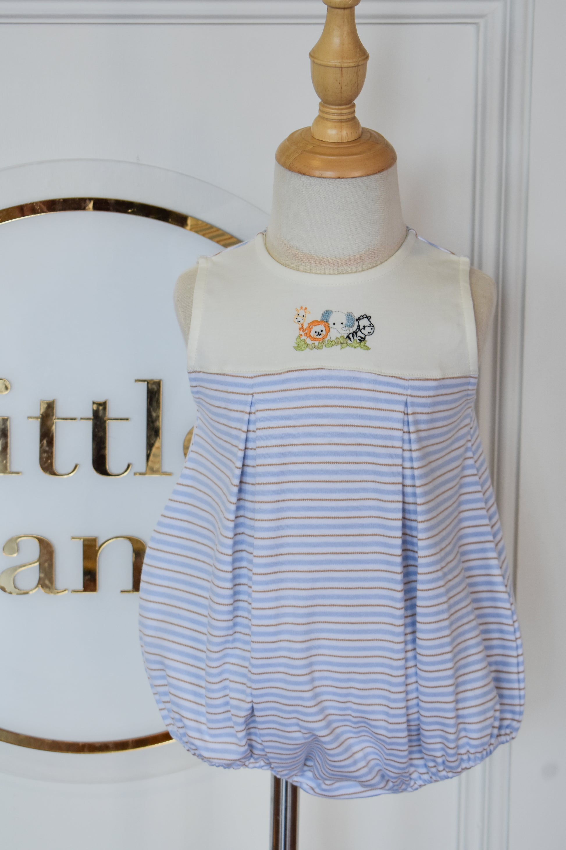 Adorable zoo-themed romper perfect for little explorers! This sleeveless style features charming light blue, tan, and beige stripes with delightful zoo embroidery details. The pleated design adds a playful touch while keeping your boy comfortable and cool. Ideal for warm weather playdates, family outings, or casual everyday wear. A sweet addition to any toddler's wardrobe that celebrates curiosity and fun.
