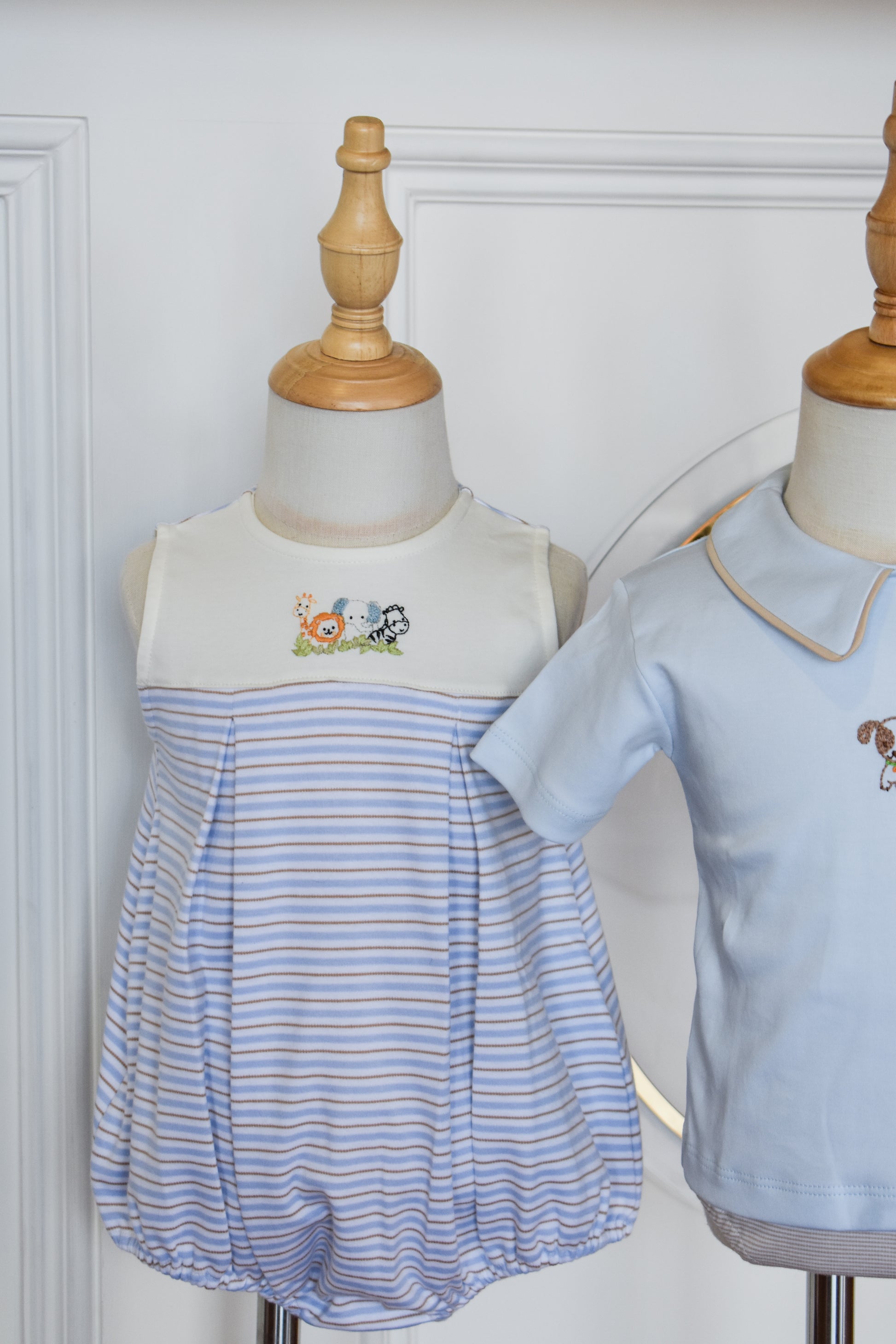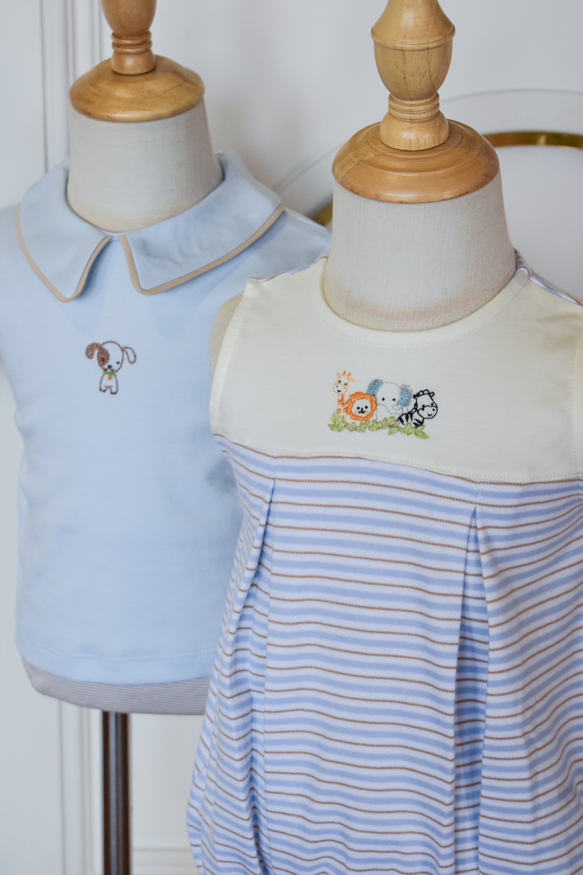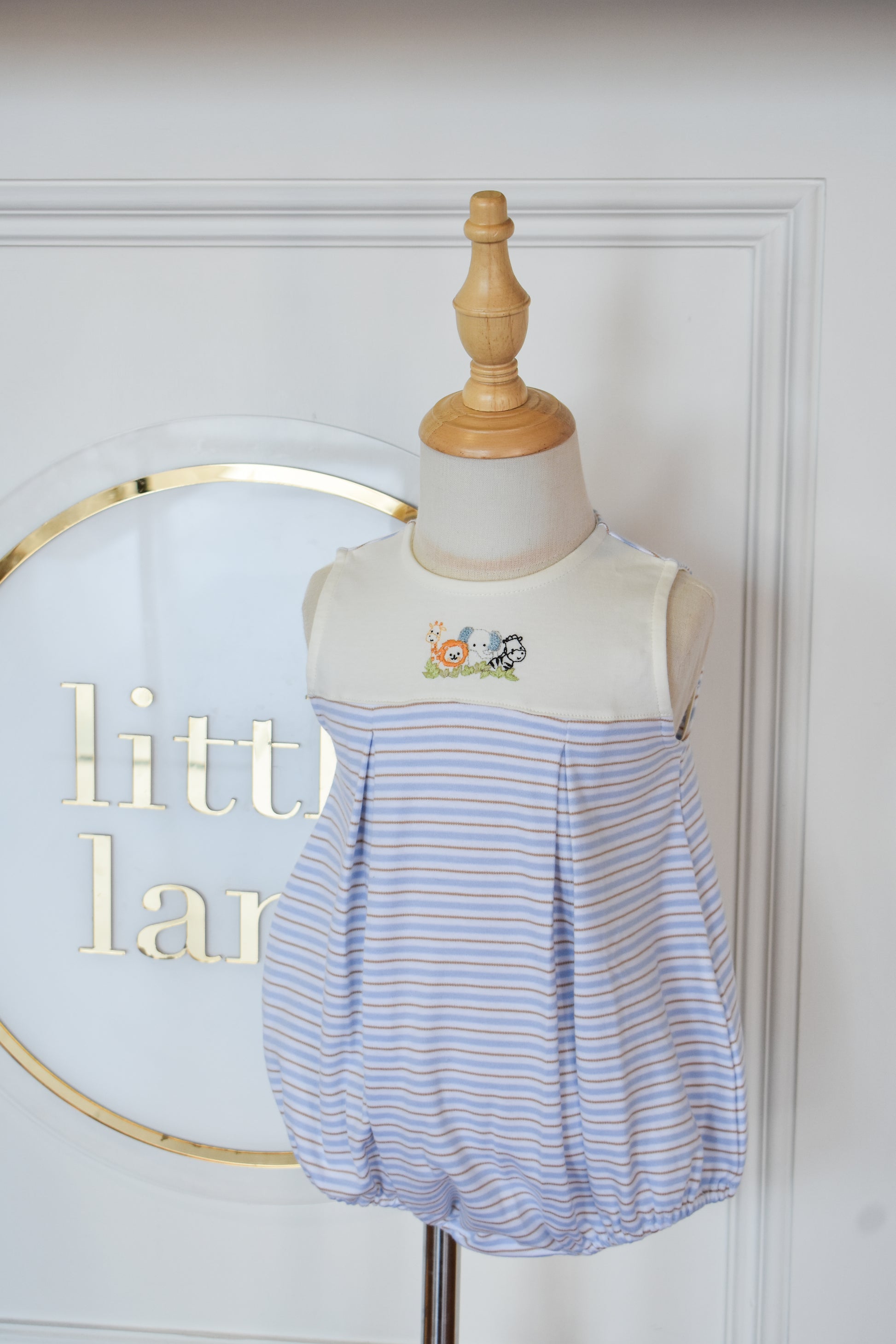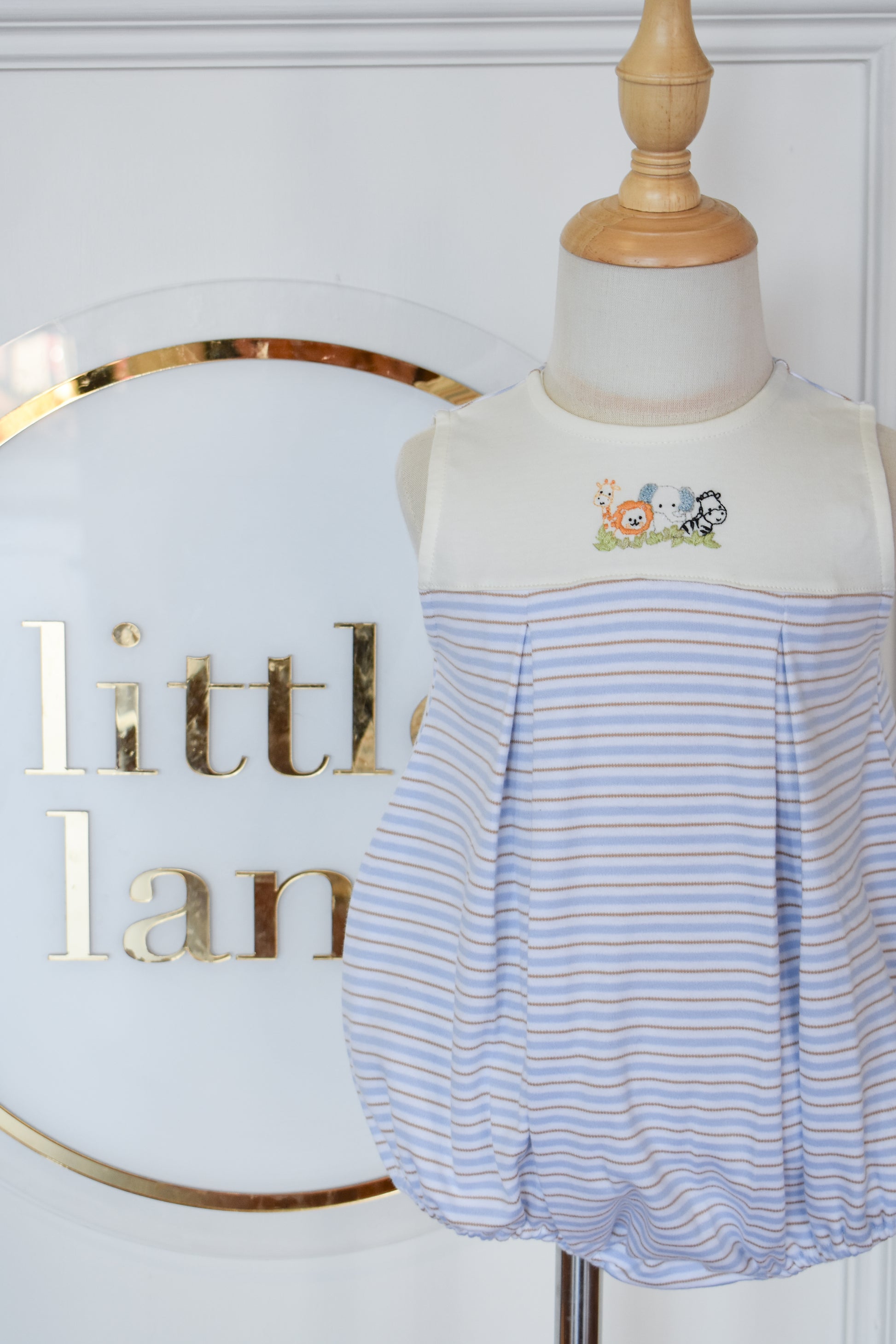 Adorable zoo-themed romper perfect for little explorers! This sleeveless style features charming light blue, tan, and beige stripes with delightful zoo embroidery details. The pleated design adds a playful touch while keeping your boy comfortable and cool. Ideal for warm weather playdates, family outings, or casual everyday wear. A sweet addition to any toddler's wardrobe that celebrates curiosity and fun.