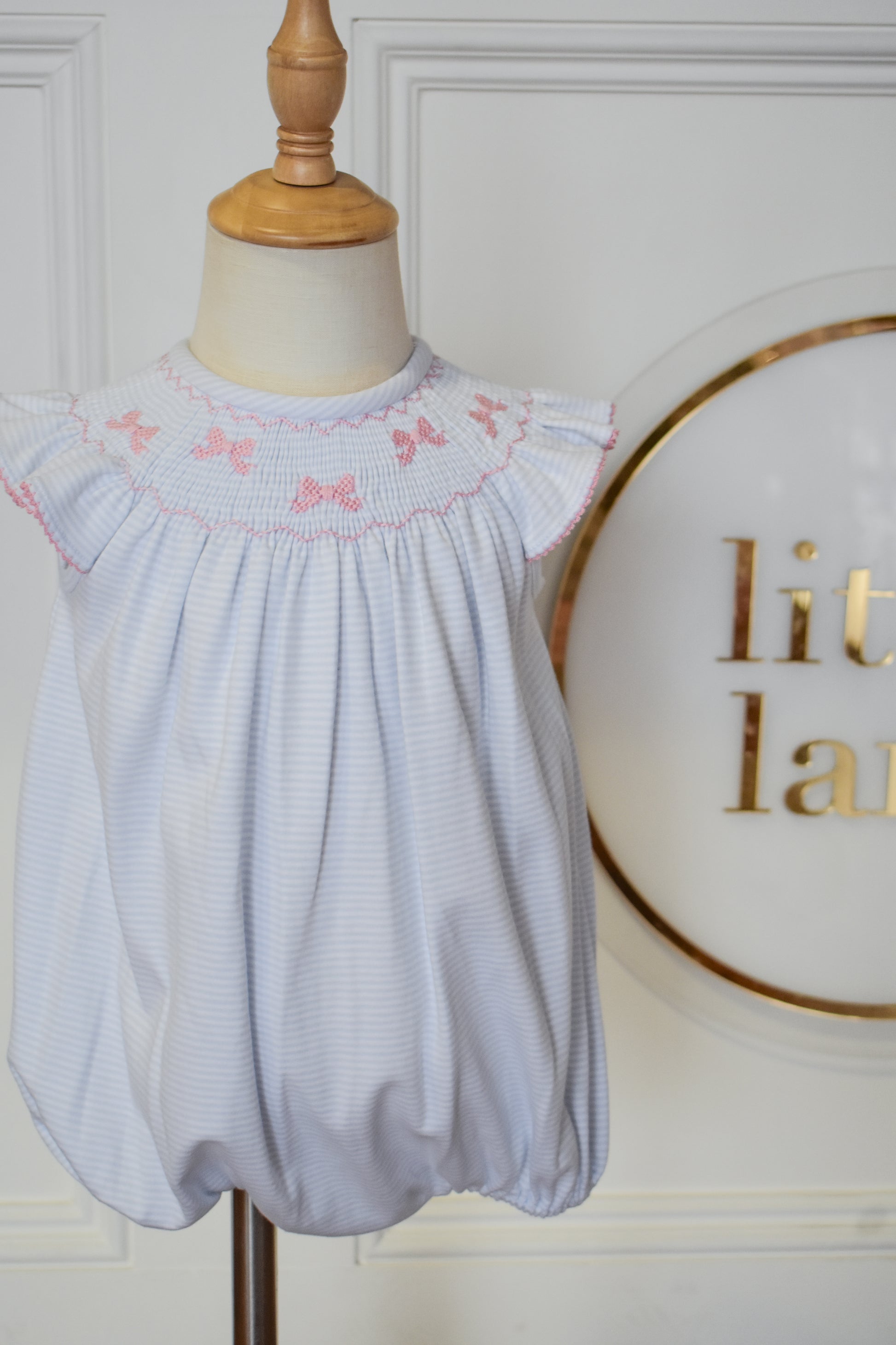 Eloise is a charming bubble-knit dress that captures timeless elegance with modern details. Crafted in soft light blue, this bishop-style dress features delicate smocking at the bodice and a precious pink bow accent that adds a touch of whimsy. The bubble knit creates a playful silhouette perfect for special occasions or everyday wear. Designed with comfort in mind, this piece celebrates classic children's fashion with a contemporary twist.