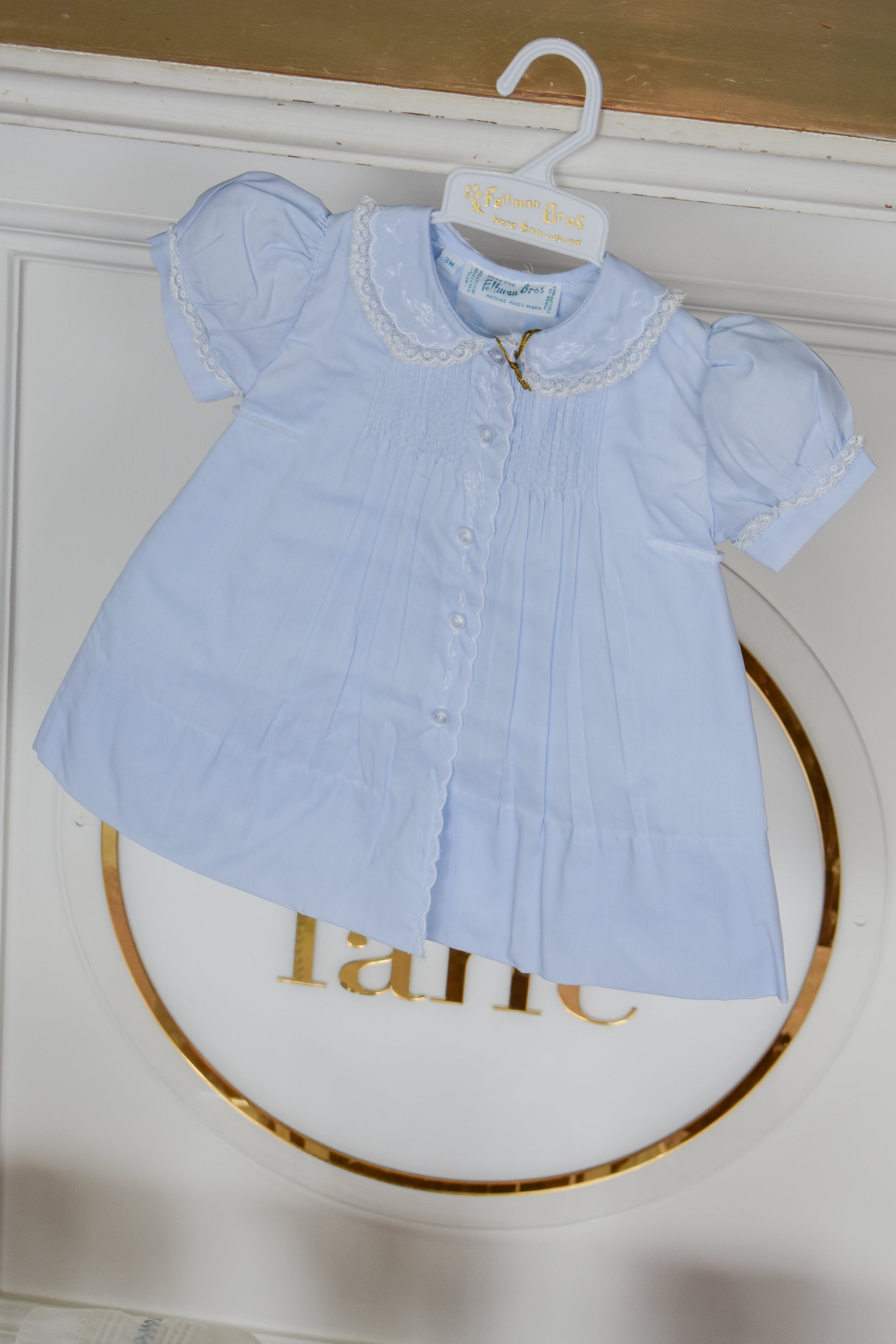 This delicate baby blue slip dress features charming scalloped trim and intricate lace detailing, creating an heirloom-quality piece perfect for your little girl. Soft and lightweight, it offers gentle comfort while capturing timeless elegance for special occasions or everyday wear.