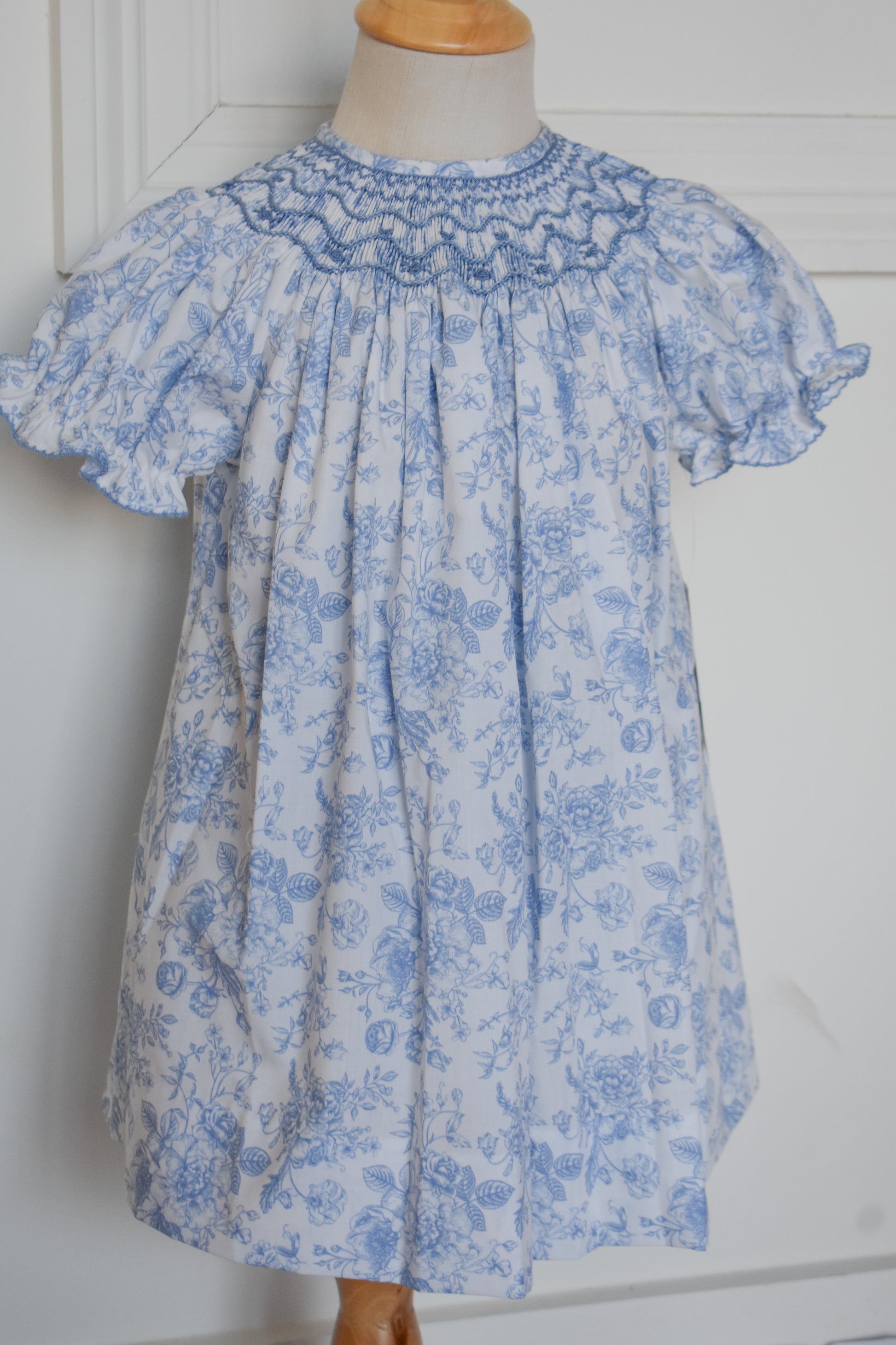Charming vintage-inspired dress featuring delicate blue toile print and romantic smocking details. The classic pattern and handcrafted smocking create timeless elegance, while the soft fabric drapes beautifully for all-day comfort. Perfect for special occasions or adding a touch of nostalgic grace to your everyday wardrobe. A sweet, feminine piece that celebrates traditional craftsmanship and enduring style.