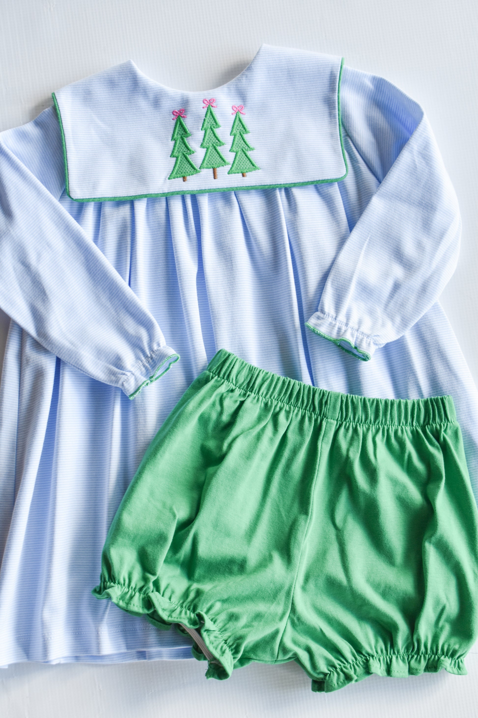 Dress your little one in cozy charm with the Enchanted Evergreens Float Bloomer Set. Featuring a soft blue striped knit top paired with delicate bloomers, this set is adorned with a festive Christmas tree applique that adds a touch of holiday magic. Perfect for playful days and holiday gatherings, it offers comfort and cuteness wrapped into one sweet outfit.