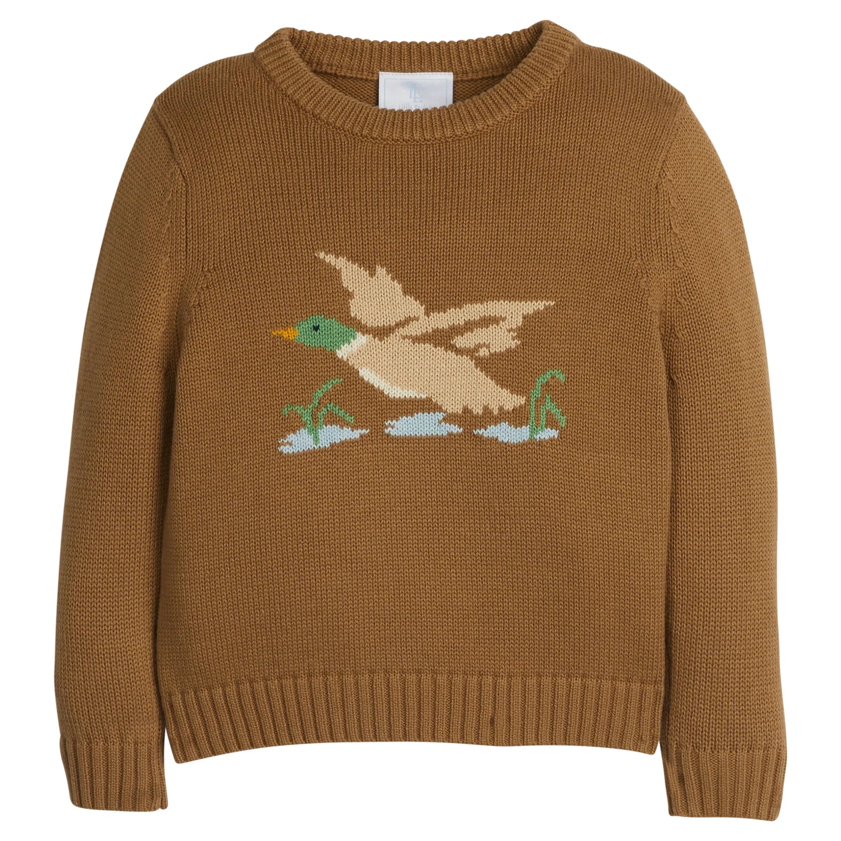 Wrap your little one in cozy charm with this brown intarsia sweater, featuring a playful mallard in mid-flight. Crafted for comfort and style, it’s perfect for adding a touch of nature-inspired warmth to any outfit. Soft and snug, this sweater is sure to keep your boy comfy during chilly days while sparking his imagination.