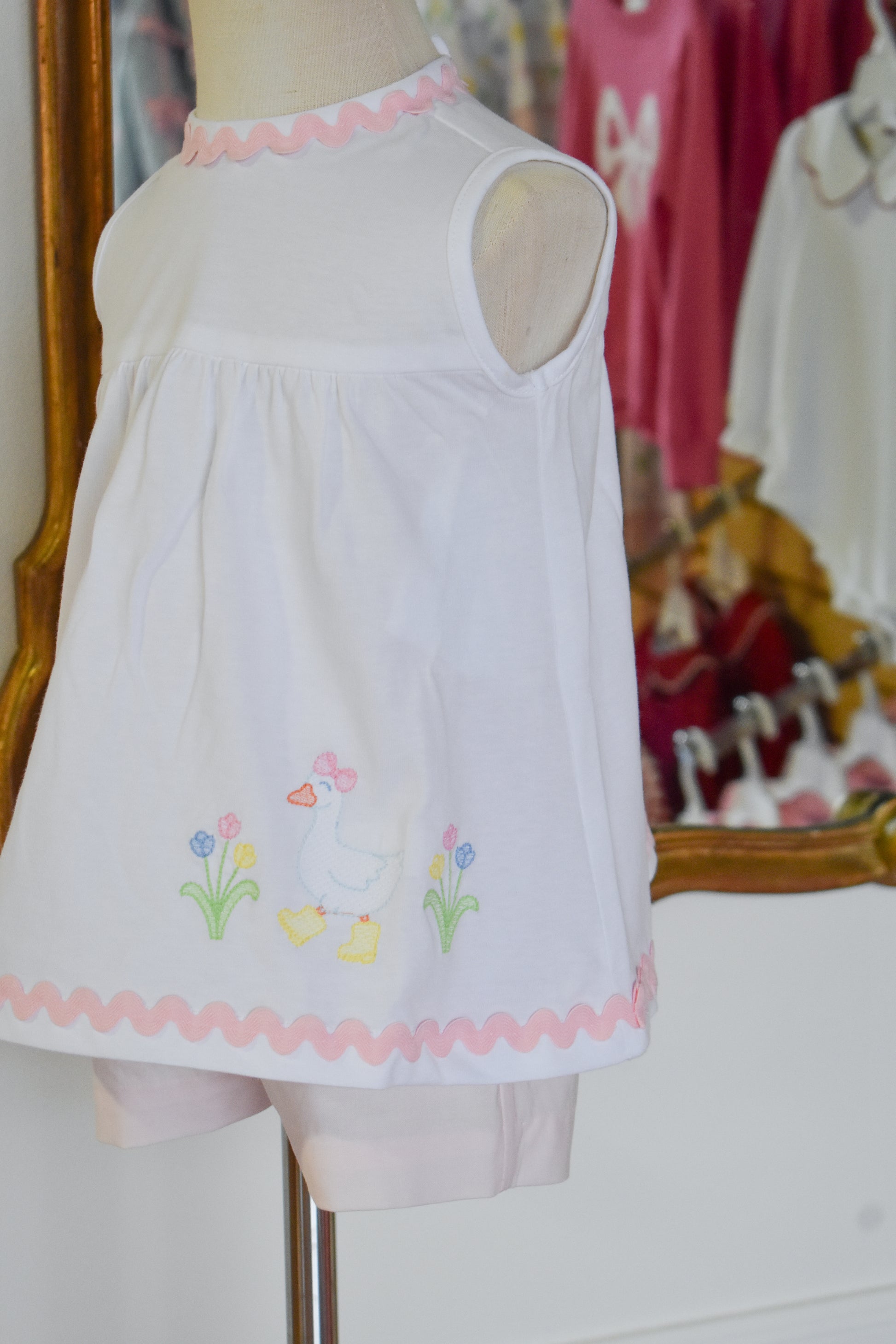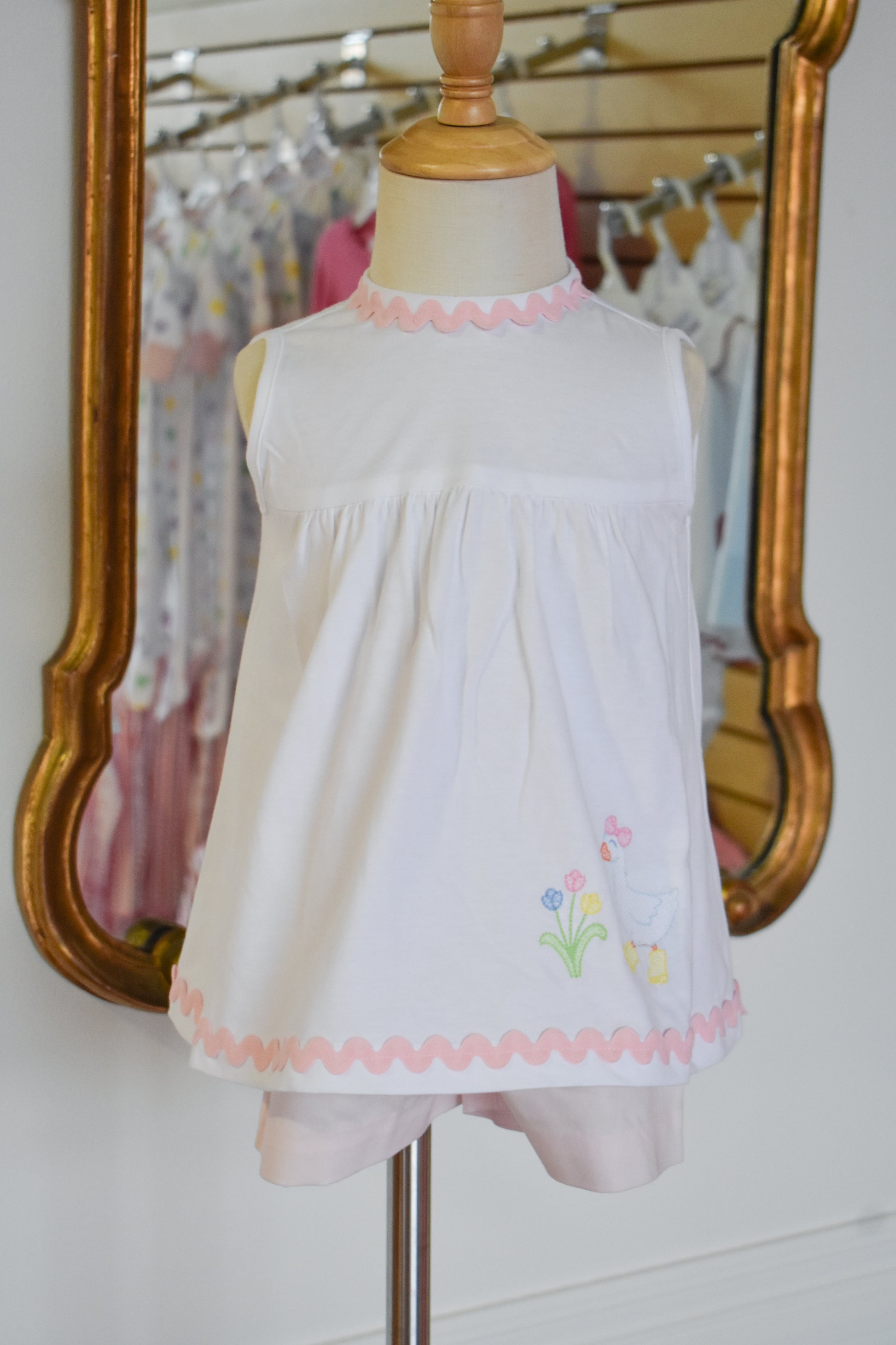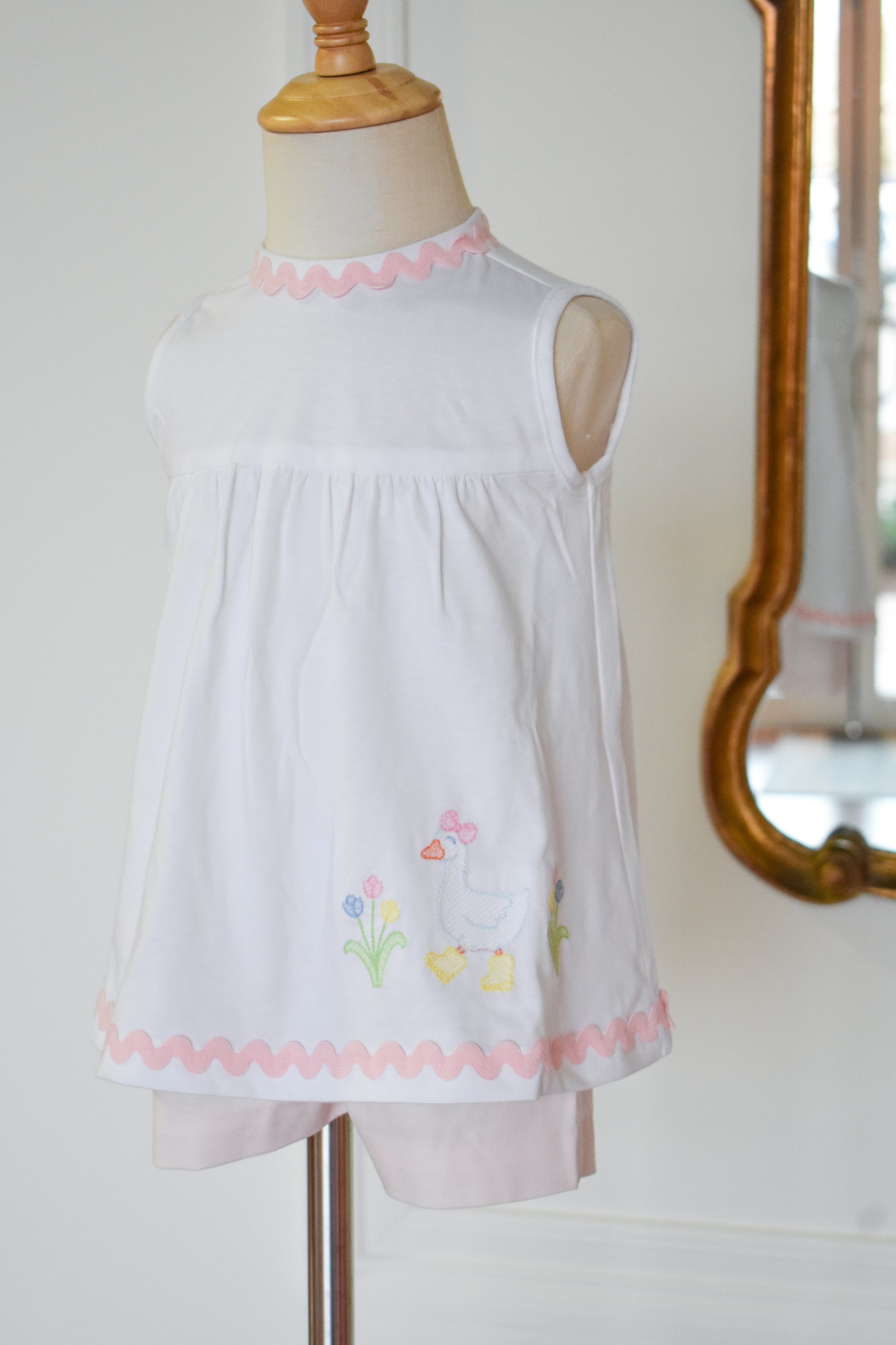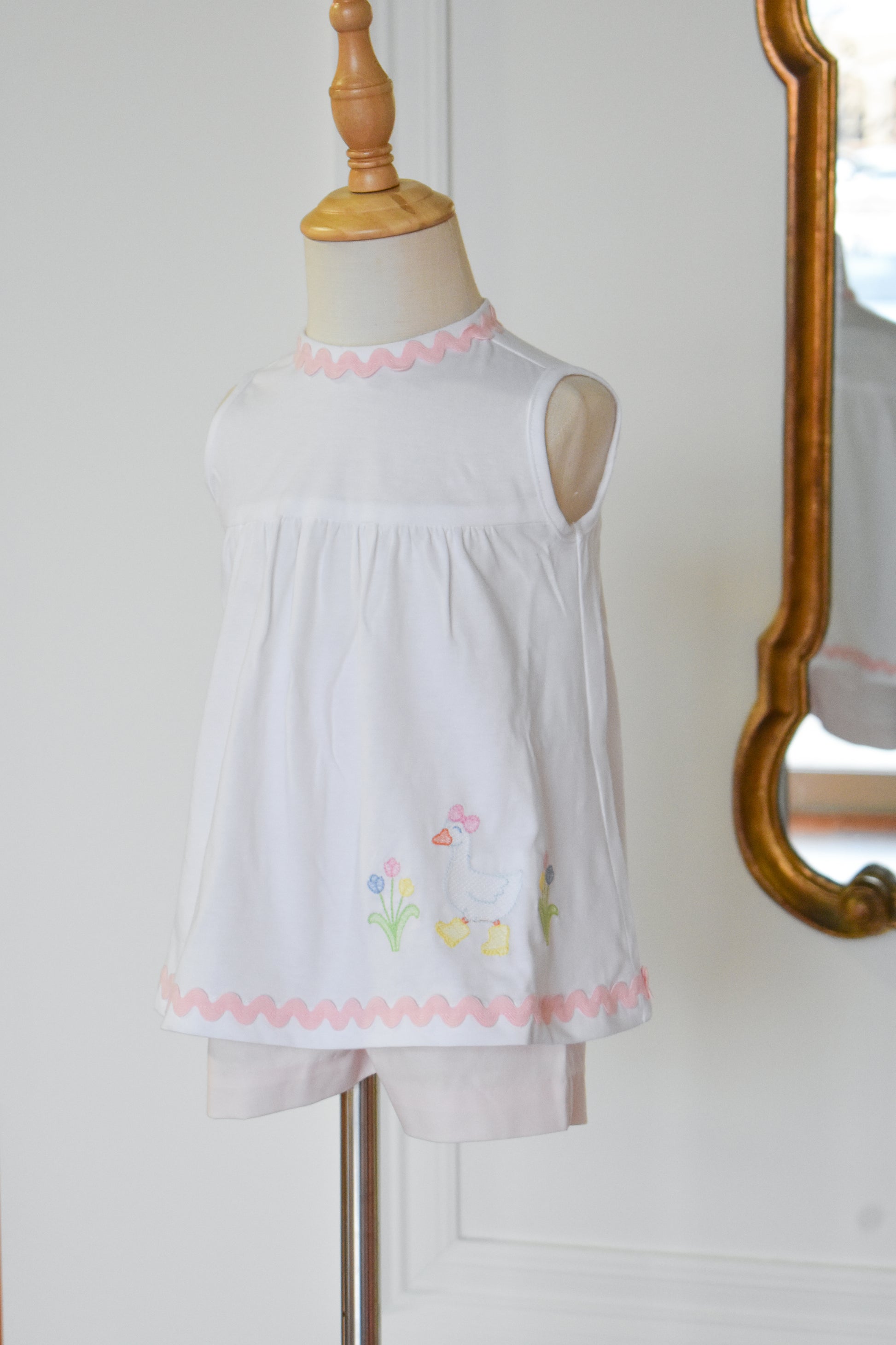 This charming two-piece set features a crisp white top adorned with delicate ric rac trim and an embroidered goose detail, paired with soft pink seersucker shorts. Perfect for warm weather adventures, the playful goose motif adds whimsy while the classic seersucker fabric keeps her cool and comfortable. An adorable choice for little ones who love timeless style with a touch of personality.