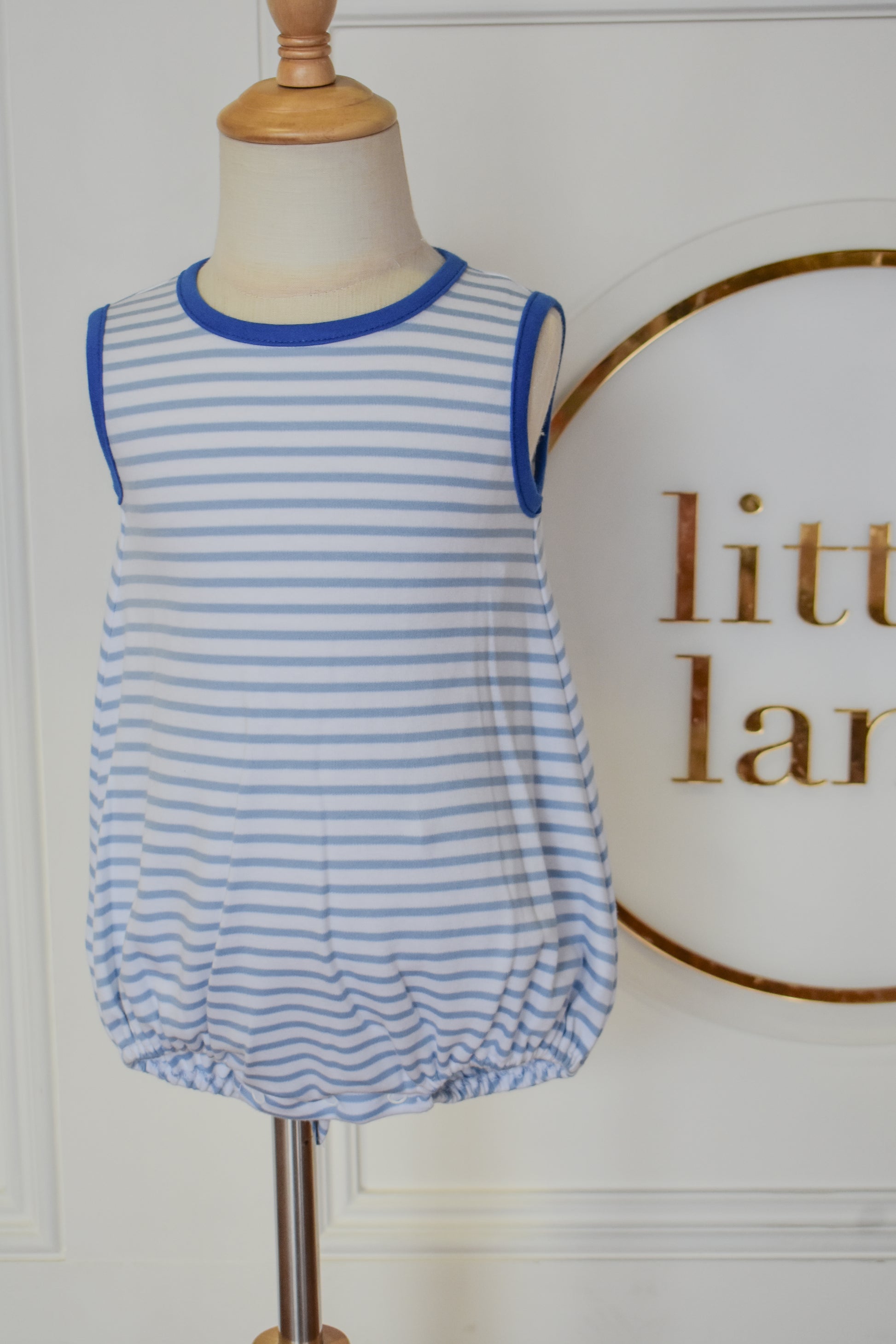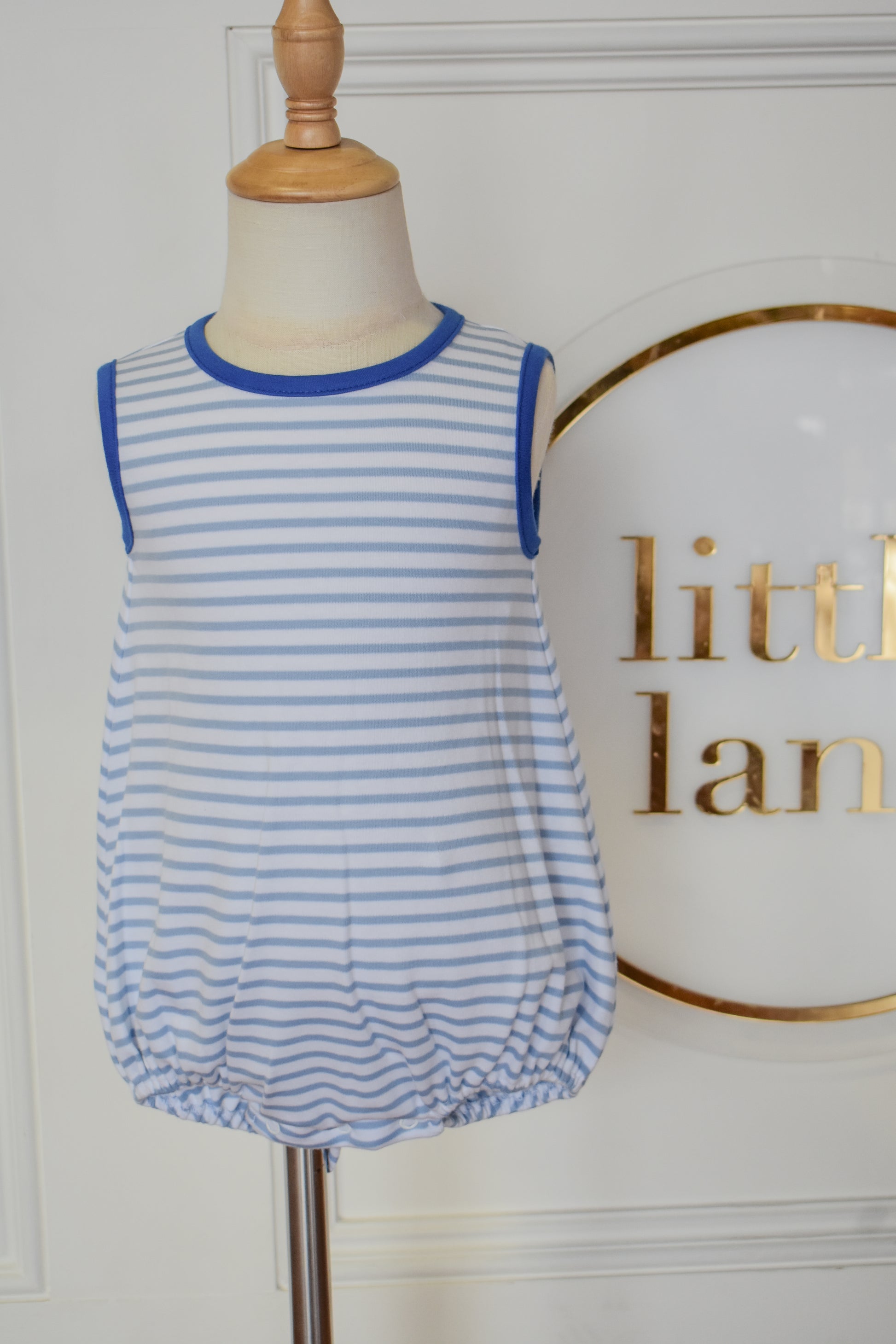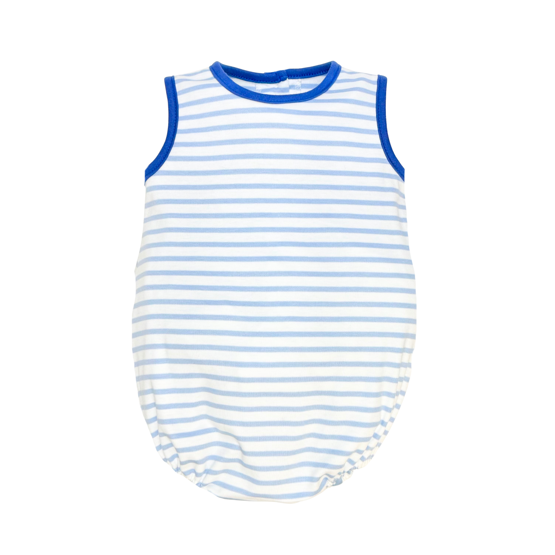 Drift into comfort with this charming bubble featuring soft cloud blue stripes and a cozy knit construction. The royal blue trim adds a pop of color and definition to this sweet, playful piece. Perfect for little ones who love whimsical style, this bubble combines gentle hues with quality craftsmanship for a look that's both adorable and practical.