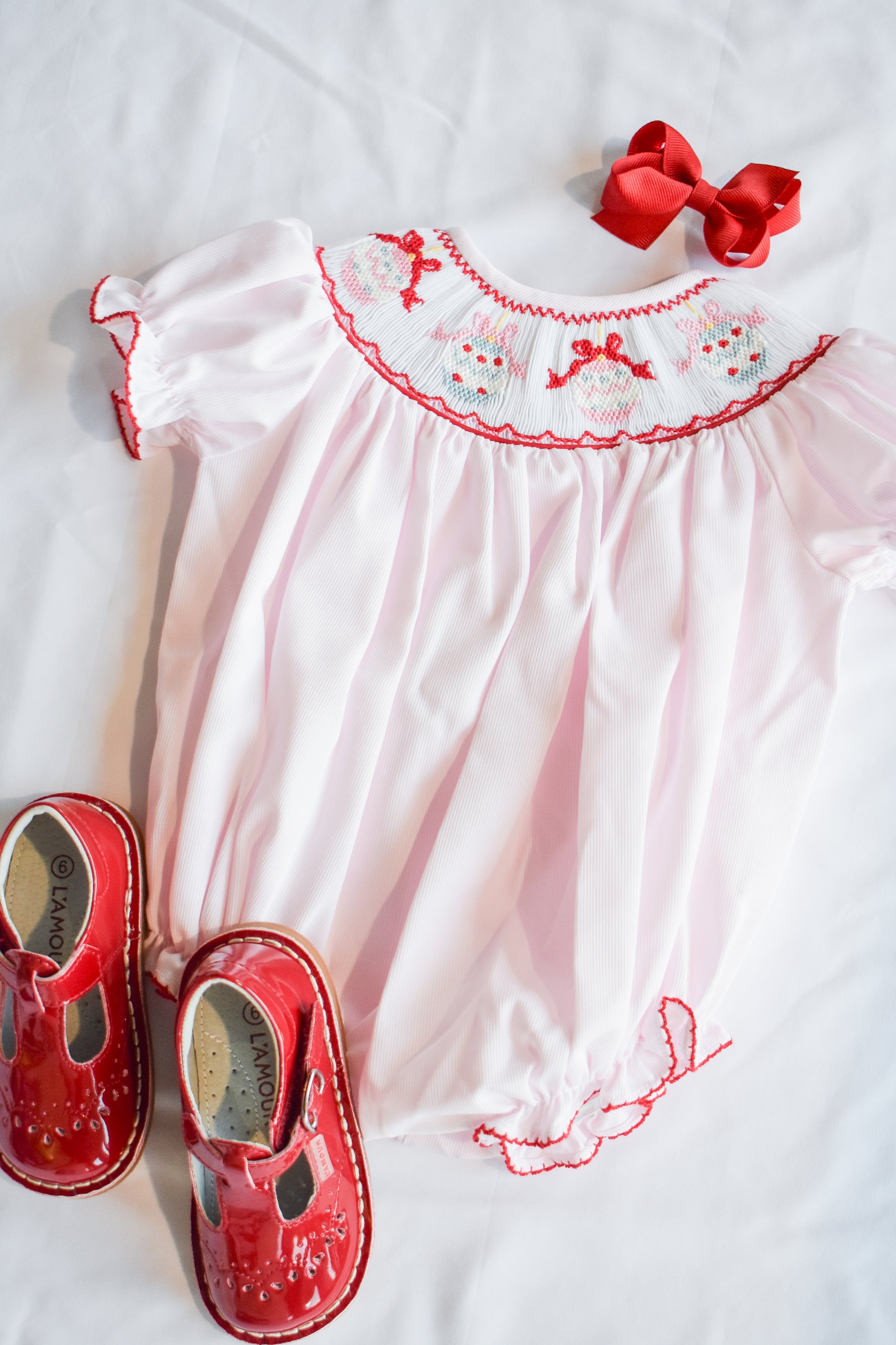 This charming pink bishop bubble features delicate smocked ornament details that add a festive touch. Finished with a bright red trim, it creates a sweet and playful look perfect for holiday celebrations or special occasions. Soft, comfortable, and adorable, this outfit brings joy and timeless style to your little one’s wardrobe.