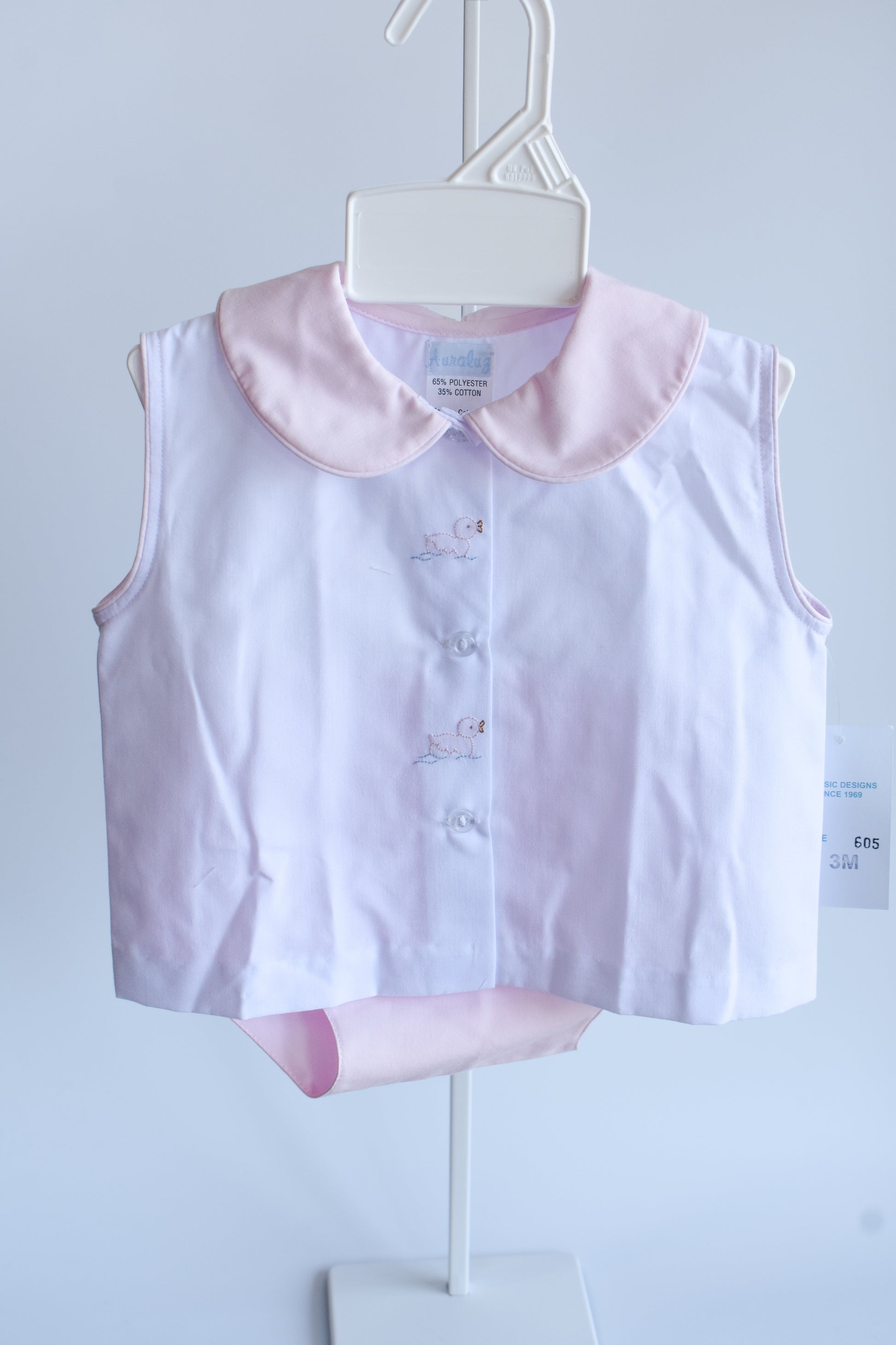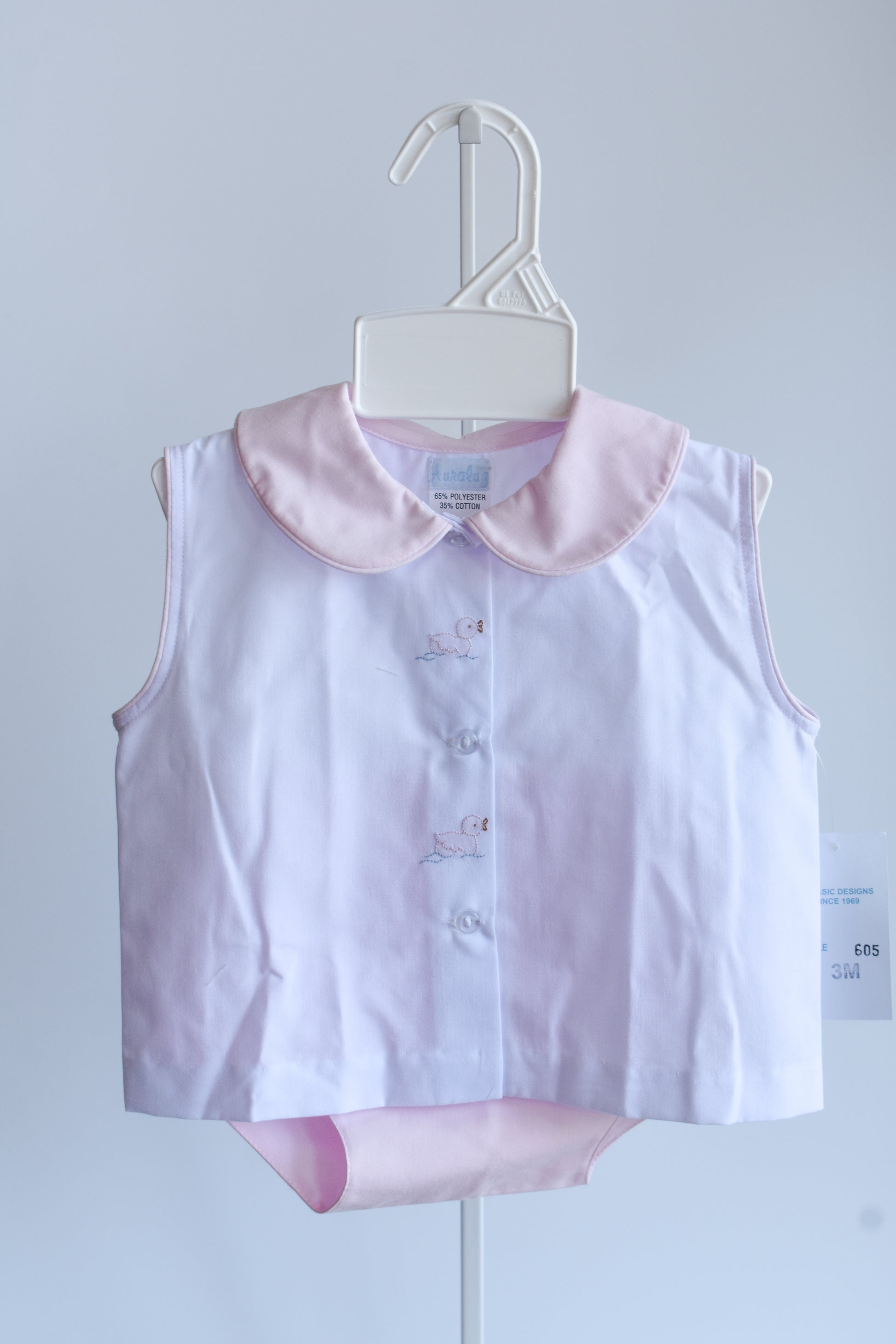 Introduce your little one to timeless charm with this adorable Little Ducky Darling Pink Bloomer Set. The sweet white top features delicate pink trim and a charming pink collar, accented with precious ducky embroidery nestled between the middle buttons. Paired with coordinating bloomers, this set is perfect for playdates, special occasions, or everyday wear. Crafted with comfort and style in mind, it's a wardrobe essential that celebrates childhood innocence and whimsy.