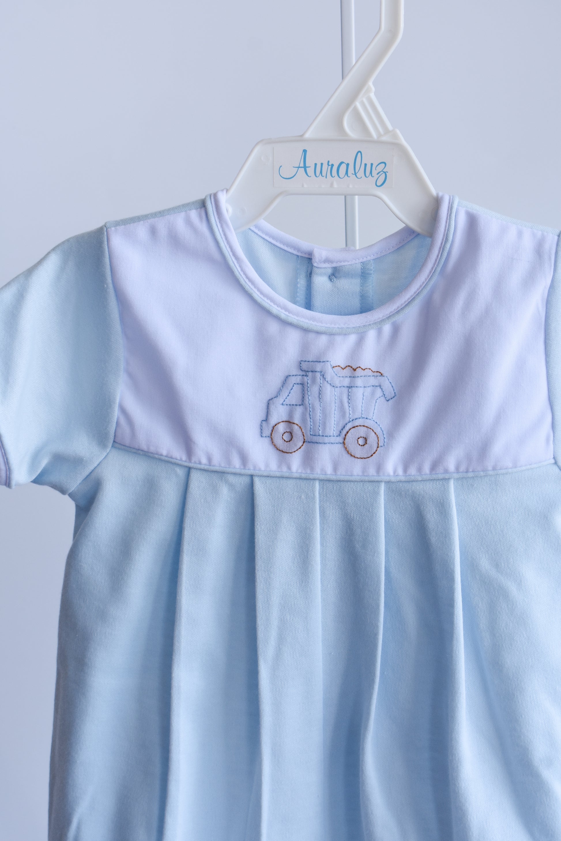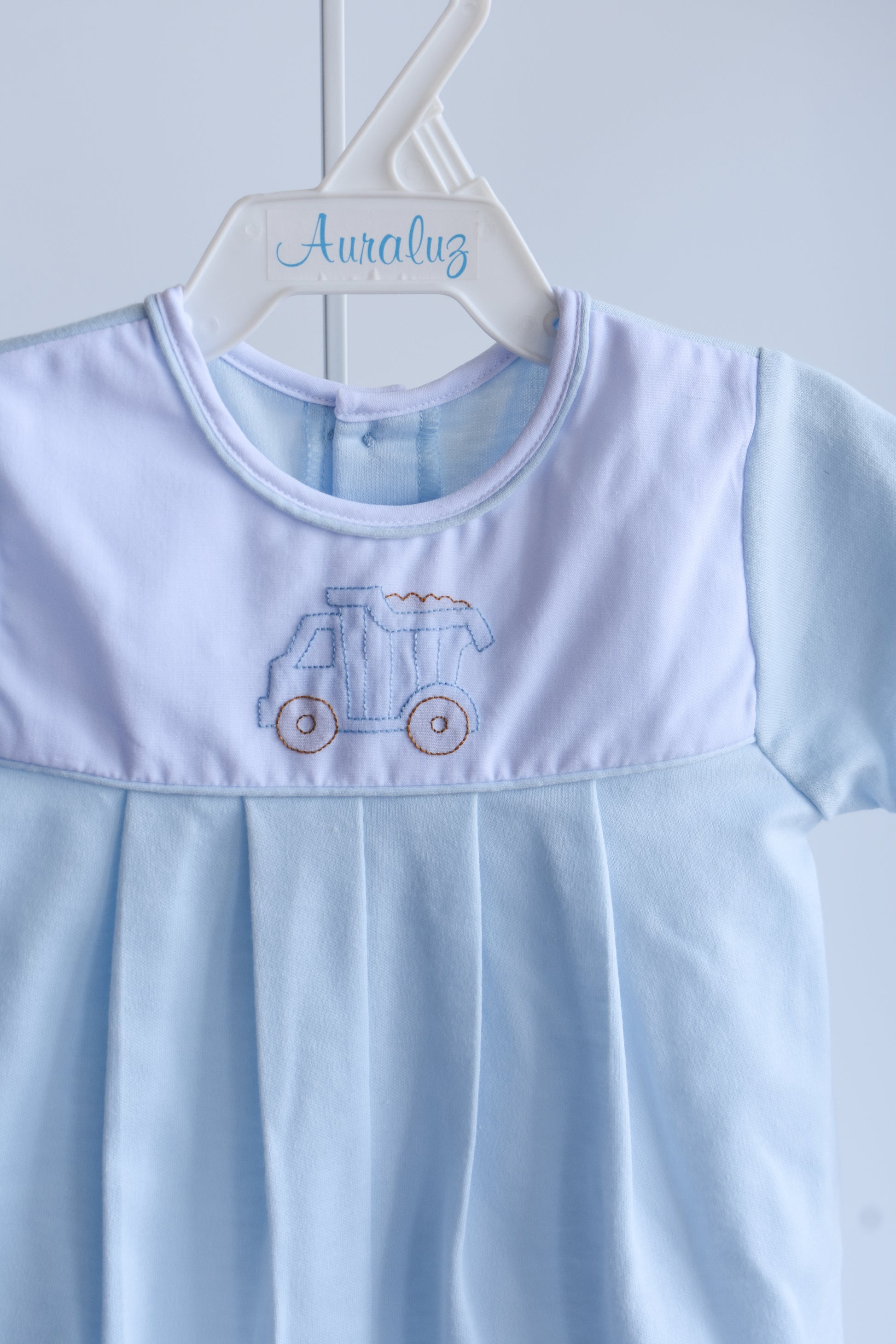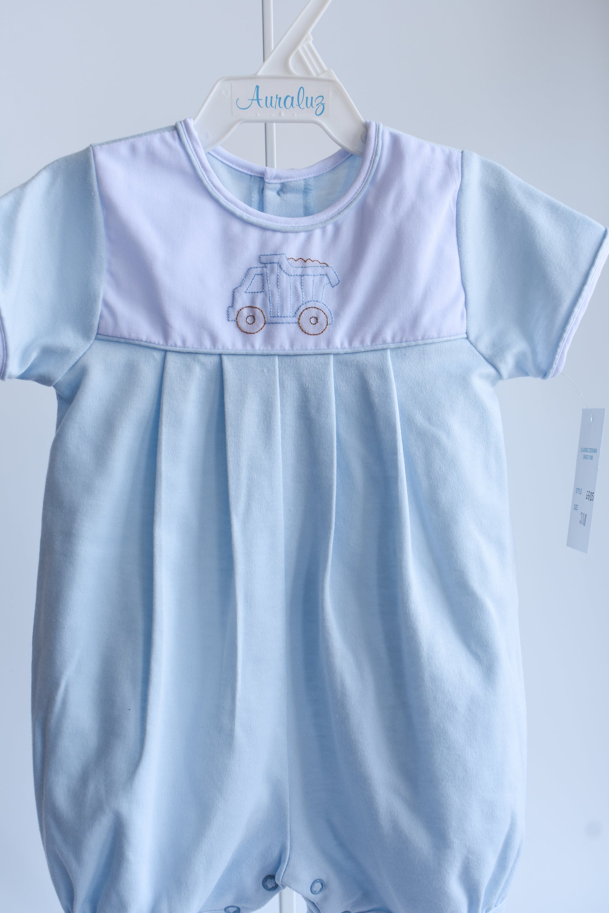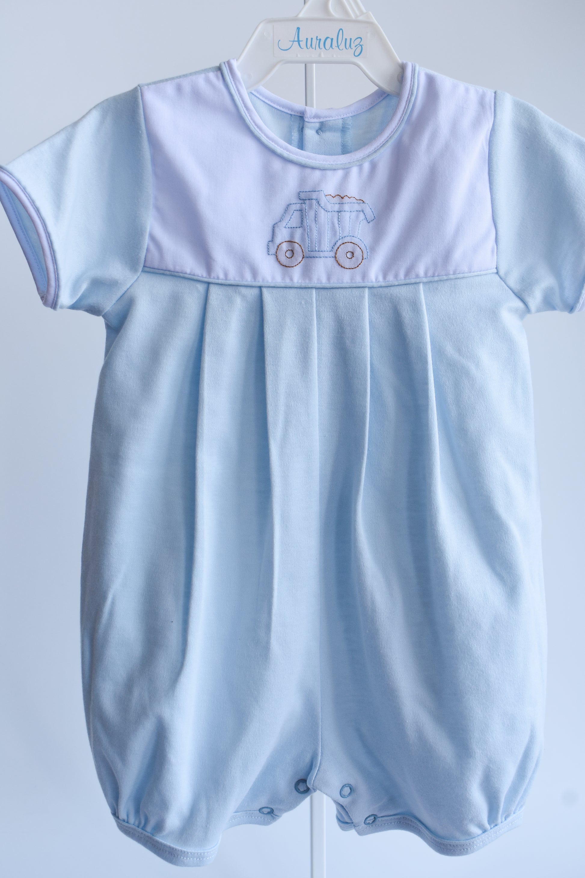 A sweet and timeless piece for your little boy. This soft blue knit bubbled romper features a classic silhouette with charming dump truck embroidery for just the right touch of playful detail. Made from the coziest knit fabric, it’s designed to keep your little one comfortable all day long—perfect for playtime, outings, and everything in between.