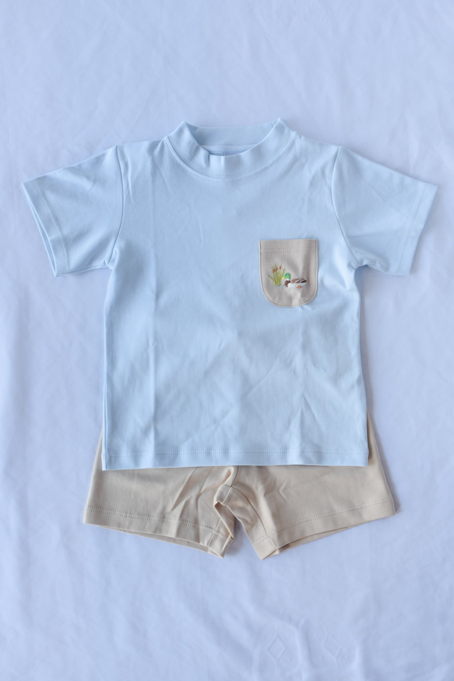 Embrace casual comfort with this charming short set featuring a light blue shirt adorned with a mallard design on the pocket, paired with coordinating latte-colored shorts. Perfect for relaxed days, outdoor adventures, or weekend getaways, this two-piece ensemble combines playful wildlife-inspired style with neutral tones. The soft color palette makes it easy to mix and match with your existing wardrobe while the duck motif adds a touch of nature-loving personality to your everyday look.