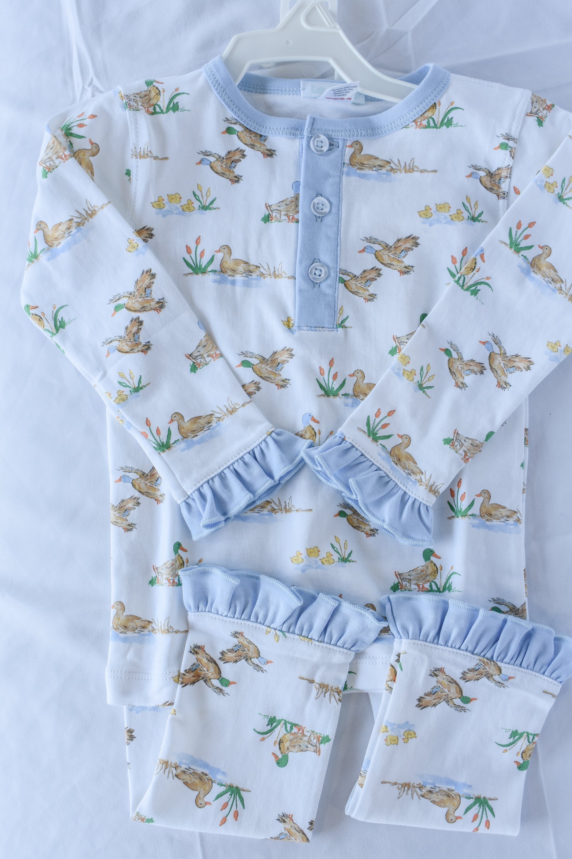 The Marshy Dreams Ruffled PJ Pant Set brings cozy comfort with a touch of charm for your little one. Featuring soft long sleeves and playful ruffled trims, this pajama set is adorned with a delightful mallard marshy print that sparks imagination. Perfect for restful nights and lazy mornings, it combines gentle fabrics with a sweet design to keep your child snug and stylish.