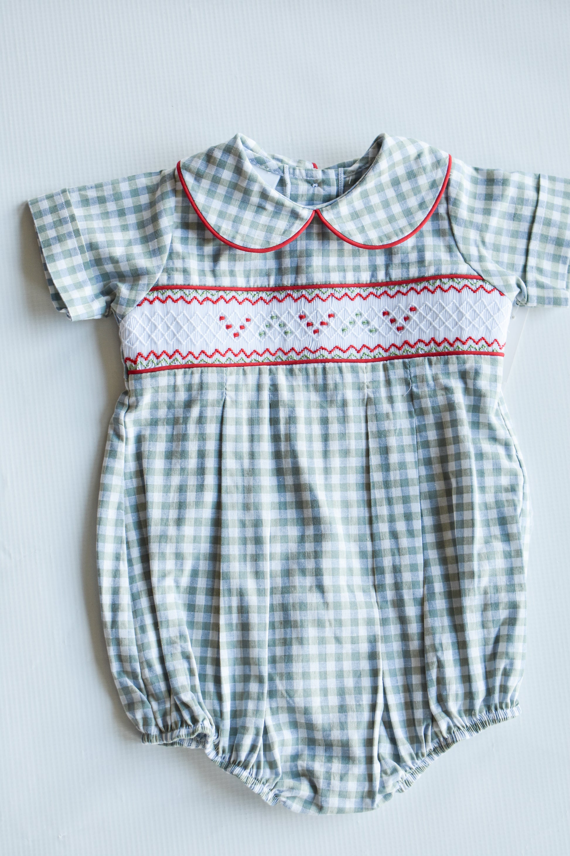 This charming dressy bubble romper features a classic green gingham pattern accented with delicate red smocked detailing for a festive touch. Designed with a comfortable fit and elegant style, it’s perfect for special occasions and holidays. Your little one will look merry and bright in this sweet, timeless piece.