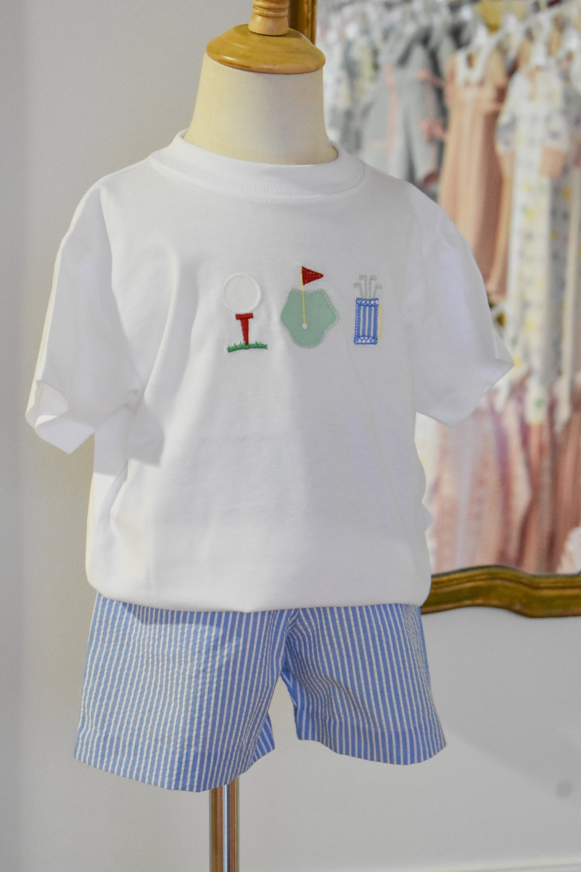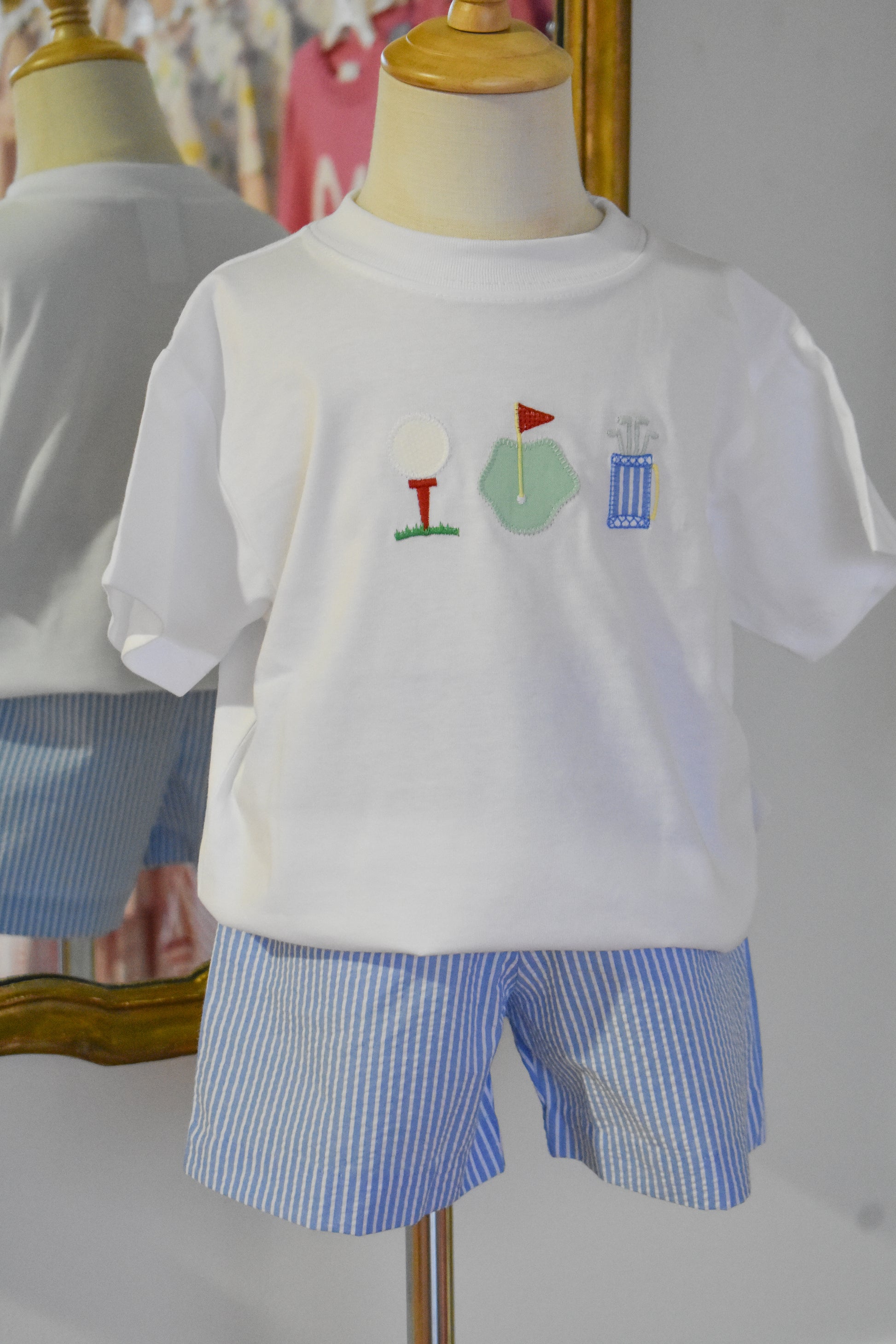 Perfect for warm weather adventures, this charming two-piece set features a crisp white tee paired with classic blue striped seersucker shorts. The lightweight, breathable fabric keeps little ones comfortable during playtime or casual outings. The timeless seersucker pattern adds a preppy touch, while the simple white top provides versatile styling options. An easy-to-wear set that's both practical and adorable for boys' spring and summer wardrobes.