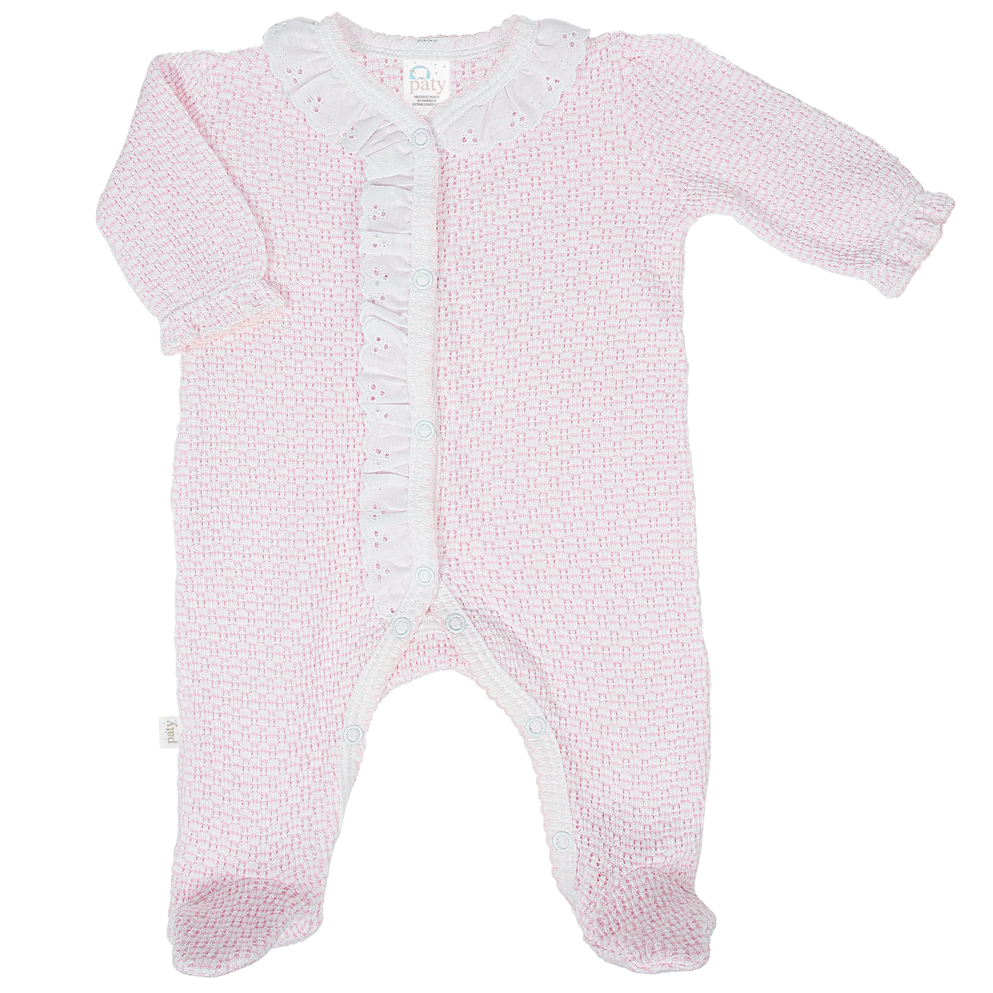 Adorable pink footie with delicate eyelet trim detailing and charming puff sleeves. The sweet snap button closure makes dressing your little one effortless, while the white trim adds a classic touch. Perfect for cozy days and special occasions alike. Soft, comfortable, and undeniably precious.