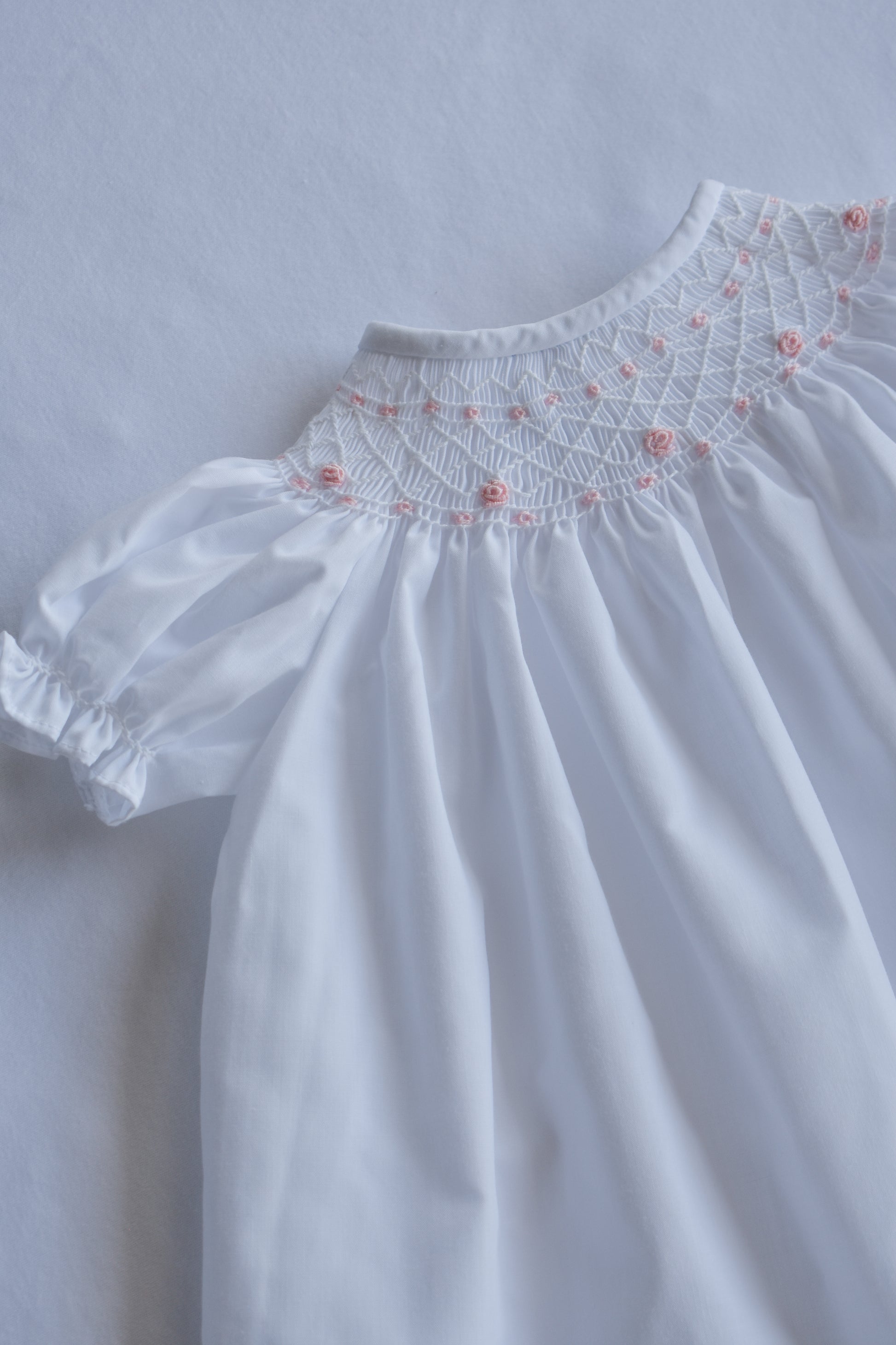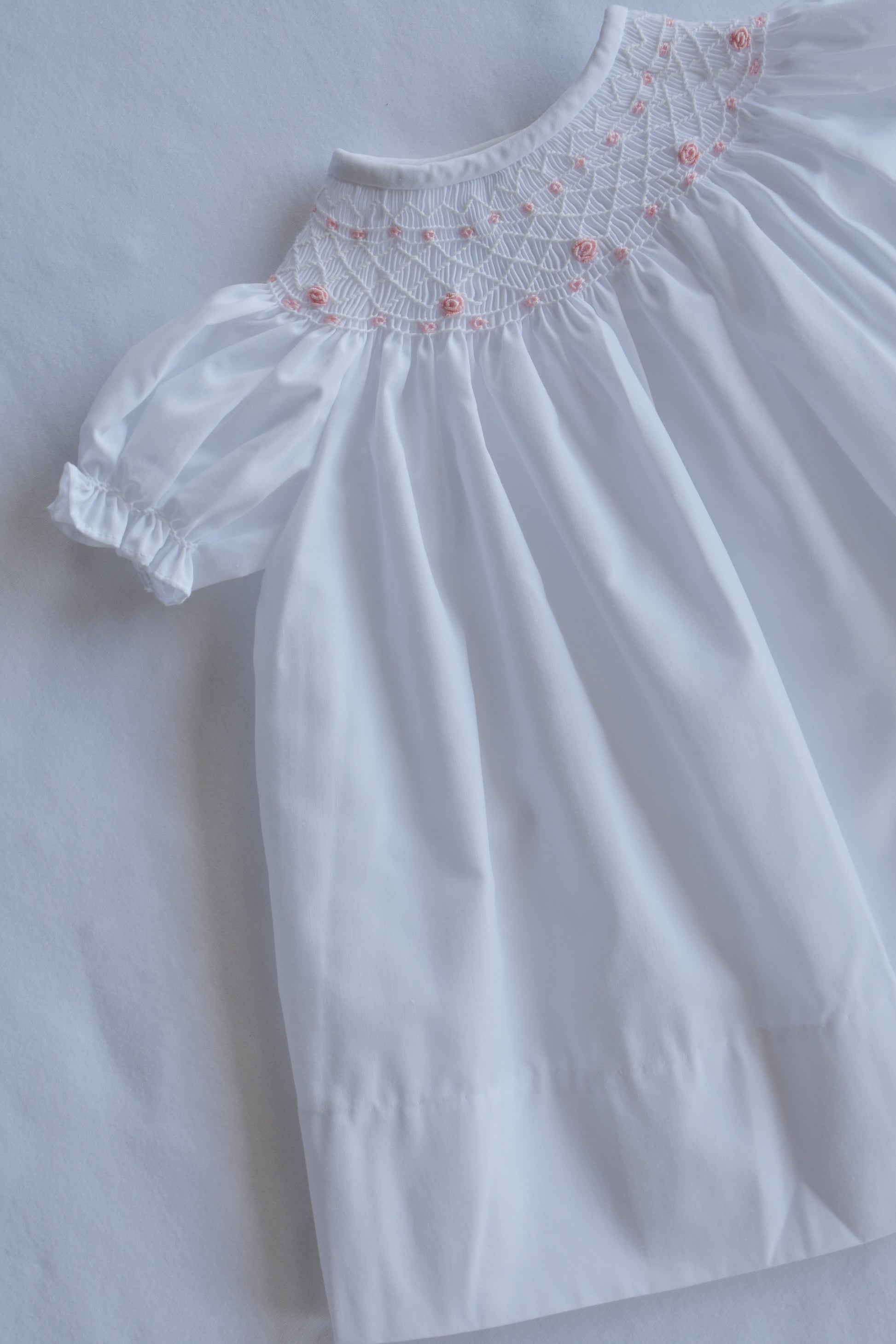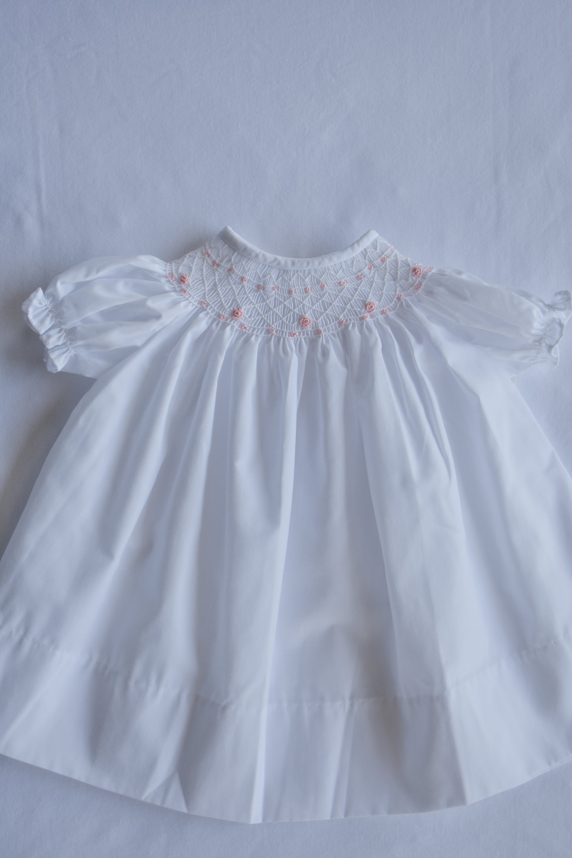 This charming white bishop dress features delicate pink floral accents, perfect for adding a touch of sweetness to any occasion. Its classic silhouette and soft colors make it an ideal choice for little ones who love to twirl and shine. Comfortable and stylish, this dress is sure to become a favorite in your child's wardrobe.