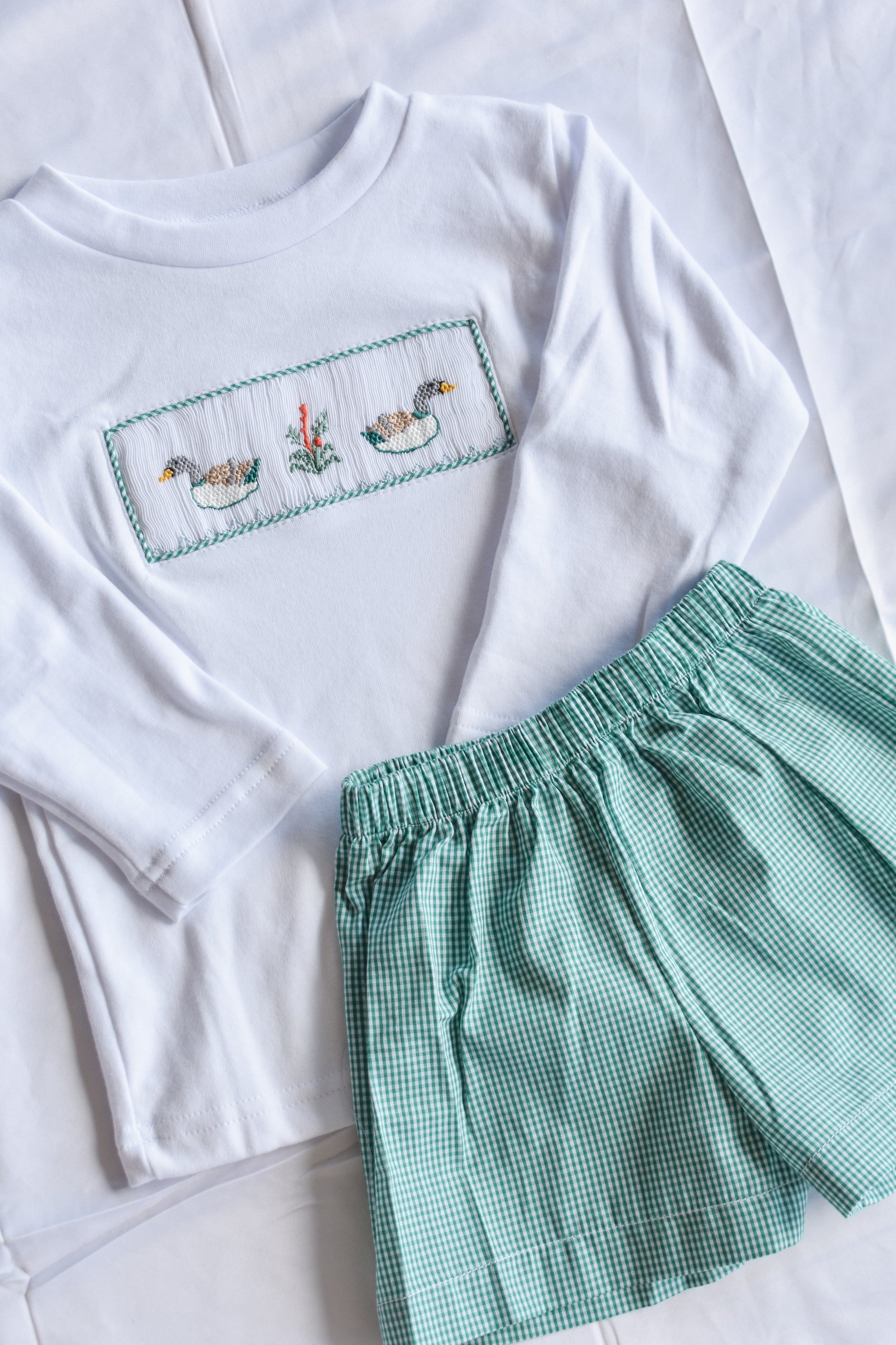This charming Pondside Play Smocked Short Set features a soft long sleeve white tee adorned with delicate smocked mallards, paired perfectly with green gingham shorts. Designed for comfort and playful style, it’s ideal for sunny days spent exploring and enjoying outdoor adventures.
