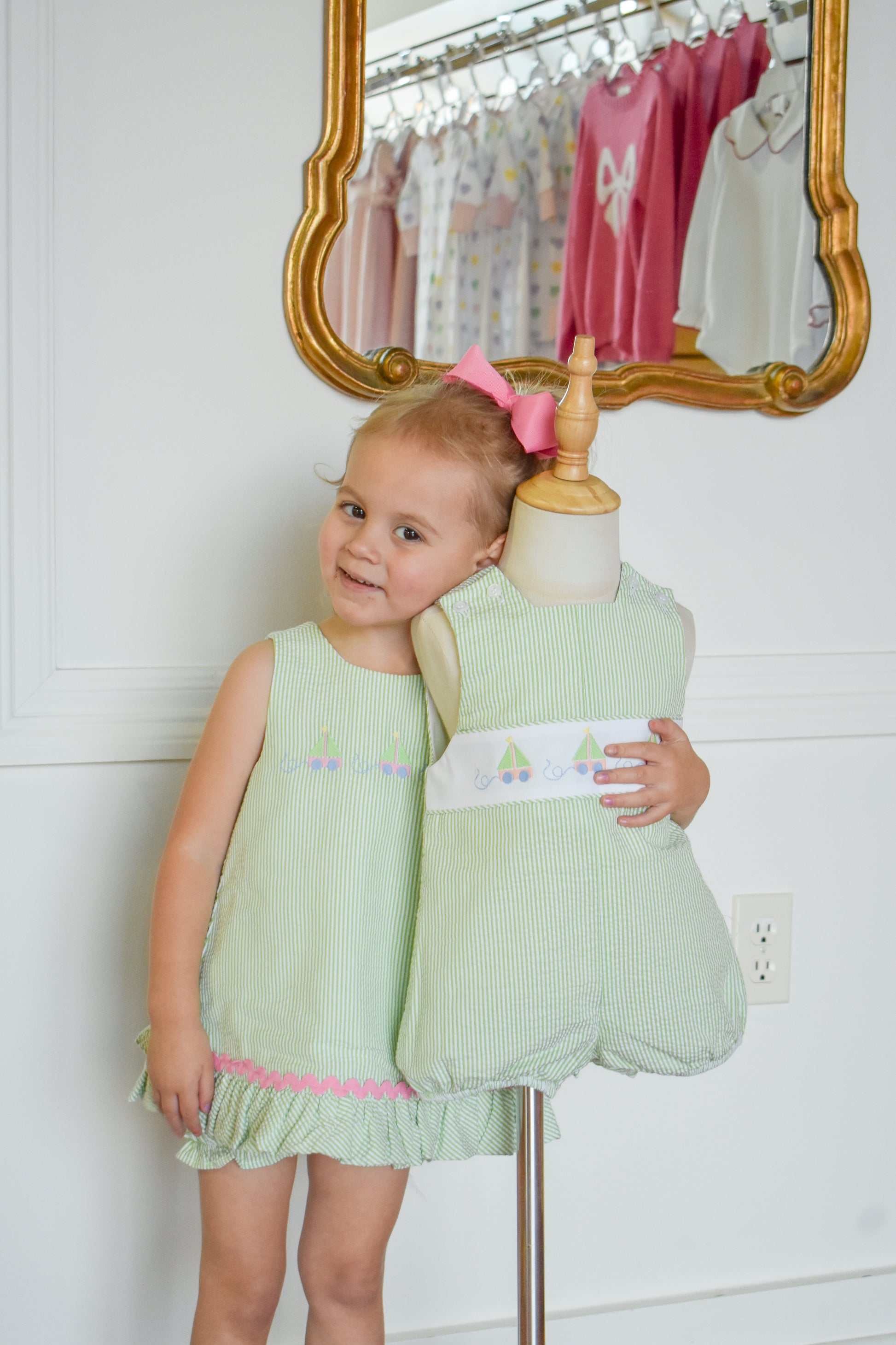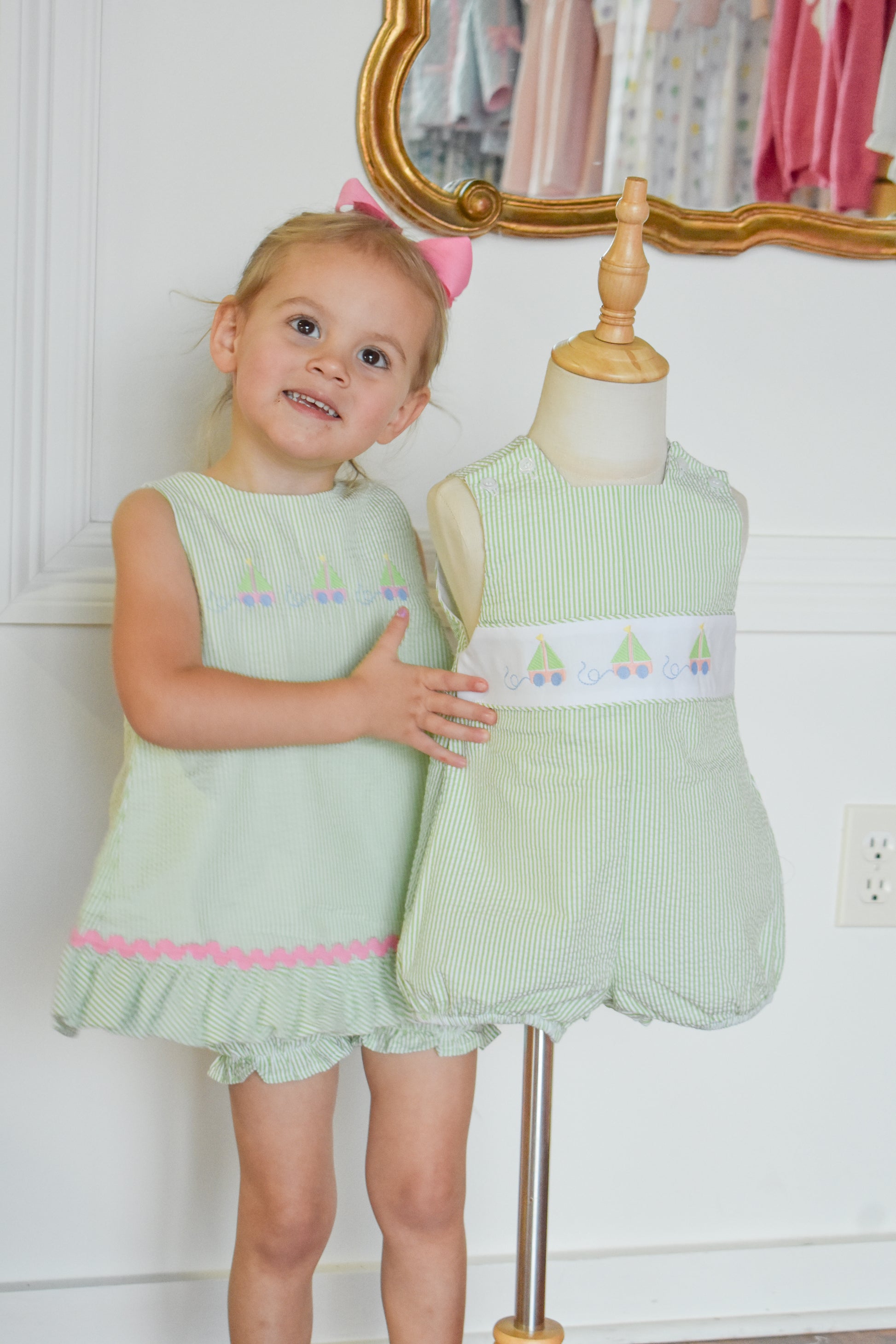 Set sail for adorable adventures in this charming green seersucker dress! Featuring delicate angel tie-back details and matching bloomers, this precious piece combines comfort with whimsical style. Sweet embroidered sailboat accents add a playful nautical touch perfect for seaside strolls or special occasions. The classic seersucker fabric keeps little ones cool and comfortable, while the thoughtful design ensures modest coverage. A timeless treasure that captures childhood magic.