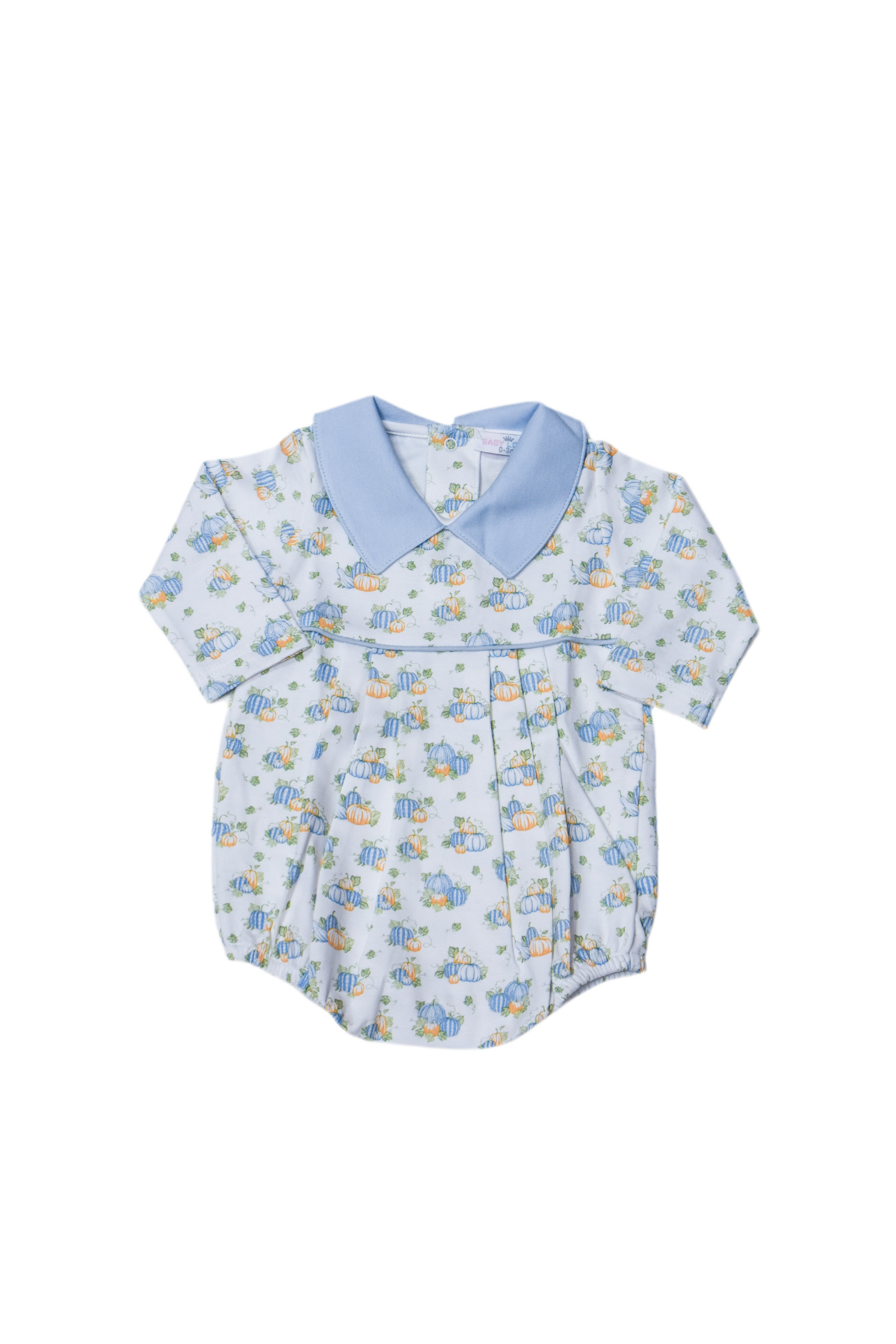 This charming boys' bubble features a subtle blue pumpkin patch print, adding a playful yet gentle touch to the soft blue fabric. Designed with a classic collar, it combines comfort with sweet style, perfect for little ones to wear during autumn days or festive outings.