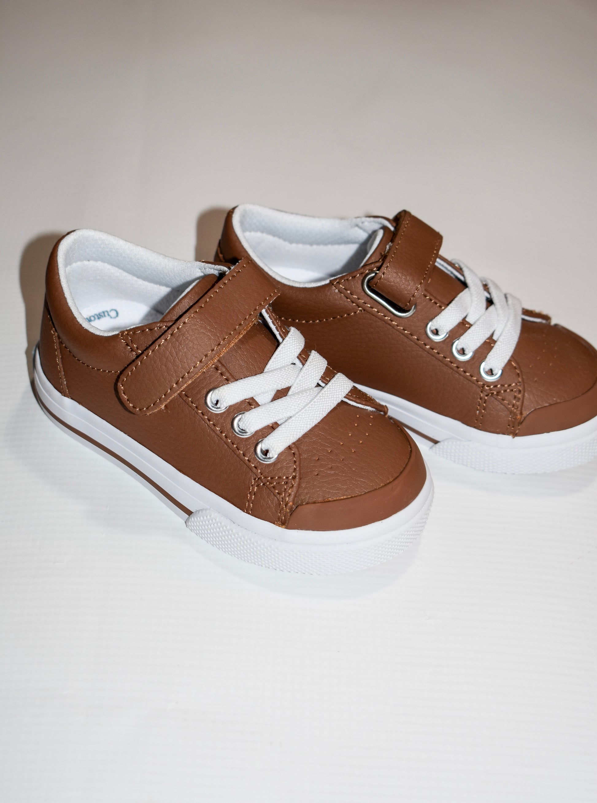 The Reese Brown Leather Sneaker offers a cozy fit with dual removable insoles in Medium and Wide to suit growing feet perfectly. Its roomy toe box lets little toes move freely while arch support nurtures developing feet. A firm heel counter adds stability for confident steps, and the padded collar keeps comfort all day. Crafted with a soft leather upper and breathable lining, these sneakers have a cushioned footbed and flexible, slip-resistant soles. The easy single strap ensures a secure, adjustable fit for every adventure.