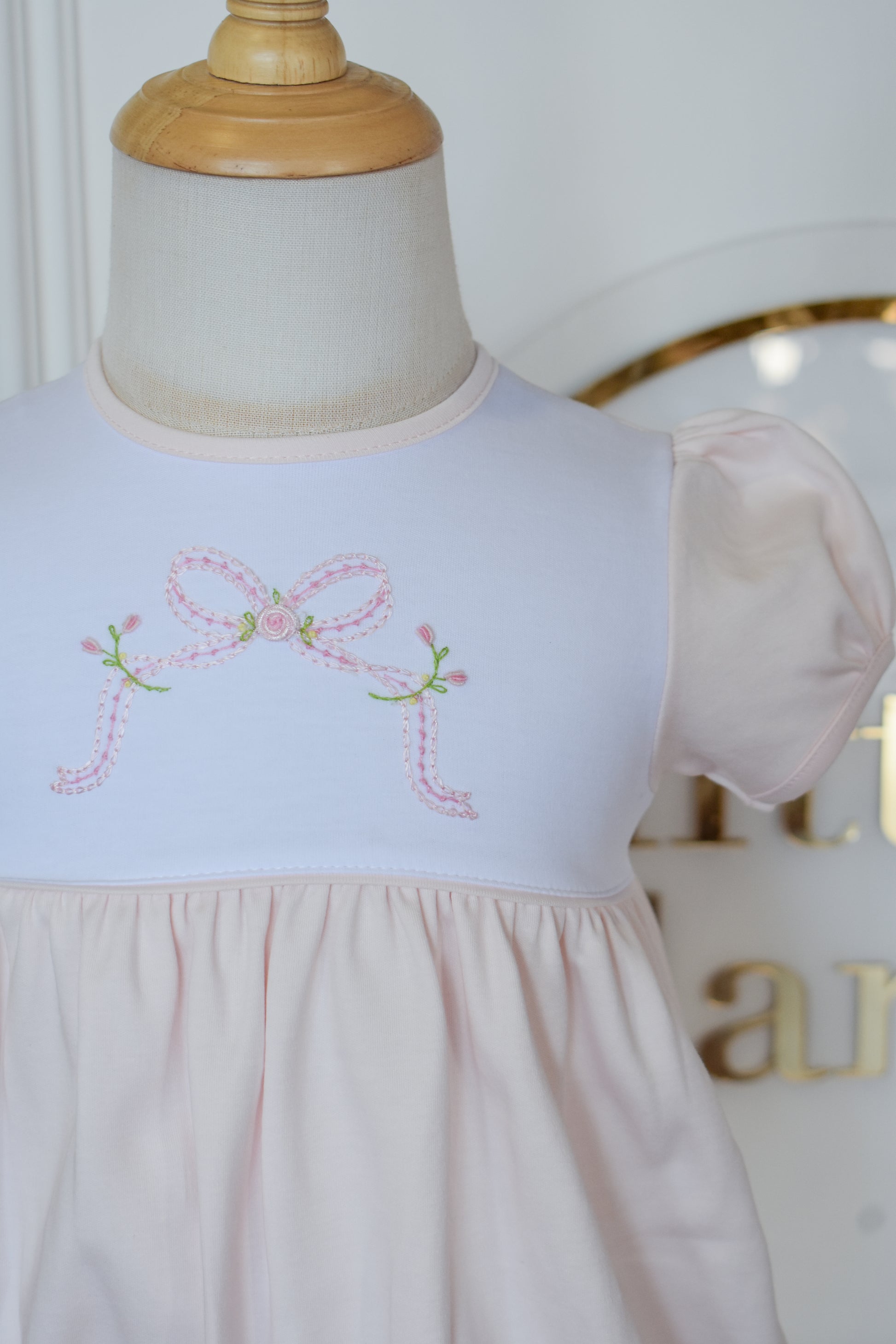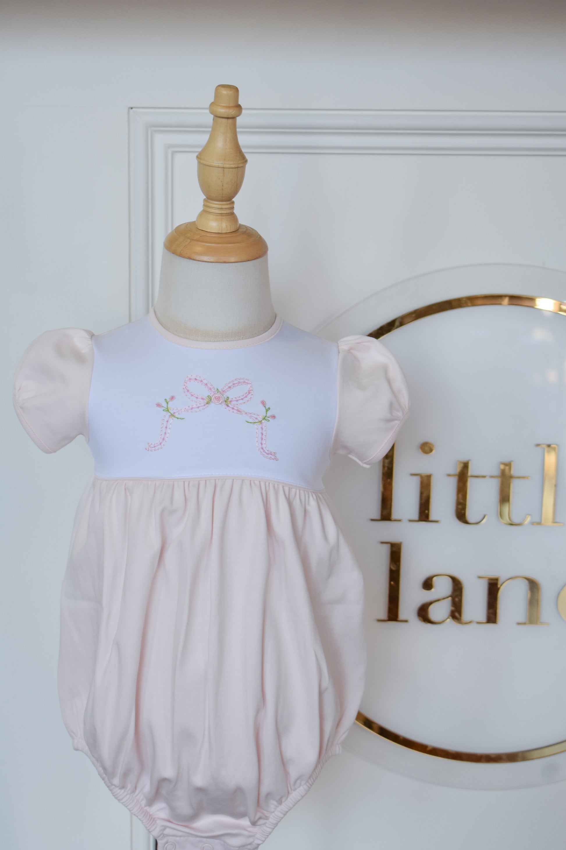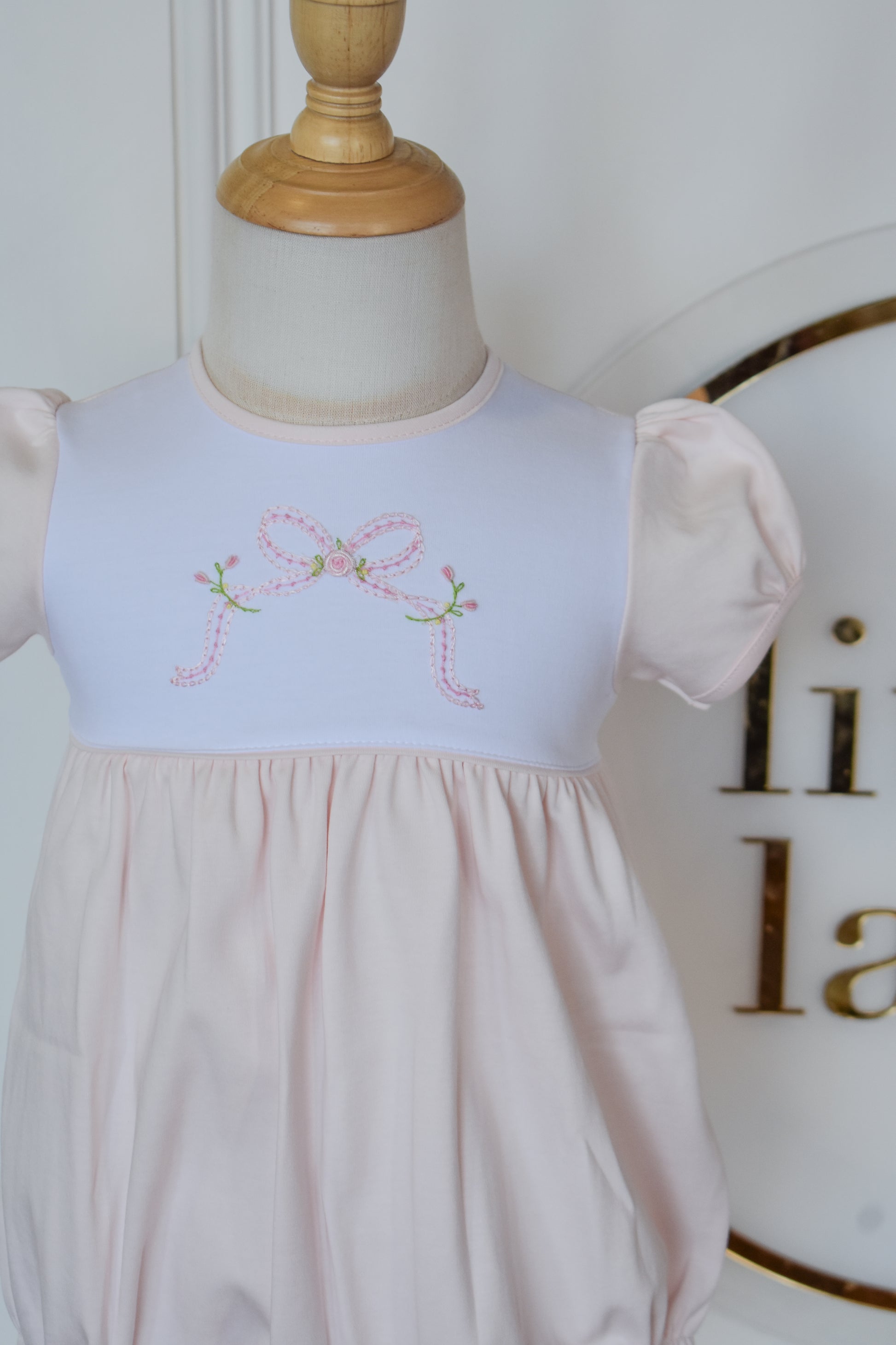 Adorable bubble featuring delicate squiggles and charming floral embroidery in soft light pink. Finished with a pretty ribbon detail, this whimsical piece brings a touch of sweetness to any little girl's wardrobe. Perfect for playdates, special occasions, or everyday wear that makes her smile.