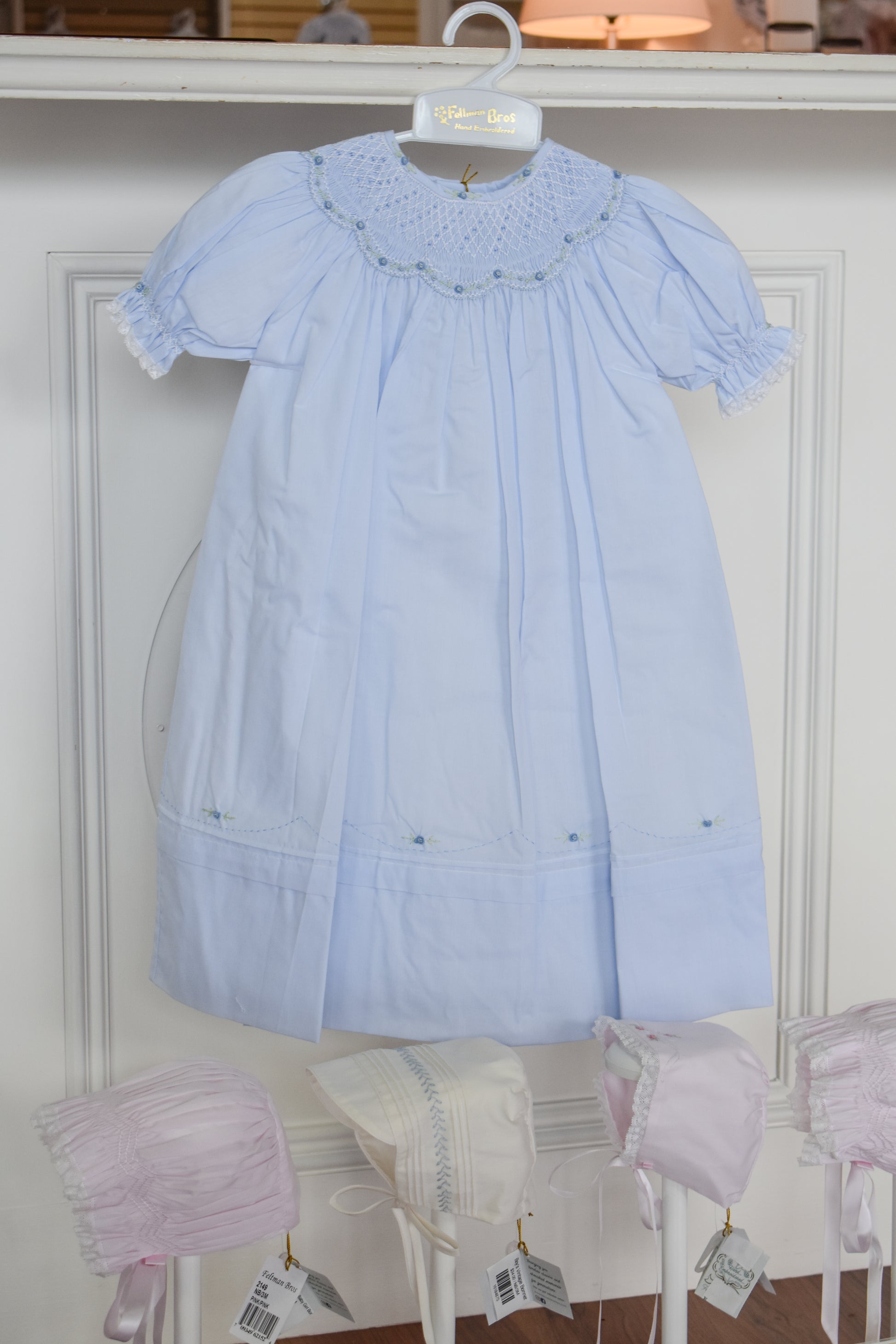 This charming pink bishop dress features delicate smocking and intricate rosebud embroidery, creating an elegant yet sweet look. Perfect for special occasions or everyday wear, its soft fabric ensures comfort while the timeless design adds a touch of classic beauty to any little girl's wardrobe.