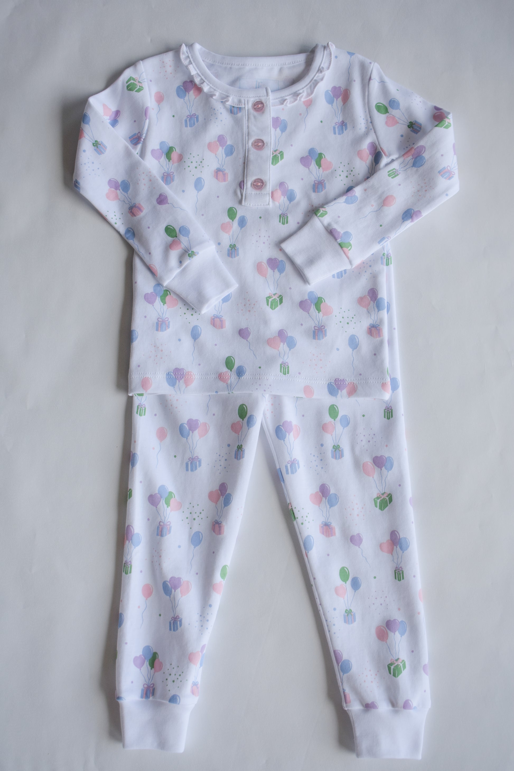 Cozy up in these sweet and stylish Ruffled Printed Jammies in Pink Balloons. Featuring delicate ruffles and playful pink balloons, these Jammies will keep you comfortable and cute. Perfect for a relaxing night in or a slumber party with friends.