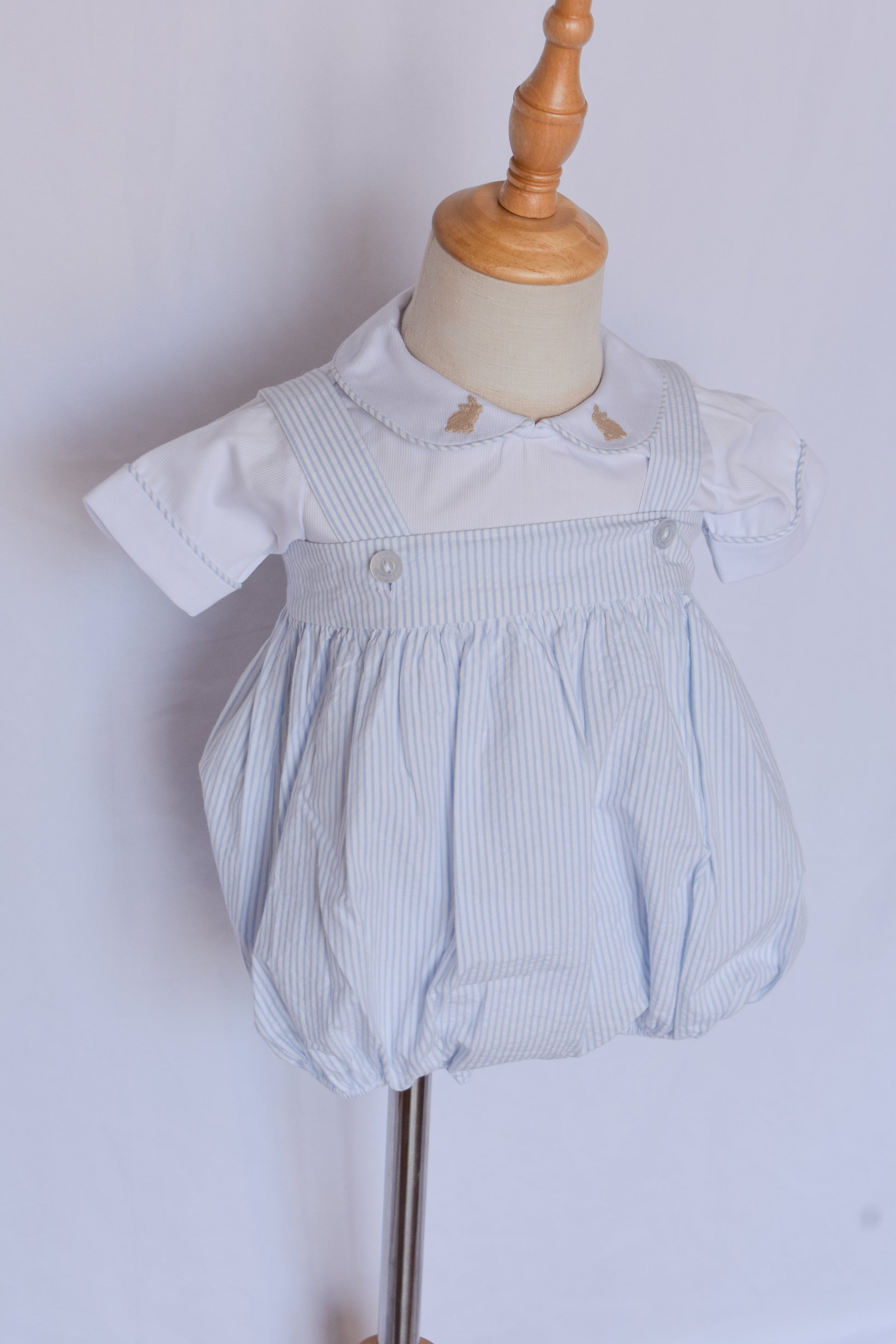 Hop into springtime style with this charming Saratoga Bunny Bubble Set. This precious two-piece ensemble features a crisp white Peter Pan collar shirt adorned with delicate bunny embroidery, paired with classic blue seersucker bubble shorts. Perfect for Easter celebrations, garden parties, or everyday adventures, this set combines timeless preppy charm with playful details. The soft seersucker fabric keeps little ones cool and comfortable, while the sweet bunny motif adds a touch of whimsy. An heirloom-worthy outfit that's sure to become a cherished favorite.