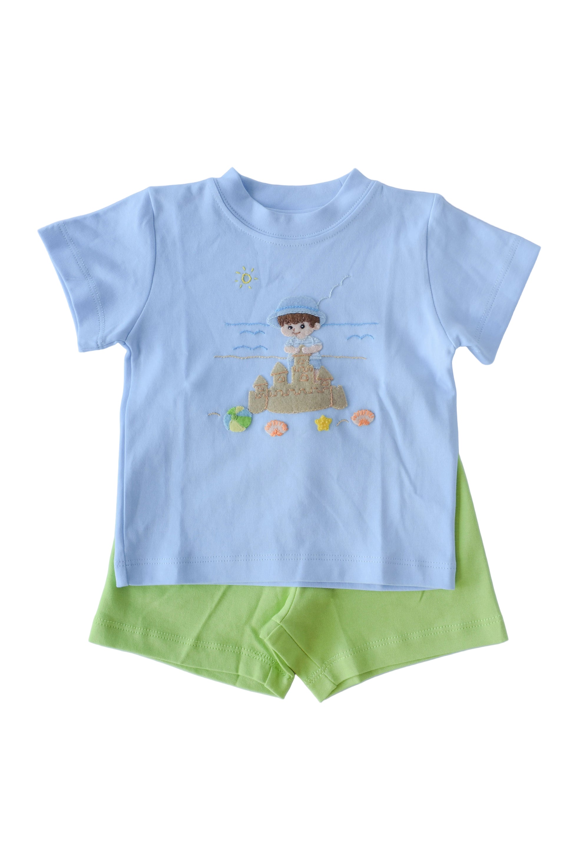 Sheldon's Beach Short Set features a light blue shirt showcasing a fun beach scene graphic, paired with comfortable green shorts. Perfect for casual summer outings, beach days, or relaxed weekends. This coordinated two-piece set combines playful style with everyday comfort, making it an ideal choice for laid-back adventures. The classic color combination works well for various occasions, from poolside hangouts to neighborhood strolls.