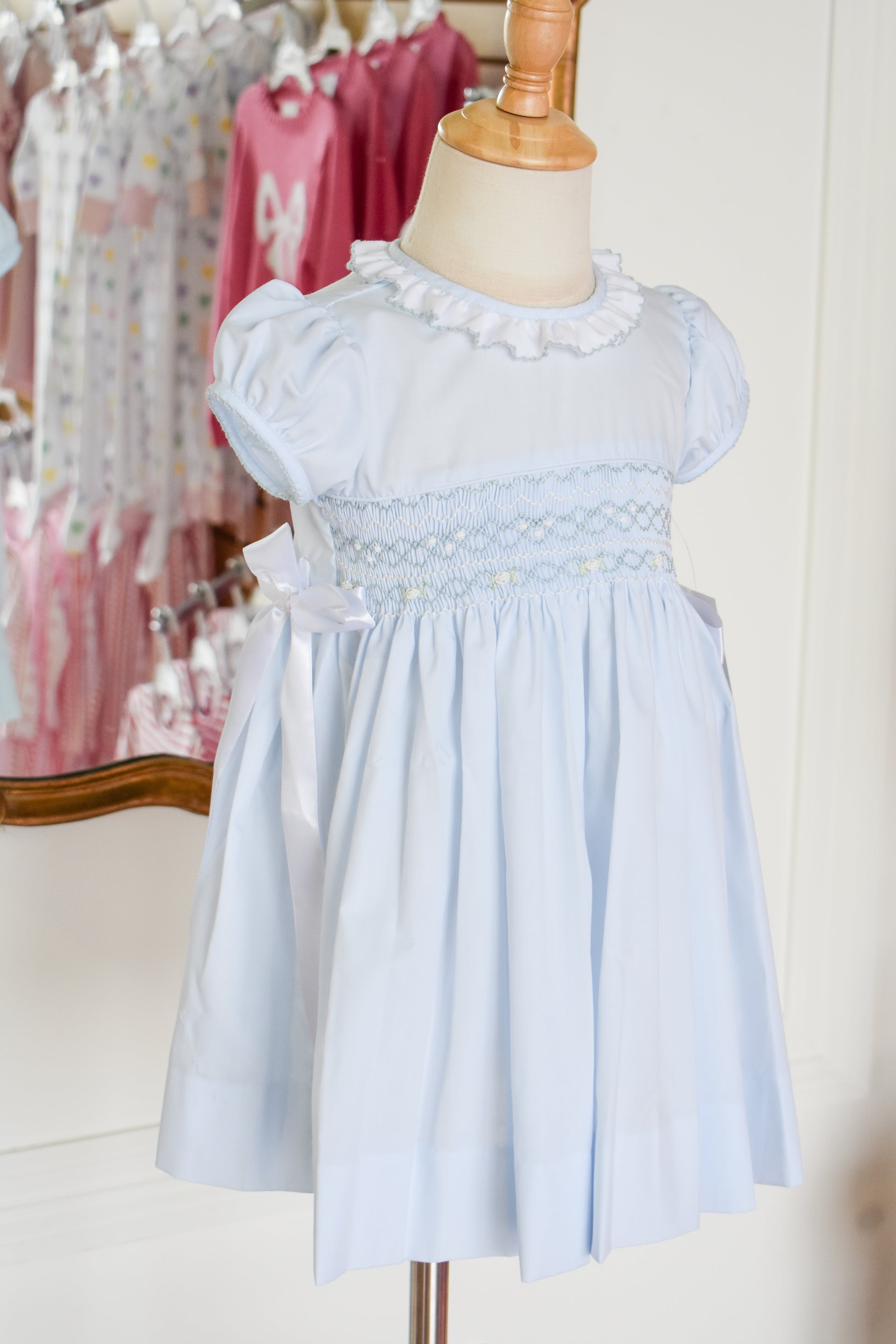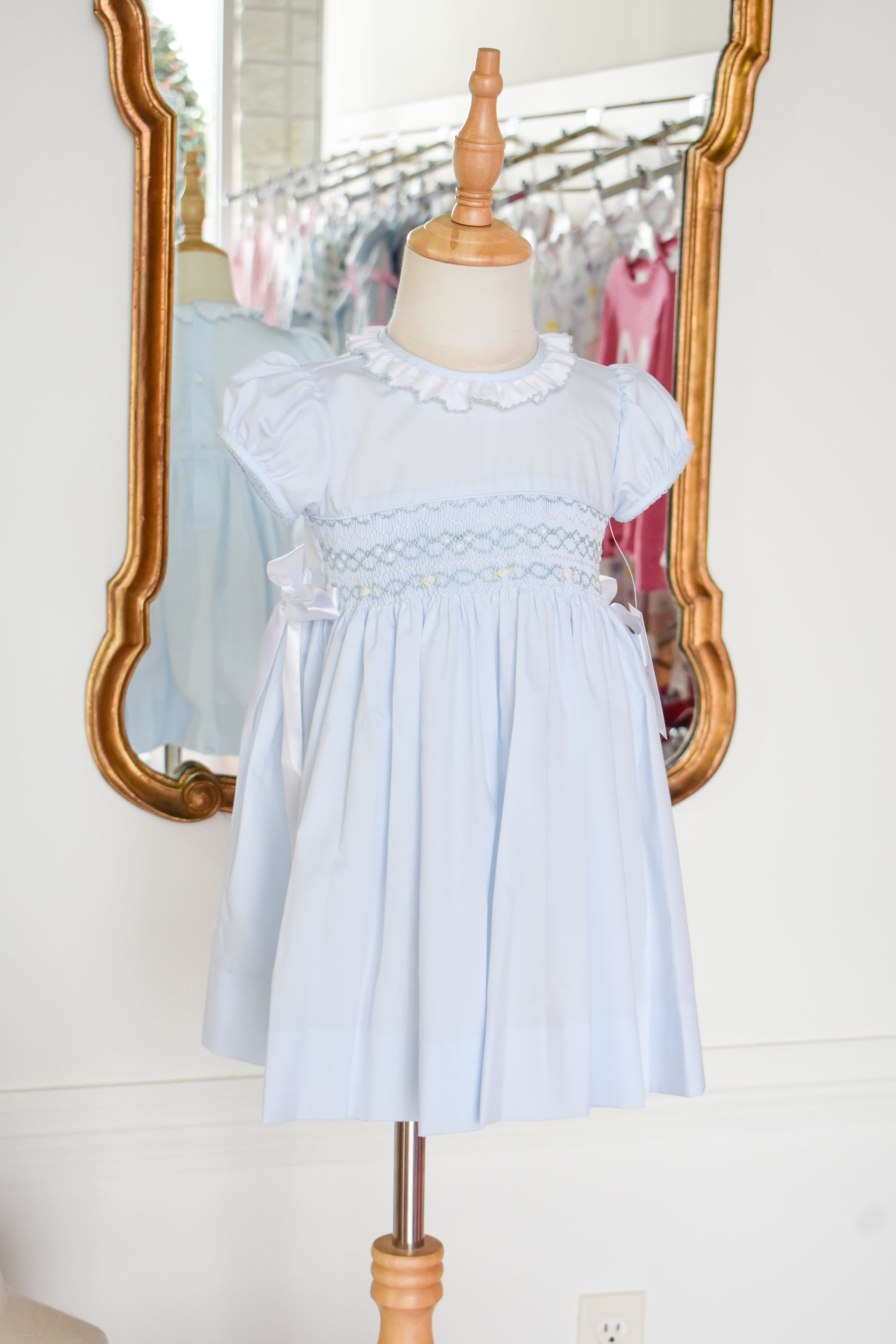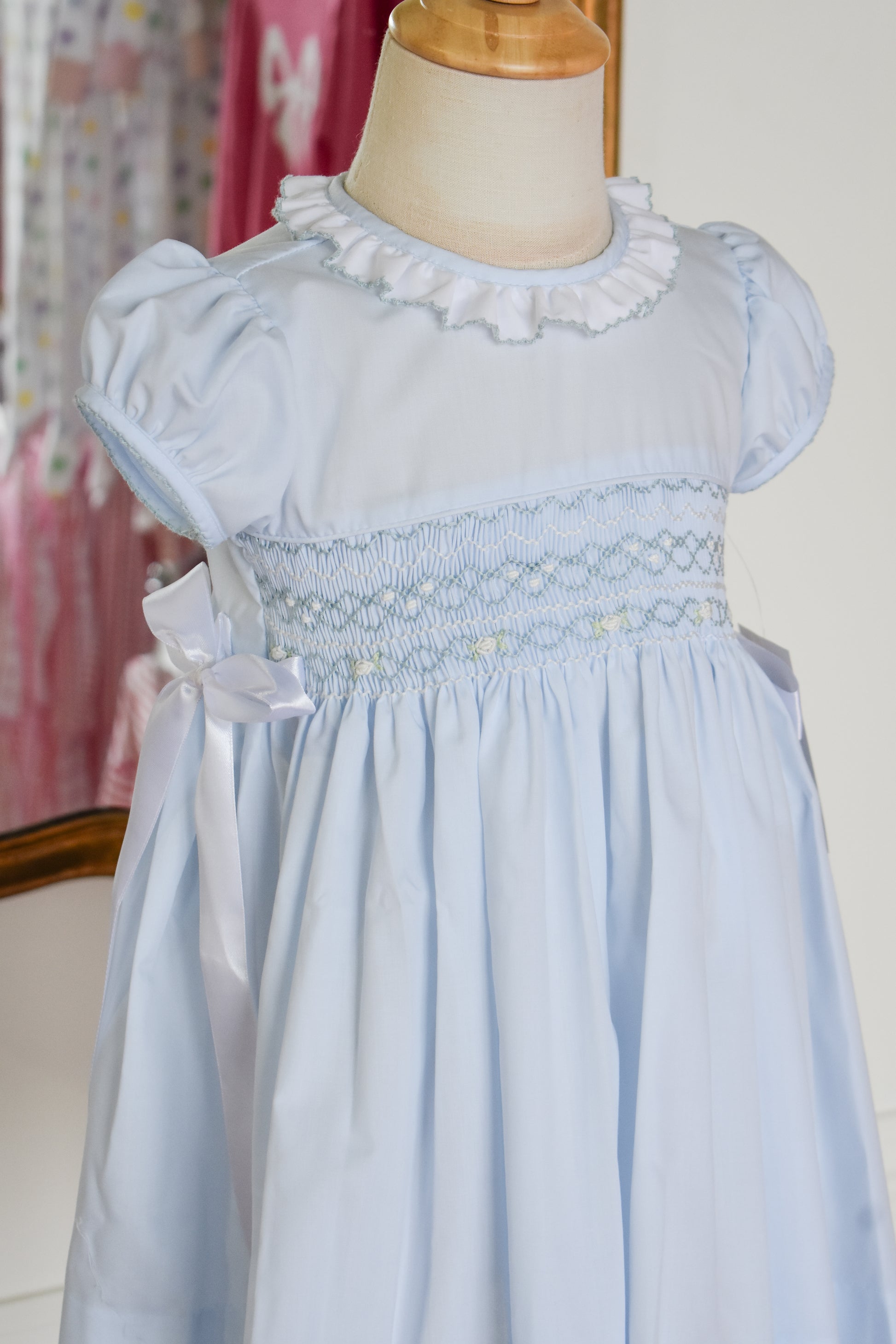This charming heirloom dress captures timeless elegance in a soft pale blue. Delicate smocking adorns the bodice with classic craftsmanship, while graceful silk bows accent the sides for a touch of refined femininity. Perfect for special occasions, portraits, or creating cherished memories, this dress blends vintage-inspired details with modern comfort. A treasured piece designed to be passed down and loved for generations.