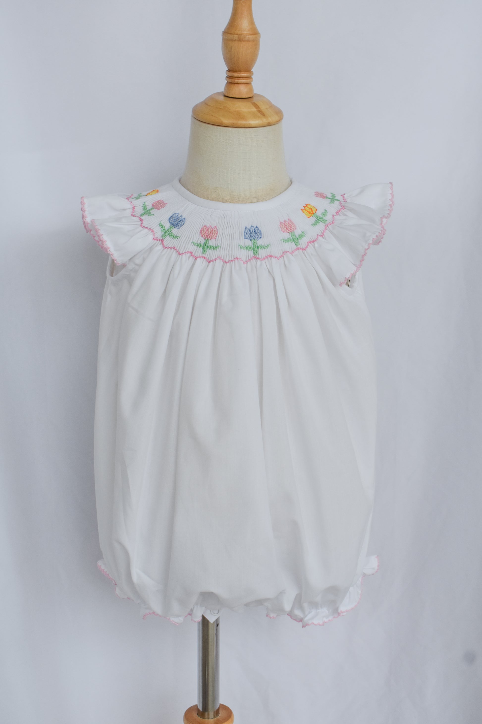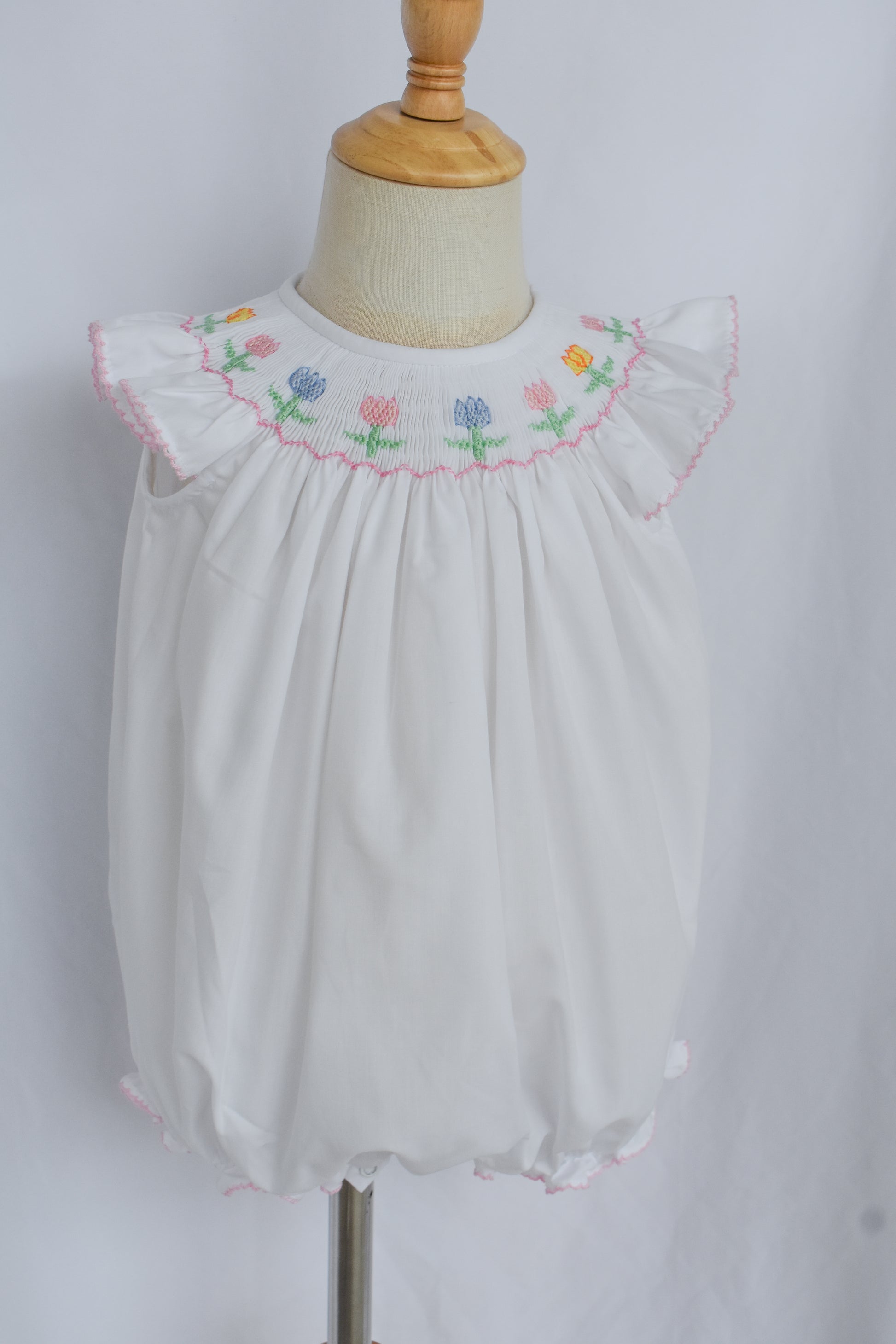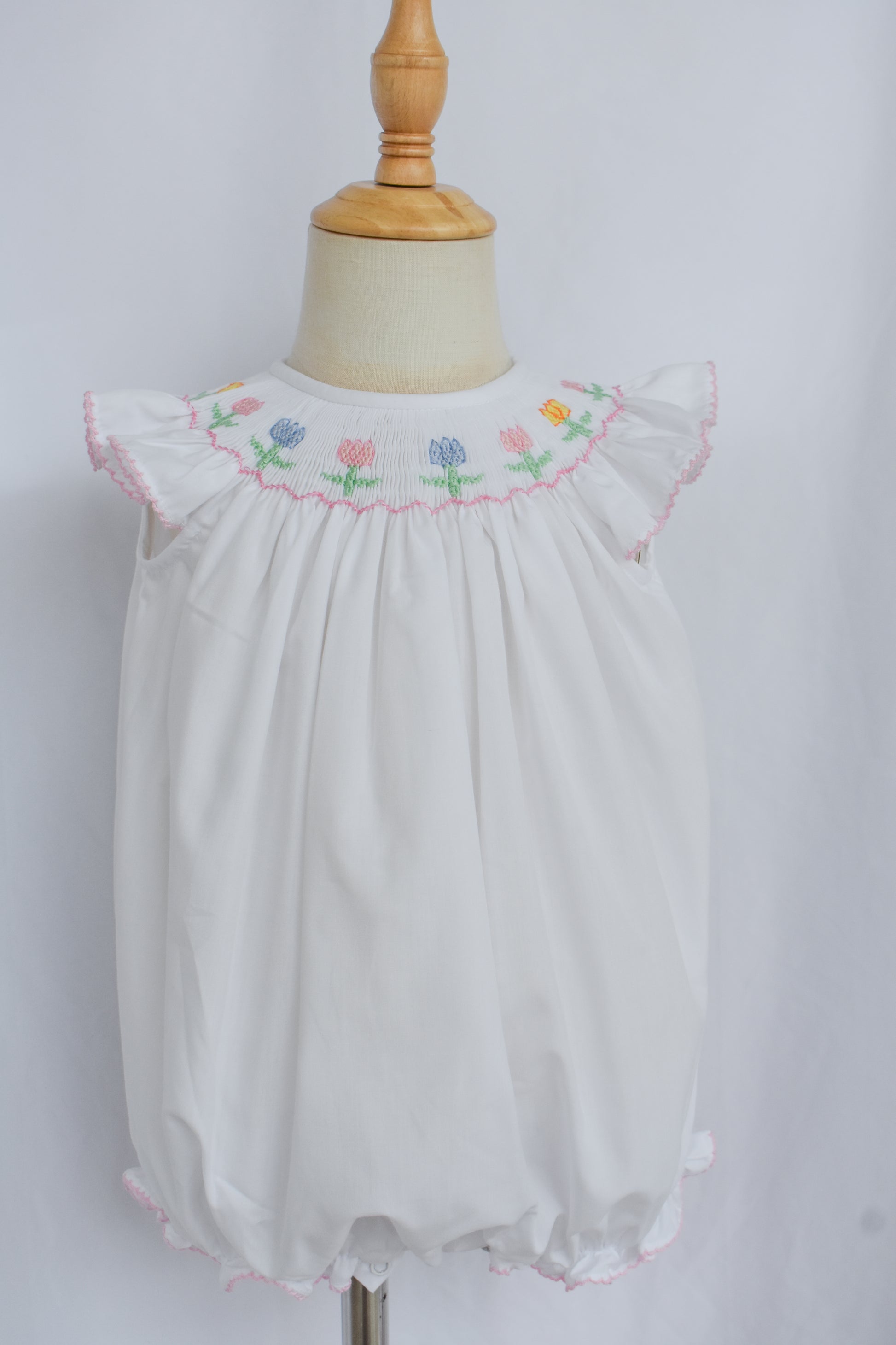 Twirl into spring with this charming bishop romper featuring delicate white fabric adorned with colorful smocked tulip details. Perfect for special occasions or everyday adventures, the classic bishop silhouette offers comfort and timeless style. The vibrant spring florals add a cheerful pop of color that celebrates the season. An enchanting choice for little ones who love pretty details and playful elegance.