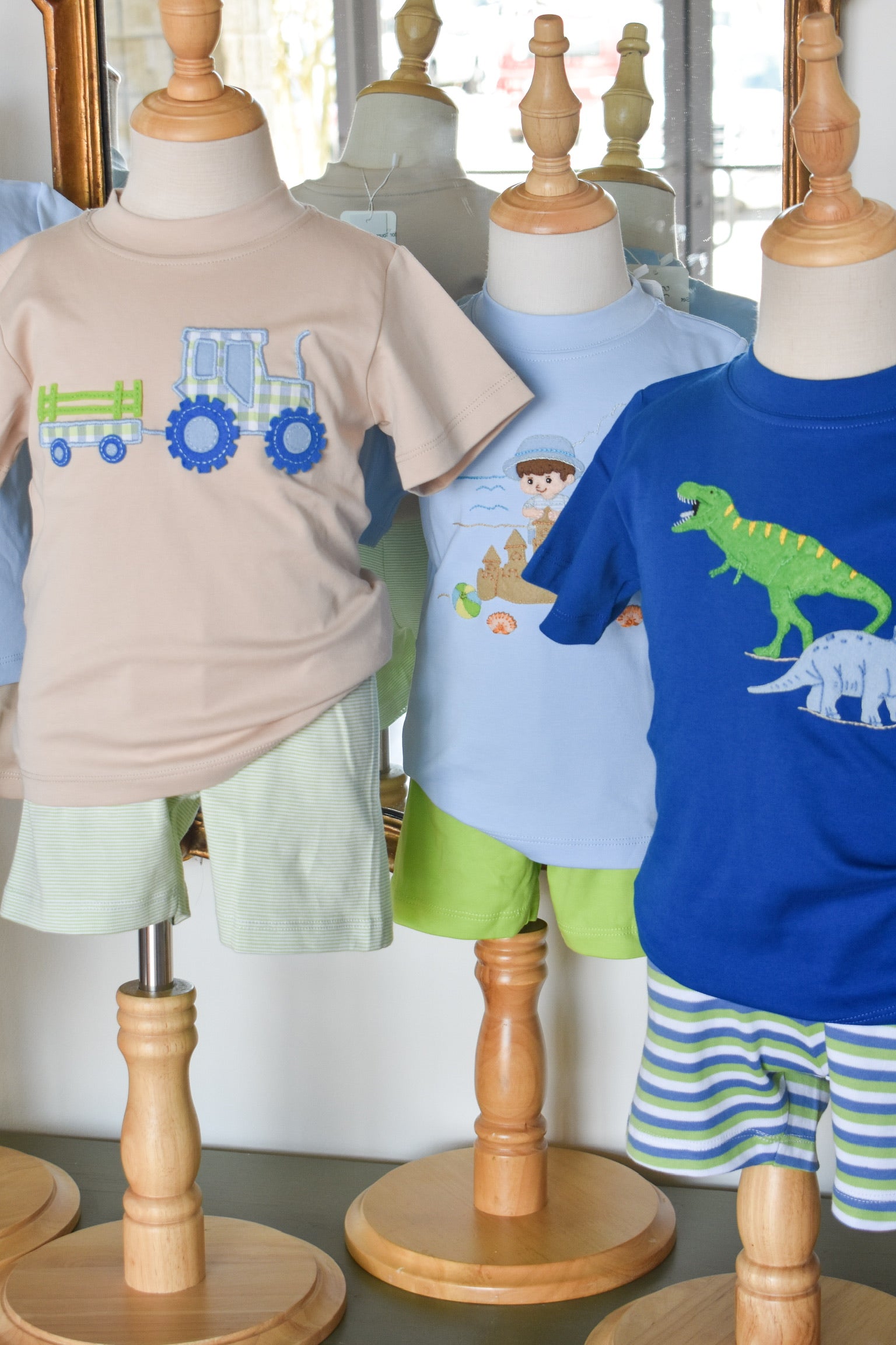 Adorable two-piece set featuring a khaki shirt paired with light green mini stripe shorts. The shirt showcases charming applique embroidered tractor details that bring playful character to this coordinated outfit. Perfect for little ones who love farm-themed style, this set combines comfort with whimsical design. Ideal for everyday wear, playdates, or themed celebrations.