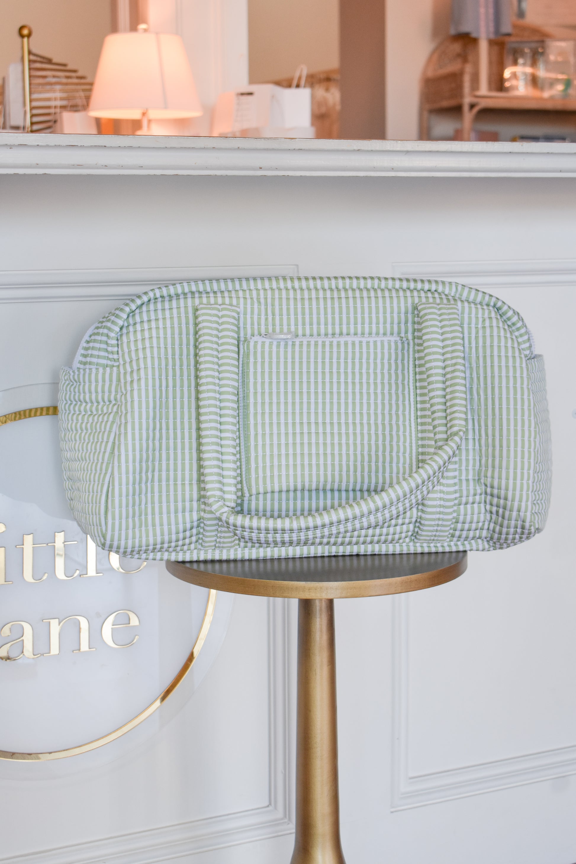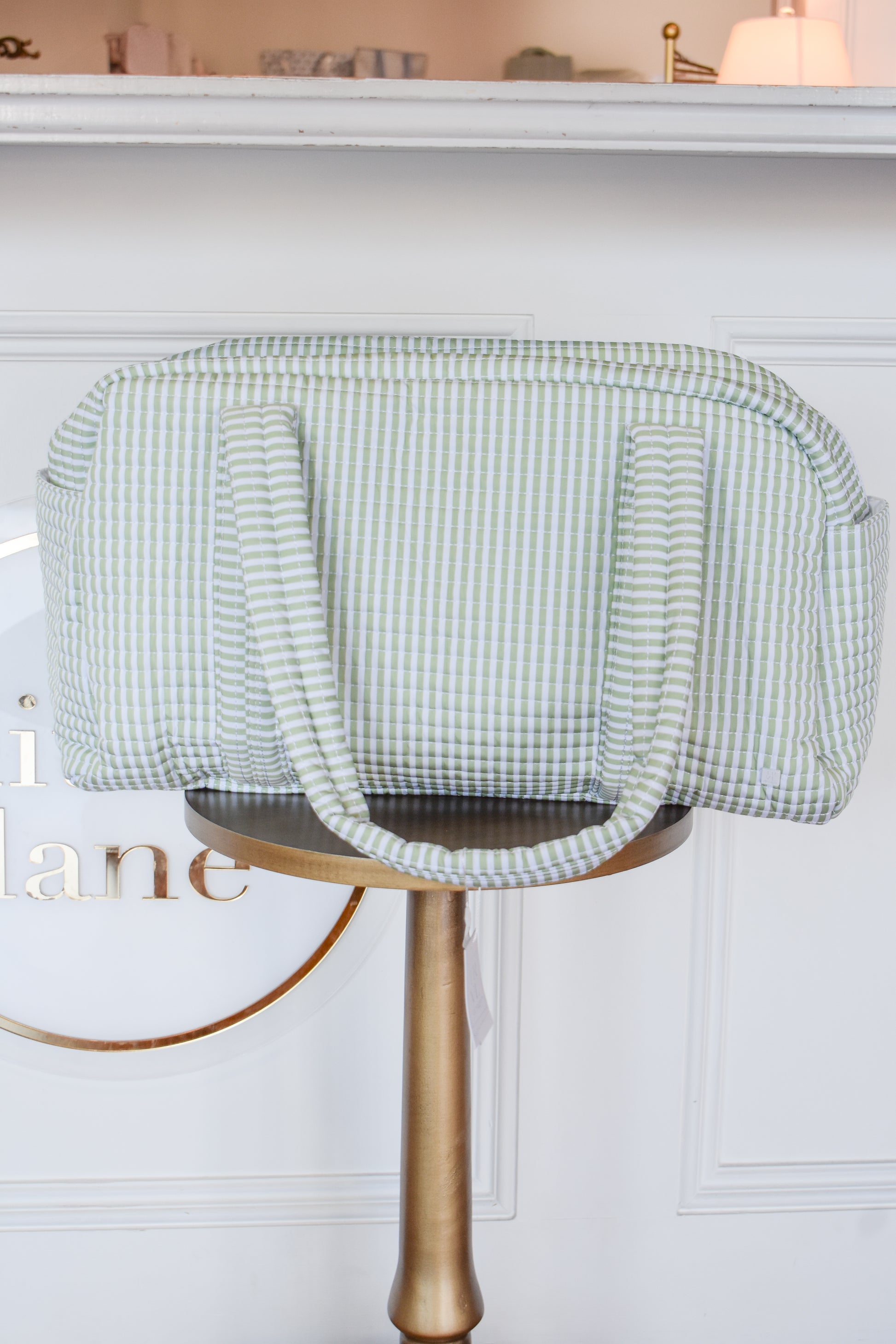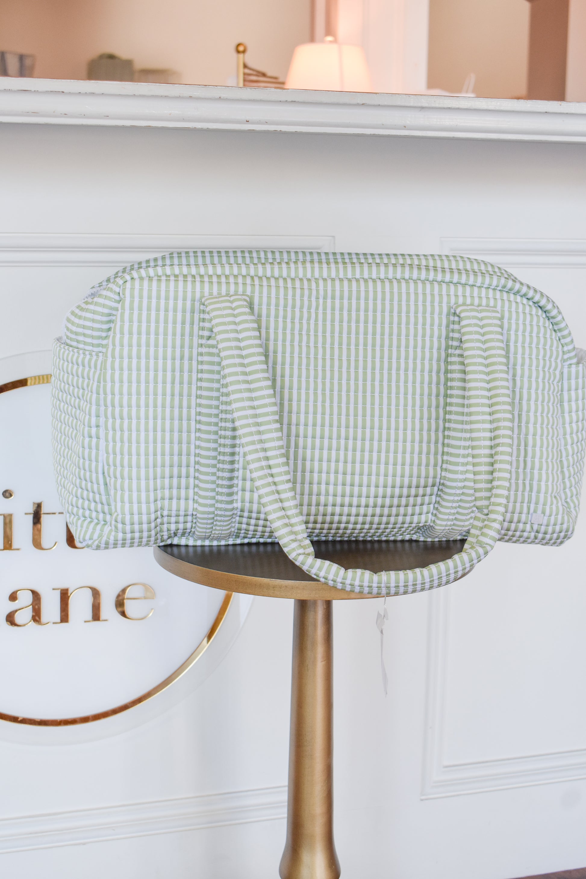 The TRVL Quilted Grande Duffel features a distinctive quilted Pimlico stripe in a sage print, providing both aesthetic appeal and enhanced durability. This design not only reduces wear and tear by offering structural support but also facilitates easy identification in travel settings, making it an optimal choice for organized transport.
