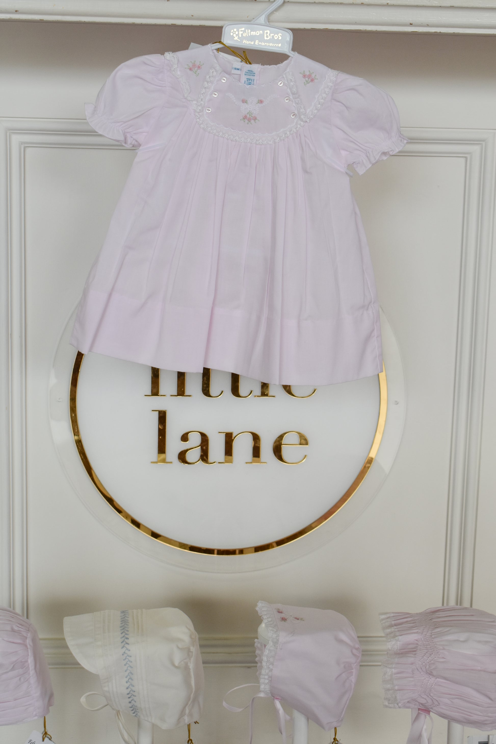This charming vintage dress by Feltman Brothers is a timeless treasure for your little one. Delicately crafted with a detailed front yoke trimmed in fluted lace and scalloped edges, it’s adorned with petite buttons and hand-embroidered bows and flower bullions. Soft pintucks open into gentle pleats, creating a graceful look perfect for holidays, special occasions, or sweet everyday moments with family and friends. A truly heirloom-quality piece that brings elegance and warmth to any gathering.