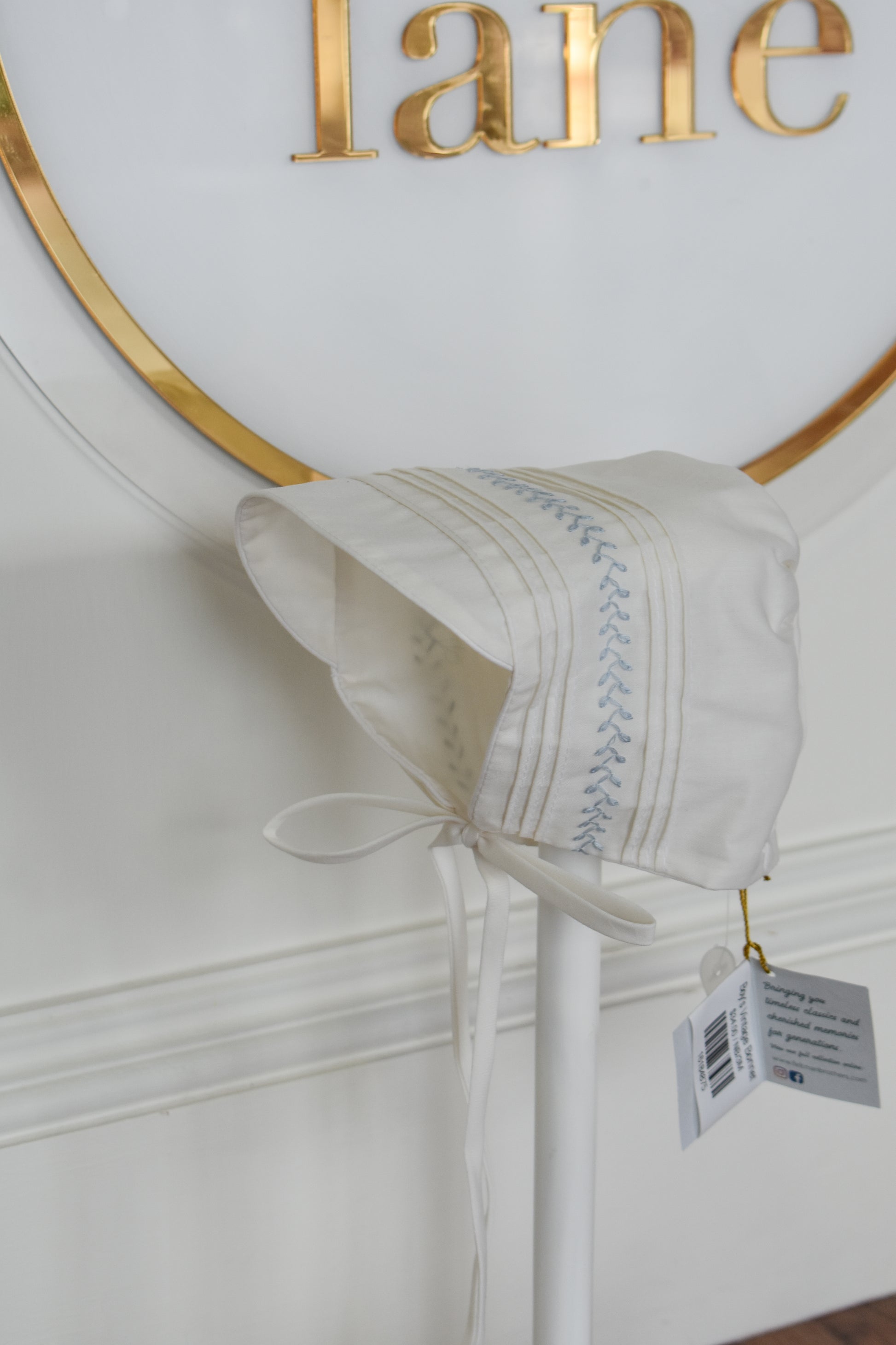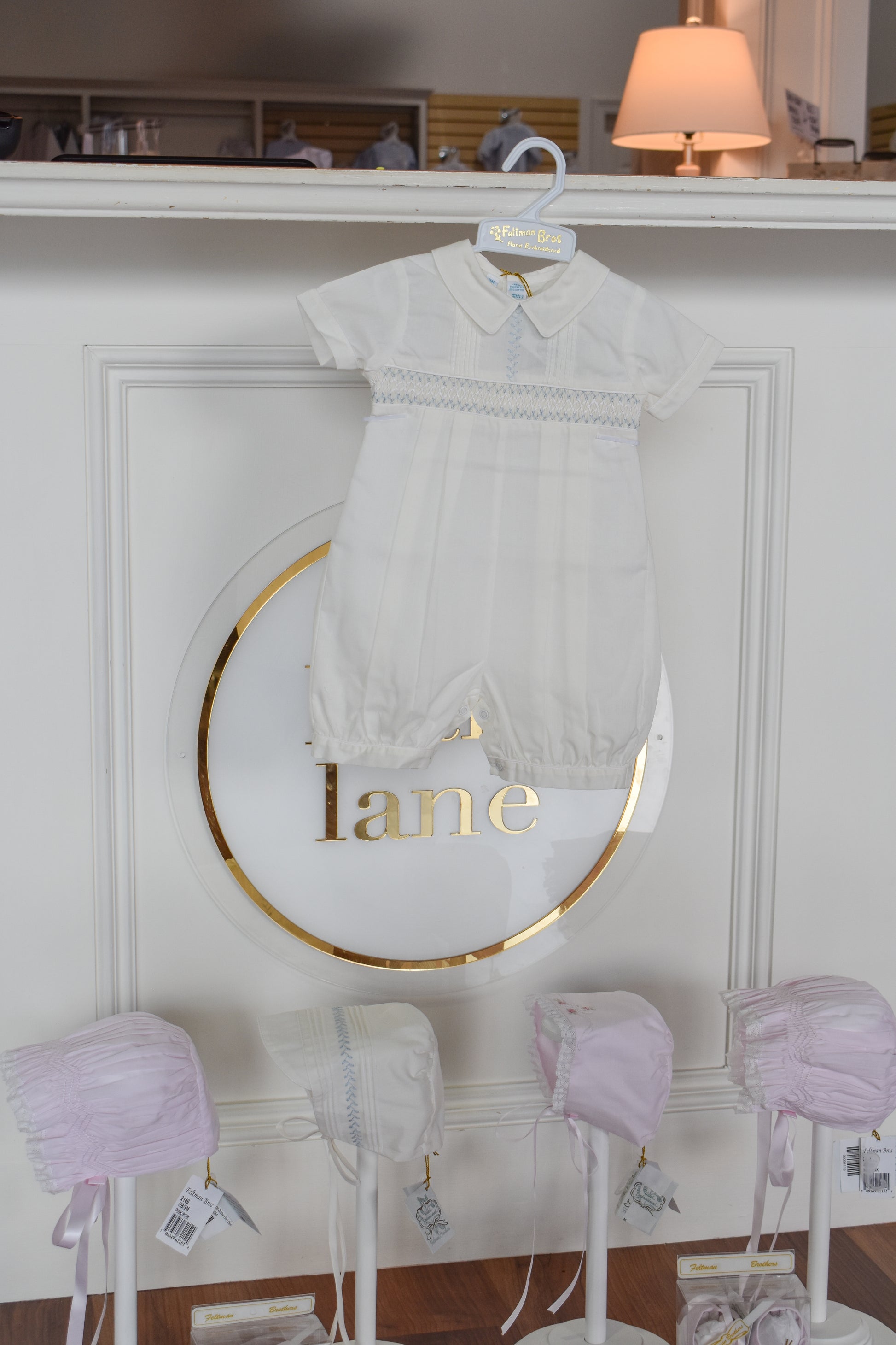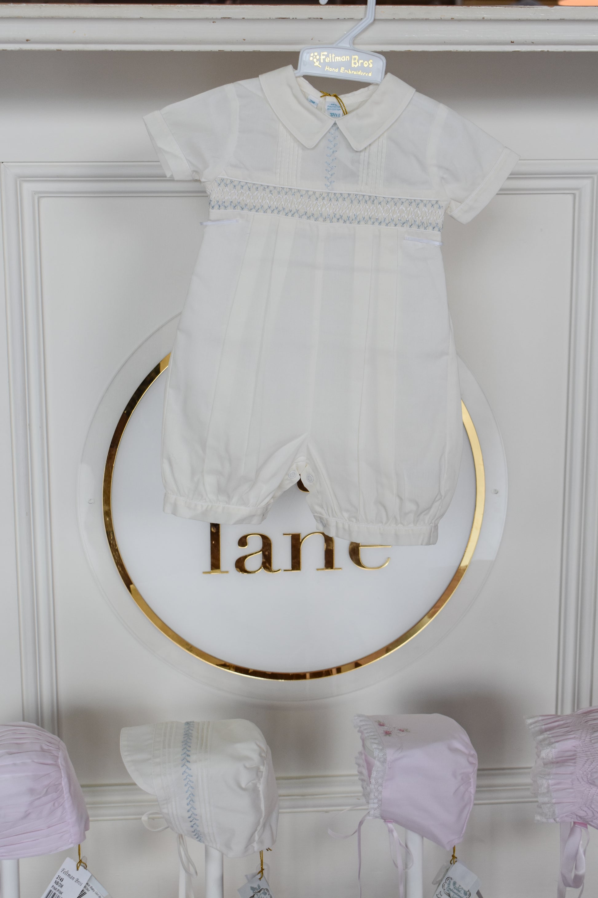 This cream vintage-colored romper features delicate blue embroidery, adding a charming touch to its dressy design. Perfect for special occasions, its soft fabric ensures comfort while the intricate smocking detail gives it a timeless, sweet appeal for your little boy.