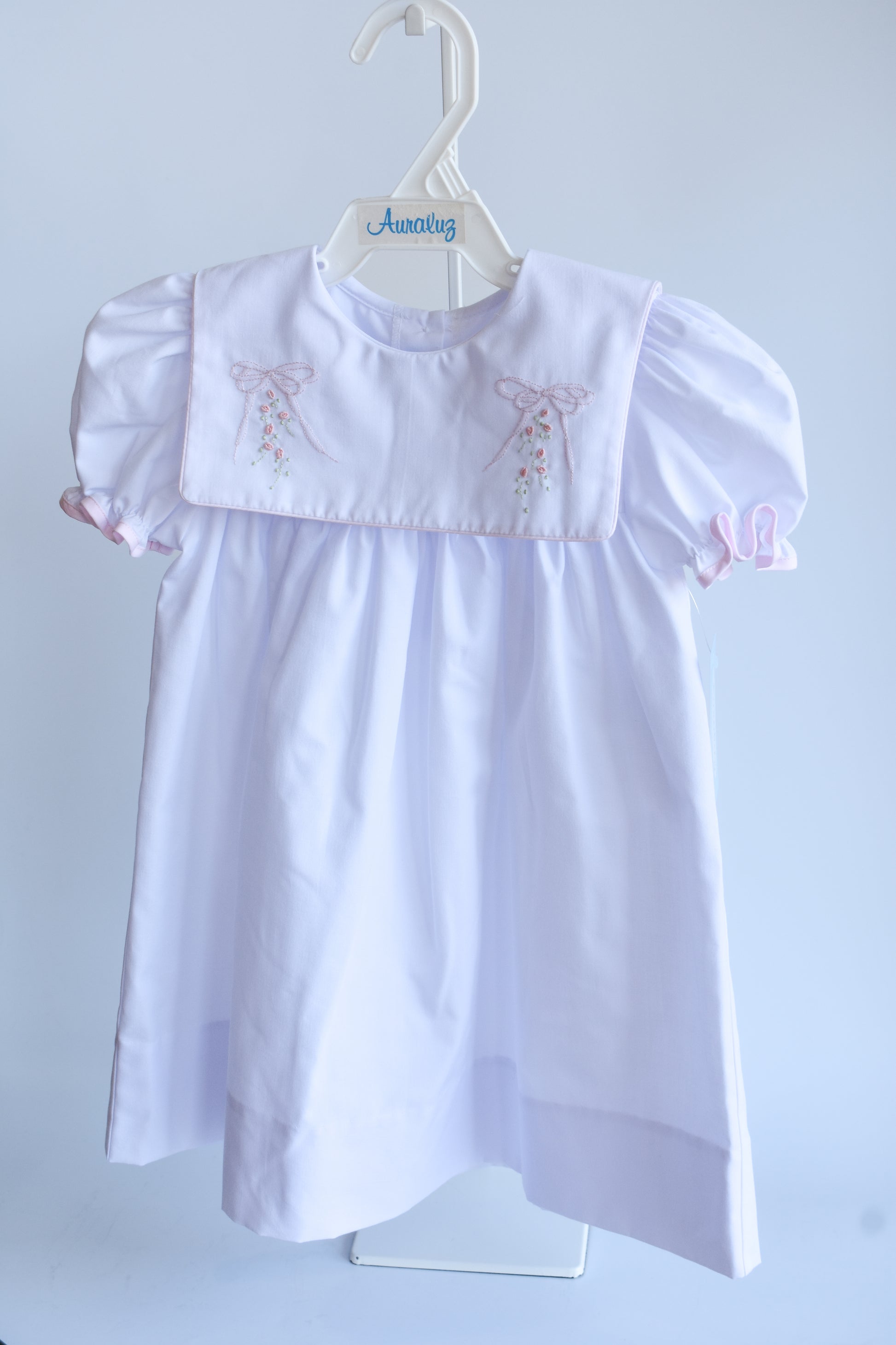 This charming white dress features delicate floral embroidery adorning the collar, adding a touch of botanical elegance to your little one's wardrobe. Soft pink trim frames the dress beautifully, creating a sweet contrast that brings the design to life. Perfect for special occasions or everyday wear, this dress combines classic style with playful details. Watch her twirl and bloom in this whimsical creation.