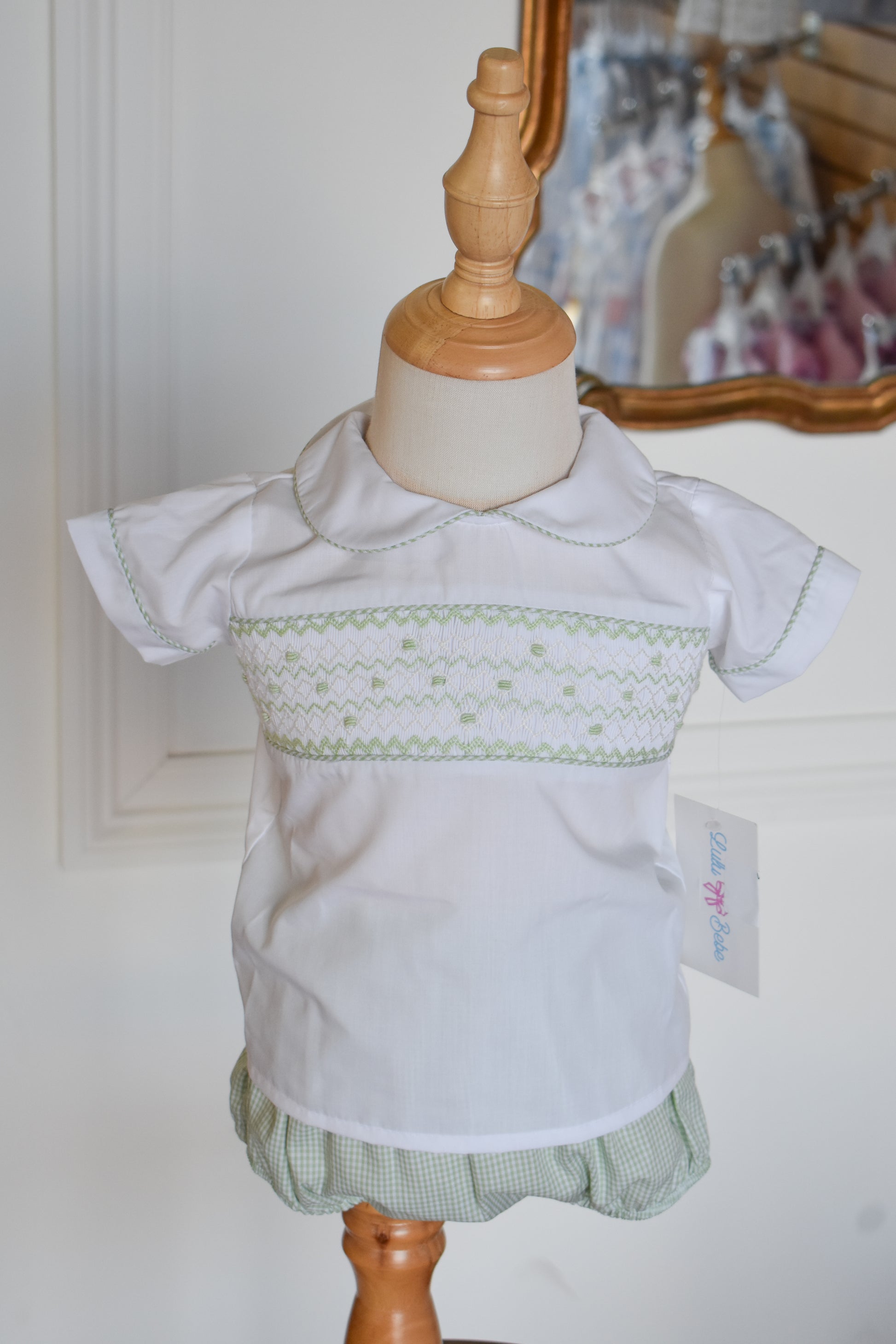 William's charming green smocked set combines timeless style with playful comfort. This two-piece ensemble features delicate smocking details on soft, breathable fabric—perfect for special occasions or everyday wear. The coordinated bloomer bottoms offer gentle gathering at the waist and legs for an adorable, classic look. Ideal for little ones who love to move and play while staying picture-perfect.